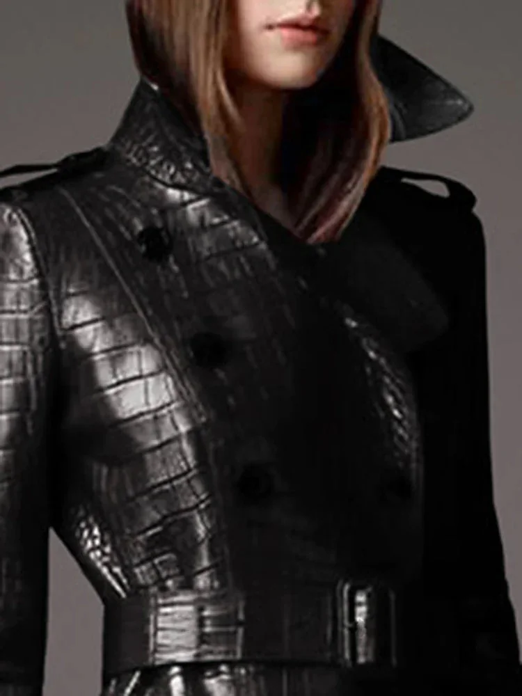 Elevate your style with our Limited Edition Black Crocodile Trench Coat. Crafted from a luxurious blend of Premium Faux Leather and Cotton, this showstopper offers exceptional quality. Embrace sophistication and turn heads with this unique piece in your wardrobe. Explore our Size Chart for the perfect fit. Incredibly comfortable and stylish, this Womens Crocodile Trench Coat is a must-have!