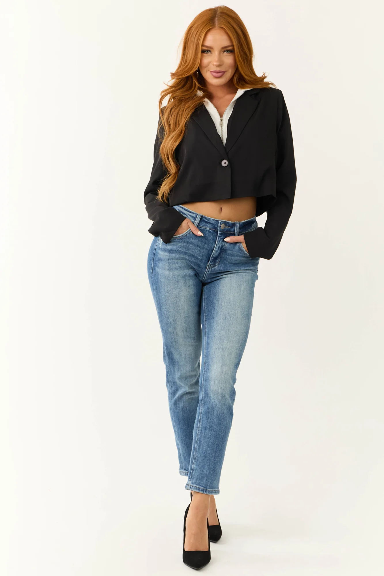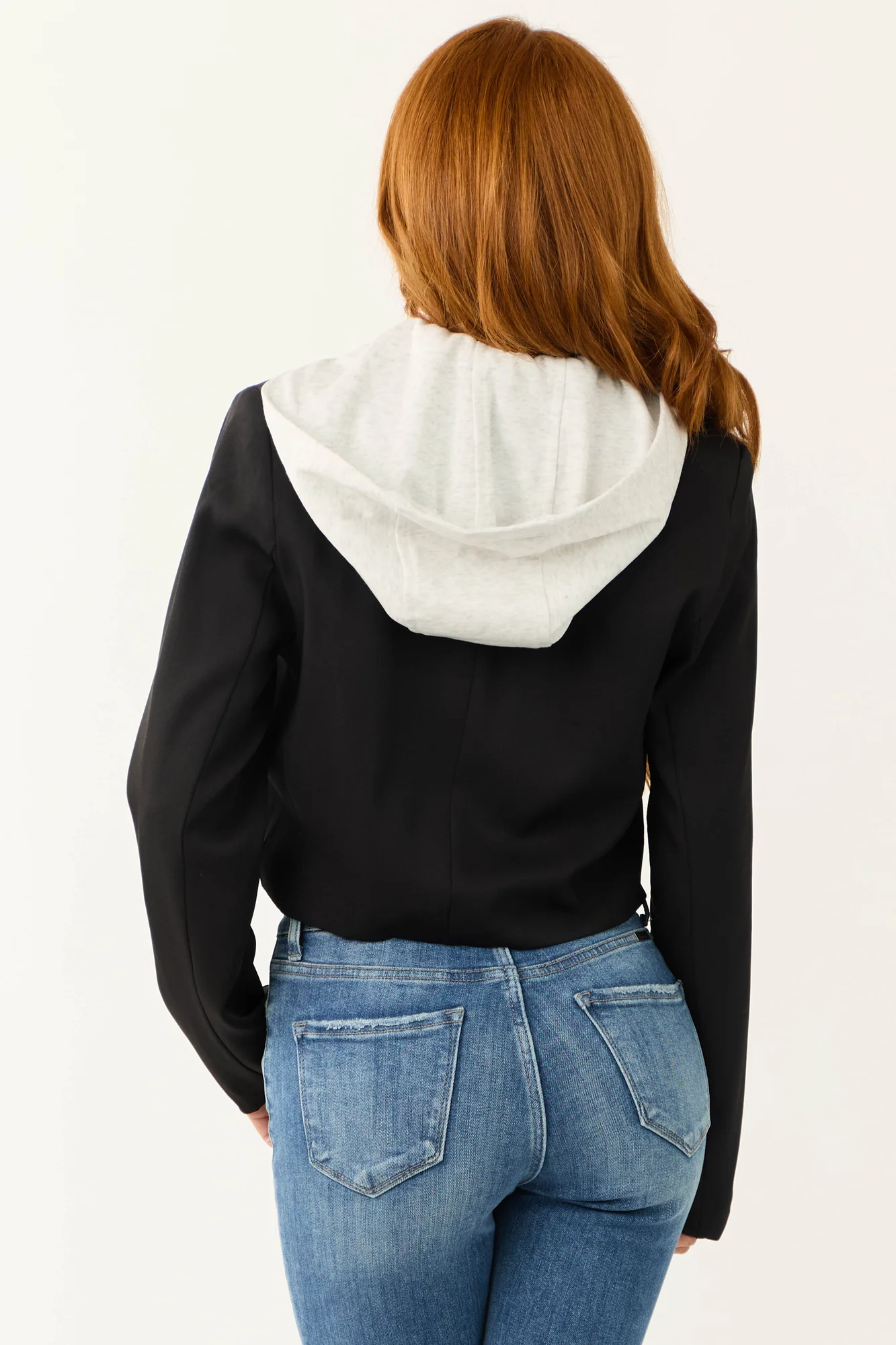 This stylish outerwear piece features a non-stretchy woven Cropped Blazer and a Stretchy ribbed Contrast Hoodie in a trendy shade of Cloud Grey. It boasts a single button front, long sleeves, a collared design, slight cropped length, shoulder pads, and a soft lining for added comfort. Made with high-quality materials, this blazer-hoodie combo is perfect for work or casual outings. Hand wash with cold water separately to maintain its color and quality. Available in sizes S, M, and L. Model is 55″ tall, wearing a size Small. Get yours today!