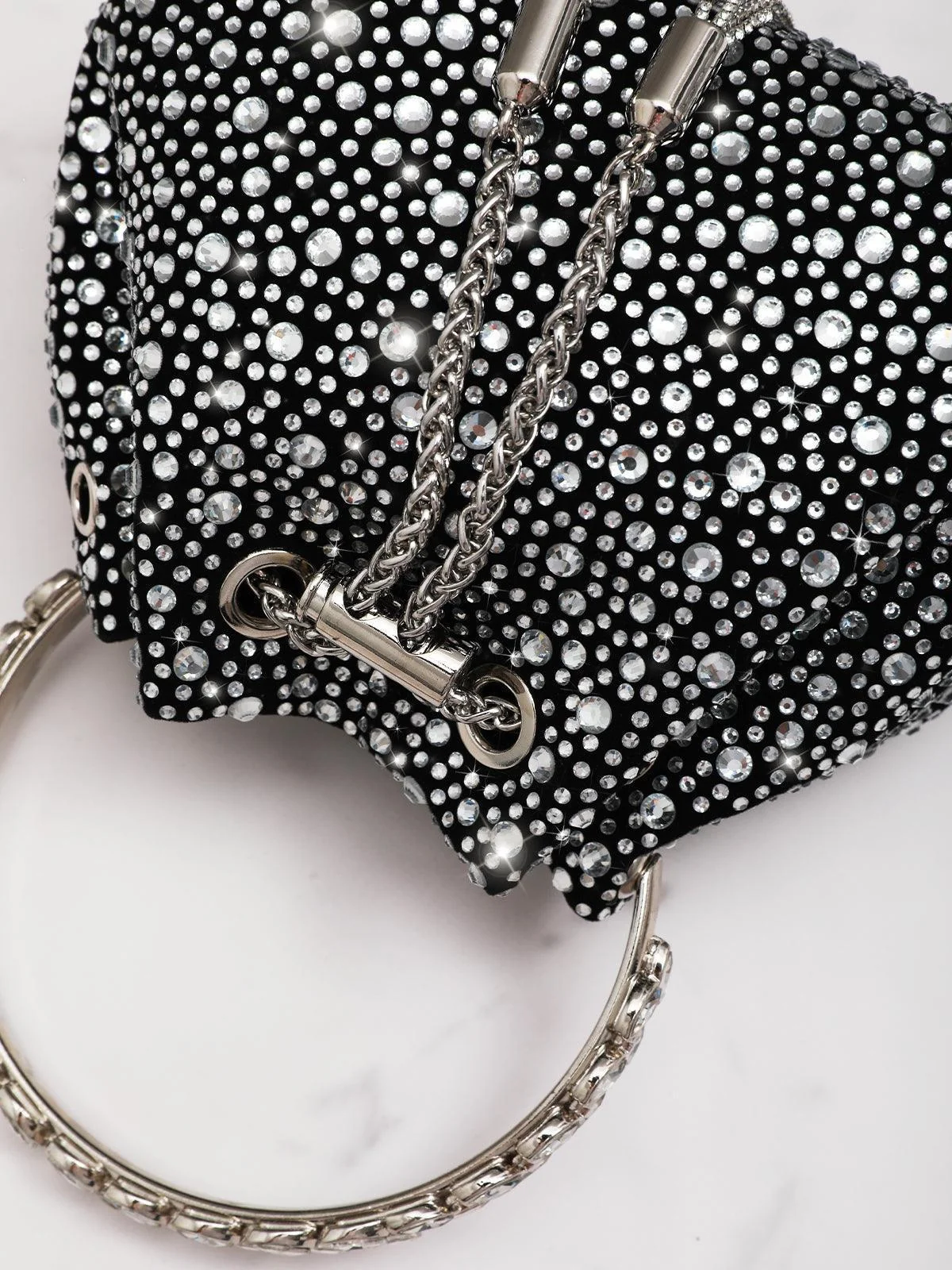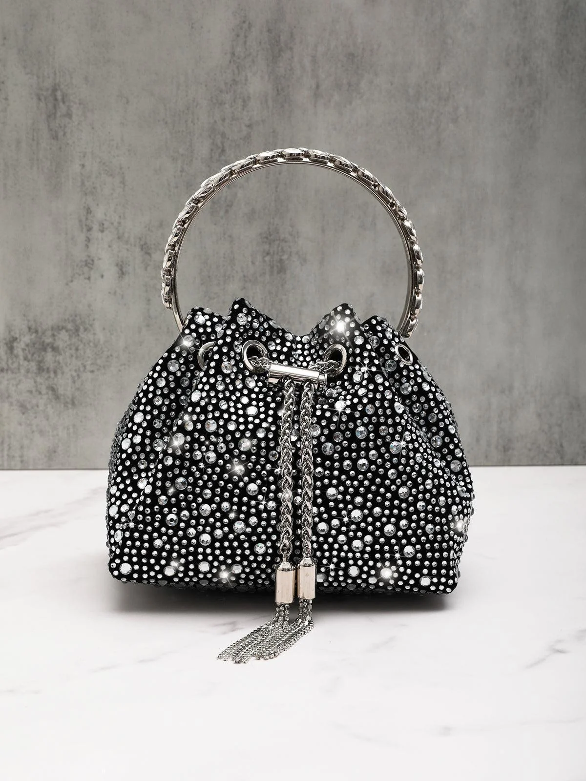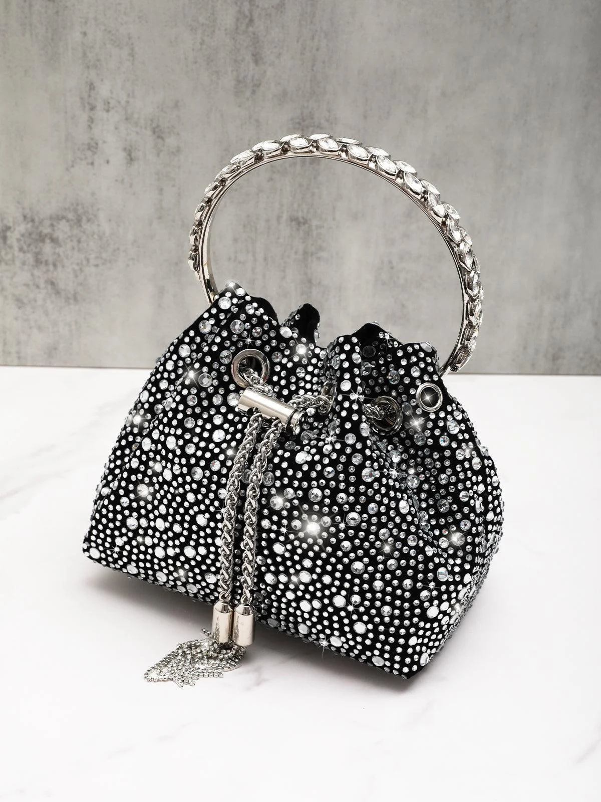 Discover elegance with our Mattea Crystal Embellished Black Bucket Bag. This stunning accessory, made from high-quality crystal, features a dazzling top handle and a chic drawstring chain for a modern touch. Versatile and stylish, this bag is a must-have addition to your collection. Crafted with care and attention to detail, this bag is designed to elevate any outfit effortlessly. The supple shape and convenient dimensions of approximately 6.3 inches in diameter make it perfect for everyday use or special occasions.