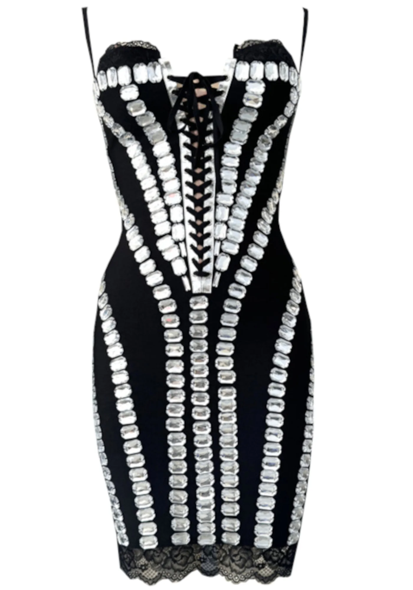 Make a statement with this stunning Black Crystal Lace-Up Corset Mini Dress. Featuring a V-neck with lace and mesh inserts, adjustable spaghetti straps, and embellished with crystals, this above-the-knee dress is made of high-quality, anti-wrinkle fabric for a perfect fit. Carefully crafted for durability and style, this dress is a must-have for your wardrobe. Follow the care instructions provided to keep it looking its best.