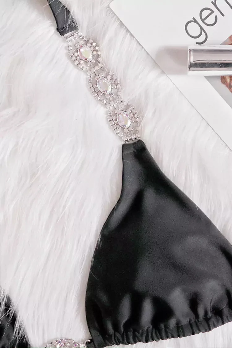 Indulge in the elegance of the Black Crystal Triangle Bikini Set, a stunning swimwear piece that combines comfort and style effortlessly. Made from a blend of 80% nylon and 20% polyester fiber for a slight stretch, this bikini features exquisite crystal embellishments that exude sophistication. The adjustable triangle top, shoulder straps, and tie-back offer a customized fit, while diamond-shaped crystal bands on the briefs accentuate your curves beautifully. Whether lounging by the pool or enjoying a beach day, this bikini is a must-have addition to your wardrobe. Care Instructions: Machine wash or hand wash for best results. Model height: 5 ft 8 in, wearing size S. Please note that colors may vary due to lighting. The actual product color is closest to the images without a model. The item fits true to size chart and is tailored to match our measurements. Please consult our sizing guide for optimal fit. Avoid sizing up or down for the best experience.