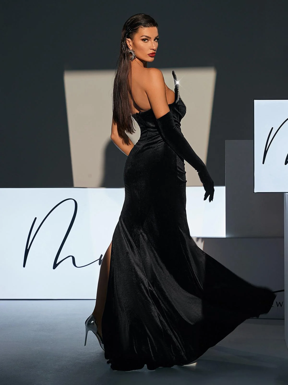 Elevate your style with this luxurious Black Crystal Velvet Strapless Maxi Dress from Lu Yili. The stunning strapless wave design, embellished with sparkling crystals, complements the form-fitting silhouette that flatters your figure. Made of 100% Polyester, it offers all-night comfort with slight stretch. This elegant piece features an invisible zipper opening at the back for easy wear. Dry clean only. Color may vary. Includes one glove.