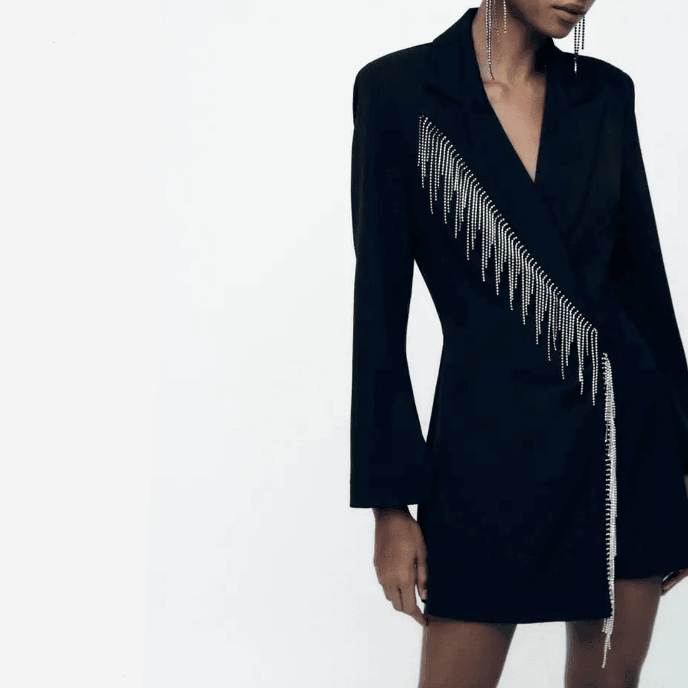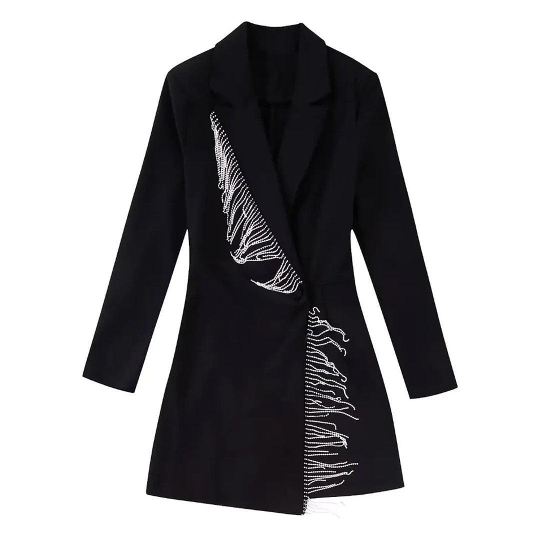 Elevate your style with our Black Crystalline Tassel Jumpsuit. This captivating jumpsuit is embellished with shimmering crystals and playful tassels that glisten elegantly with every step. The figure-flattering silhouette and attention-grabbing details ensure you steal the spotlight effortlessly. Whether youre attending a special event or a chic night out, this versatile piece is a bold fashion statement. Transition seamlessly from one occasion to the next in this must-have wardrobe staple. Crafted from woven polyester with a high stretch factor for comfort and style. Embrace glamour and dazzle in the Black Crystalline Tassel Jumpsuit! Discover more fashion inspiration on our Instagram @mermaid_way.