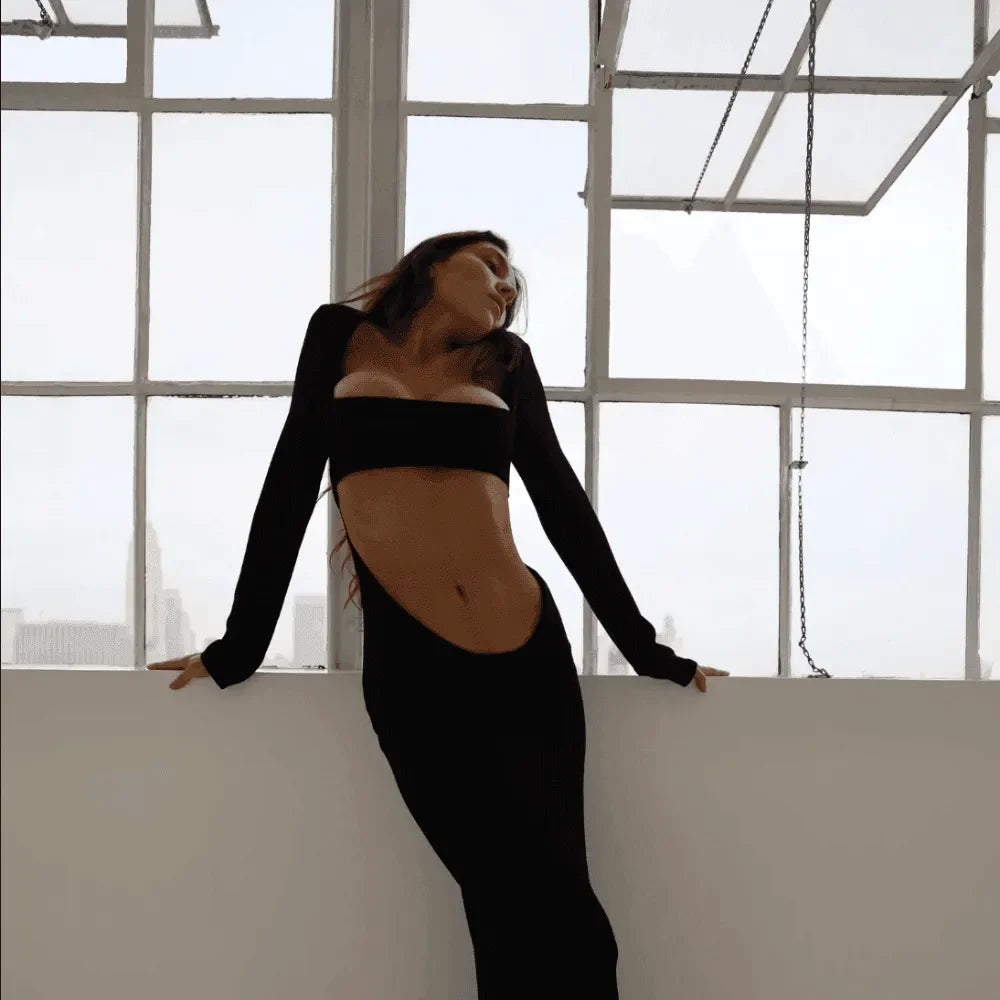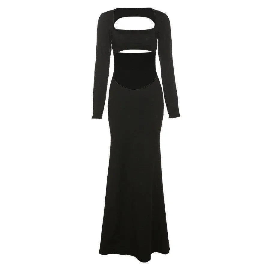 Indulge in elegance with the Black Cut-Out Long Sleeve Maxi Dress. This exquisite dress boasts striking cut-out accents and a daring high slit, blending sophistication with allure. Meticulously crafted from premium fabric, it ensures both comfort and style for any formal occasion. The fitted bodice and flowing skirt of this dress beautifully accentuate your figure, perfect for making a statement at evening events. Its versatile design enables effortless accessorizing, elevating its appeal as a wardrobe essential. Discover timeless fashion with this chic dress that guarantees to leave a lasting impression. Experience a bodycon fit with features including a squared neckline, waist cut out, open back, and long sleeves for a truly captivating look. Maximize your style effortlessly with this stunning piece. For outfit inspiration, check out our Instagram @mermaid_way. 92% Polyester, 8% Elastane. Experience unmatched elegance today!