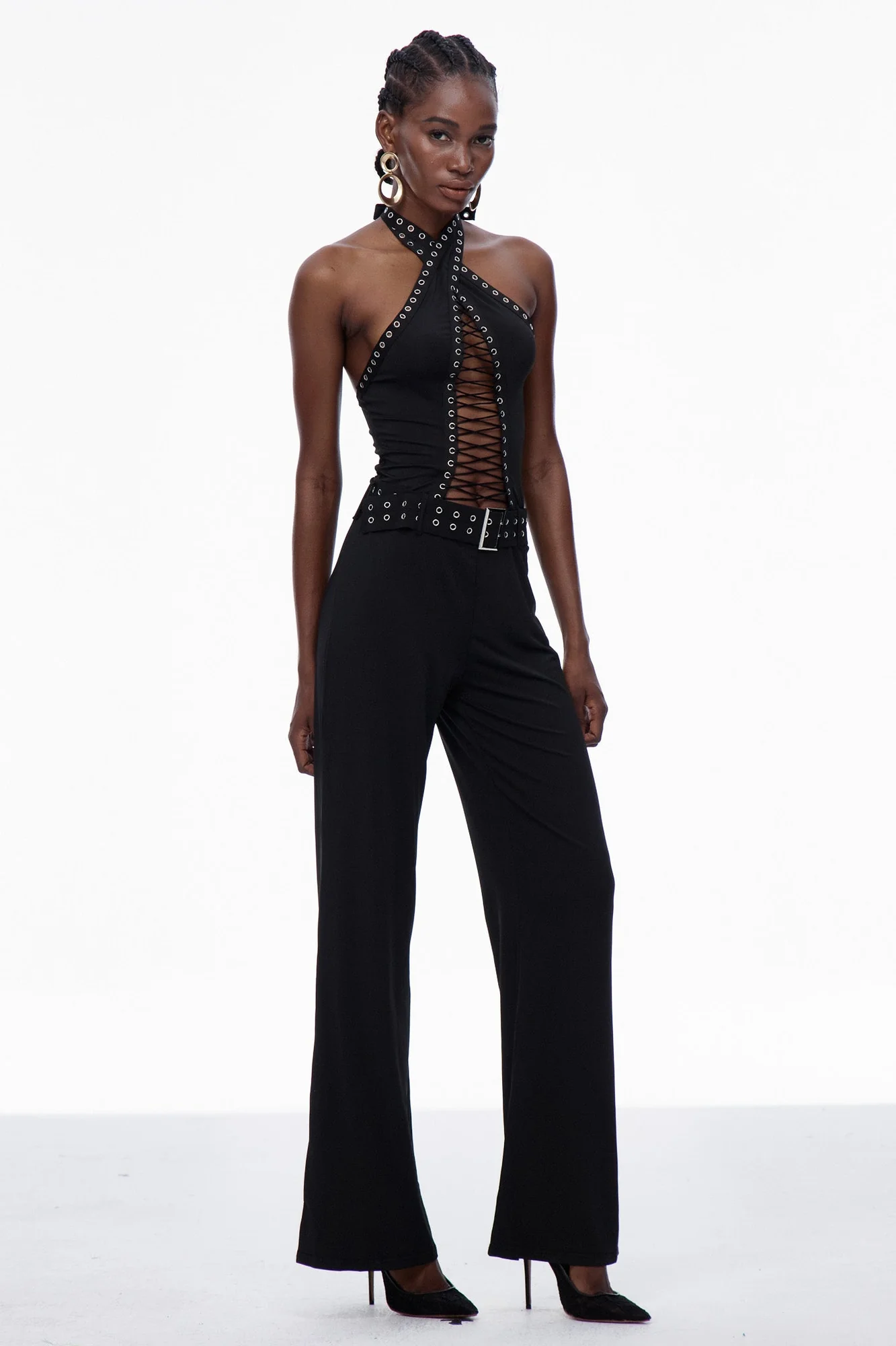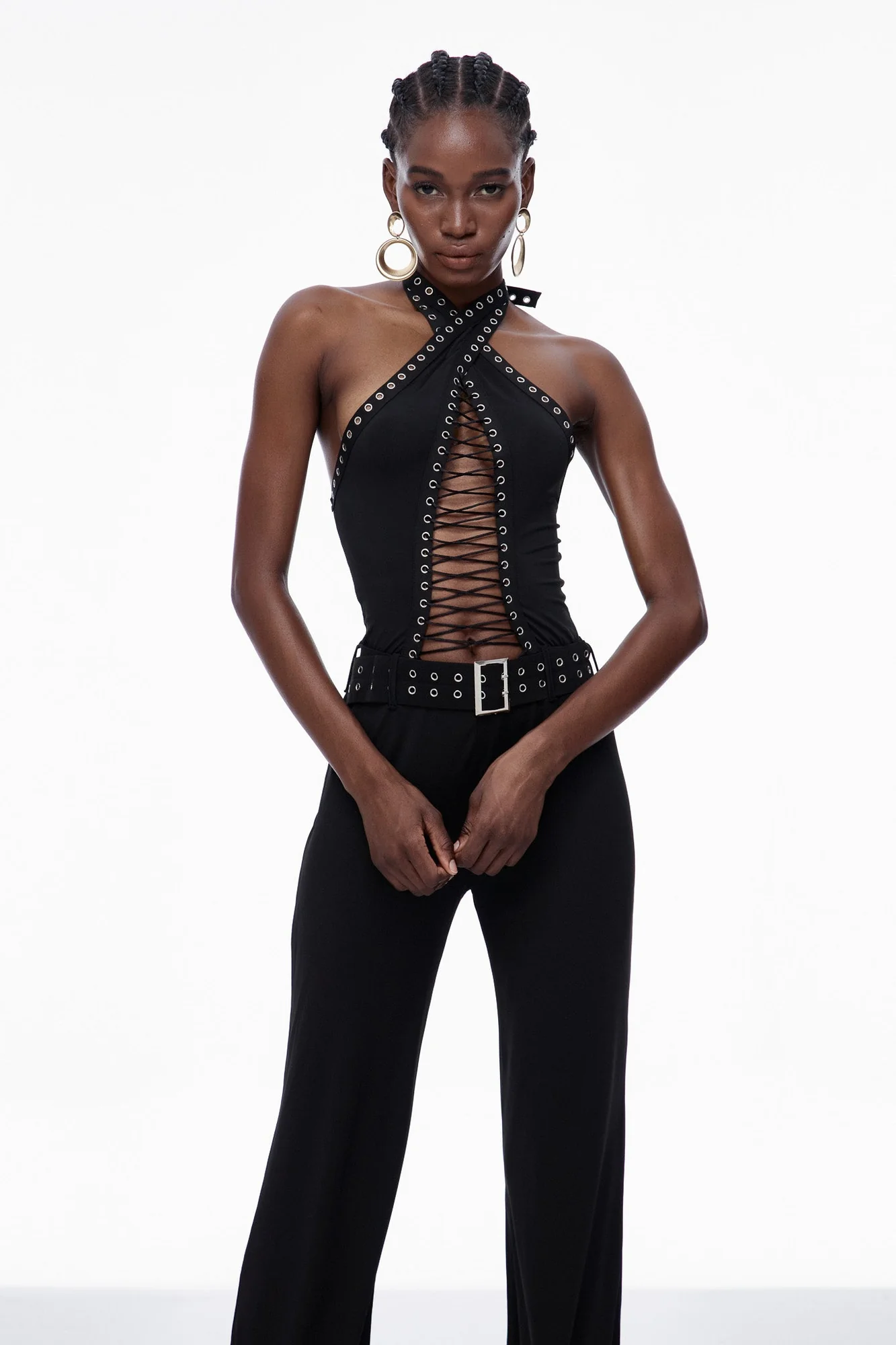Elevate your wardrobe with the Black Cutout Lace-Up Jumpsuit with Embellishments, expertly designed to combine bold style and sophisticated detailing. This jumpsuit features intricate lace-up accents, strategically placed cutouts, and embellishments that enhance its unique appeal. Perfect for standout occasions, it offers a flattering silhouette with an edgy elegance that exudes confidence. Crafted for those who appreciate meticulous design and contemporary flair. The non-stretch fabric ensures comfort, and it can be gently machine washed. Note: Color may vary due to lighting in images.