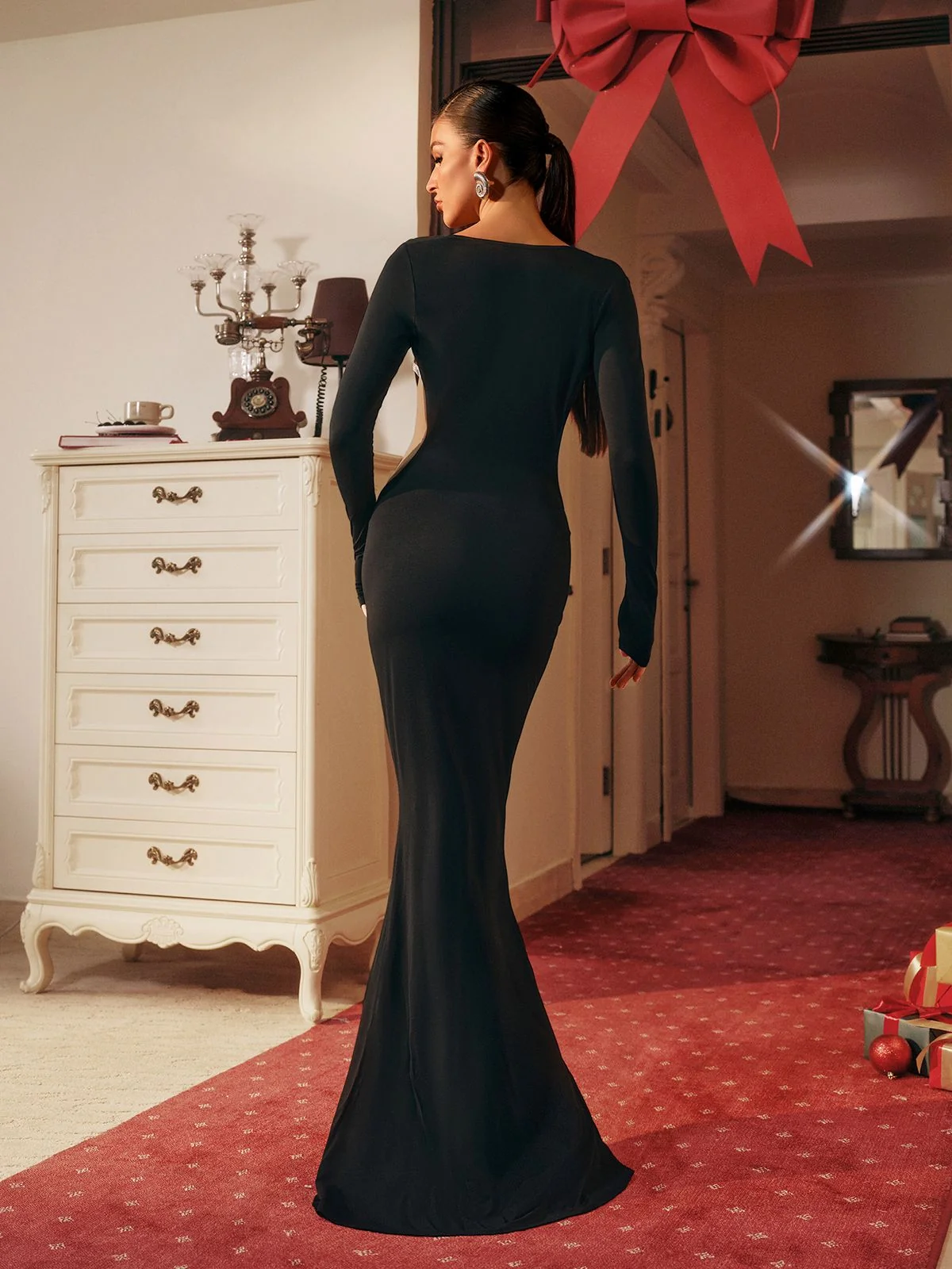 Elevate your style with our stunning Black Cutout Long Sleeve Maxi Dress. This chic dress features a unique cutout design and flowy silhouette, perfect for standing out at any occasion. Stay comfortable and confident all day in this must-have polyester dress with a slight stretch. Make a statement without the armor top. Color variations may occur due to lighting. Model wears size S. Gentle machine wash recommended.
