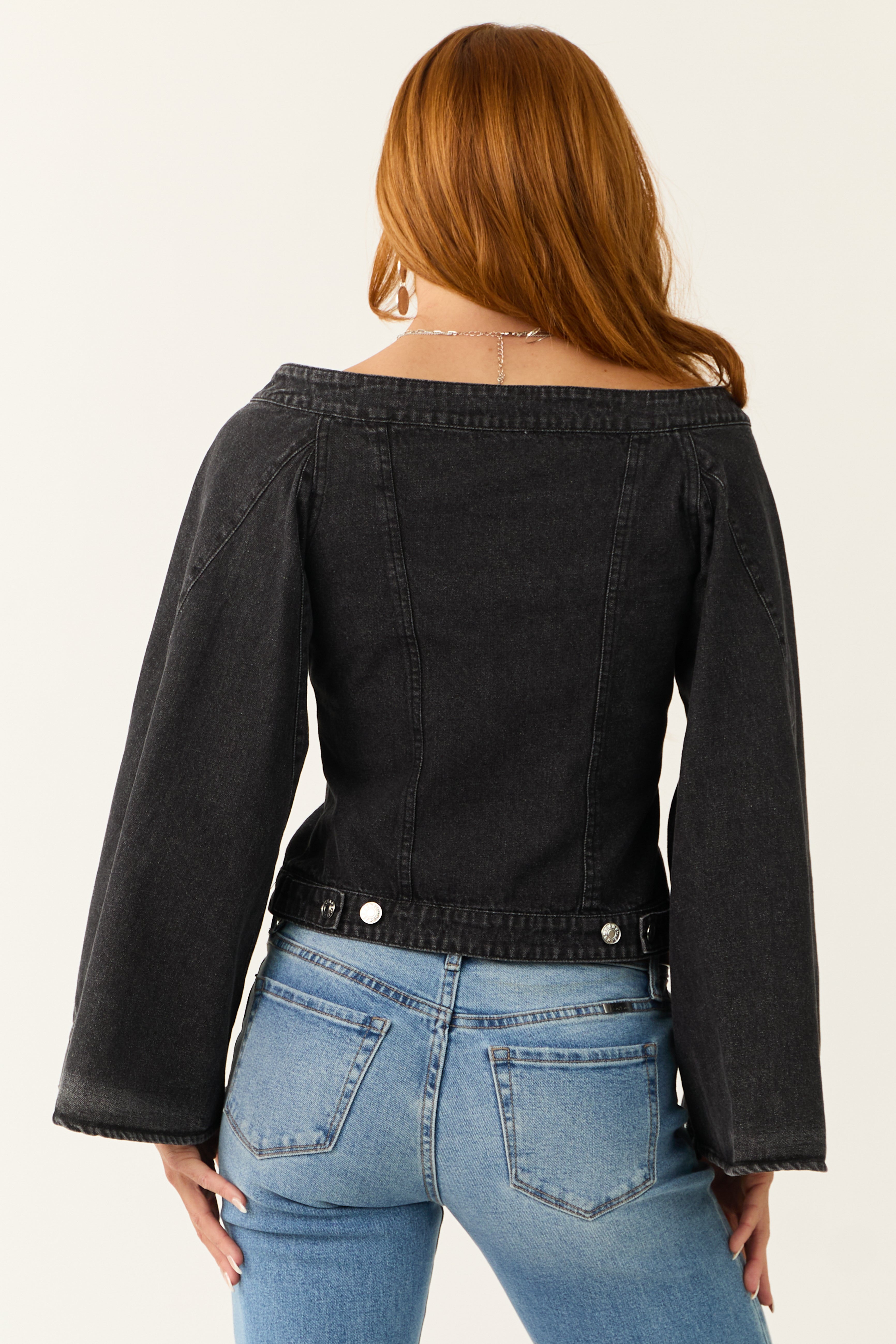 Elevate your style with this Black Denim Button-Down Jacket featuring long sleeves with banded button cuffs and a unique flare sleeve design. Crafted from non-stretchy denim, this jacket offers a chic cropped length with chest pockets, adjustable button straps, and a versatile look. Hand wash cold for maintenance. Each item is unique due to the dying and washing process. Model is 55″ and wears a size Small. Bust sizes: S(35″), M(37″), L(39″).