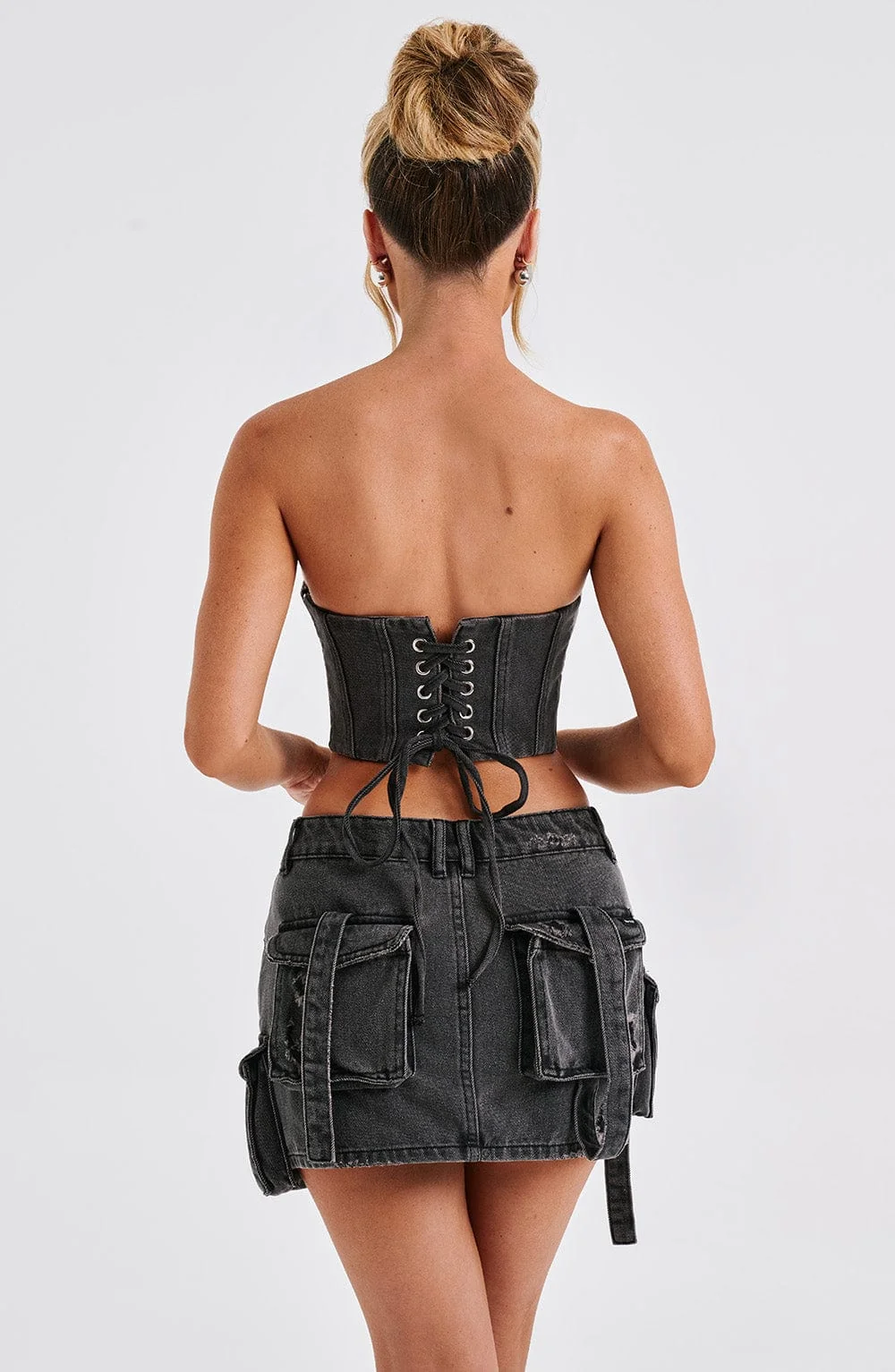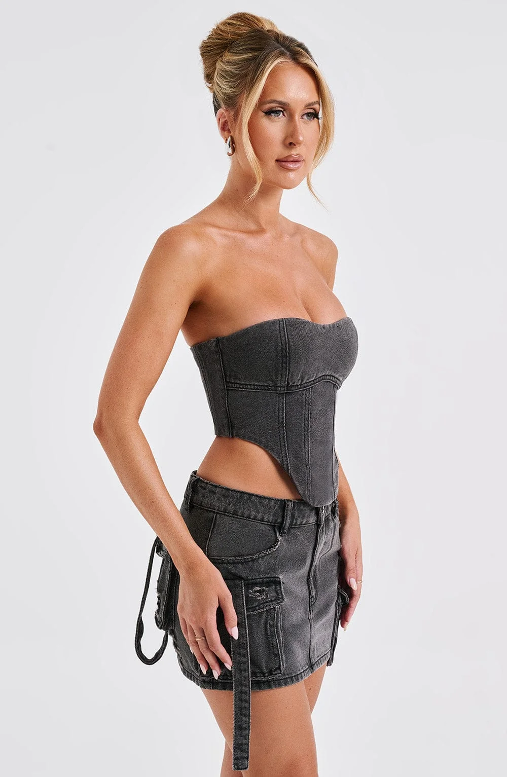 Upgrade your wardrobe with the Yasie black denim corset top from the Ember Collection. Expertly crafted in a strapless design with a cropped length, this corset offers a flattering cinched fit. Made from high-quality denim fabric for durability and style. Perfect for daytime events, festivals, and holiday gatherings. Explore the essence of monochrome fashion with this versatile piece that pairs beautifully with your favorite bottoms. Add a touch of elegance to your outfit with the Yasie corset top.