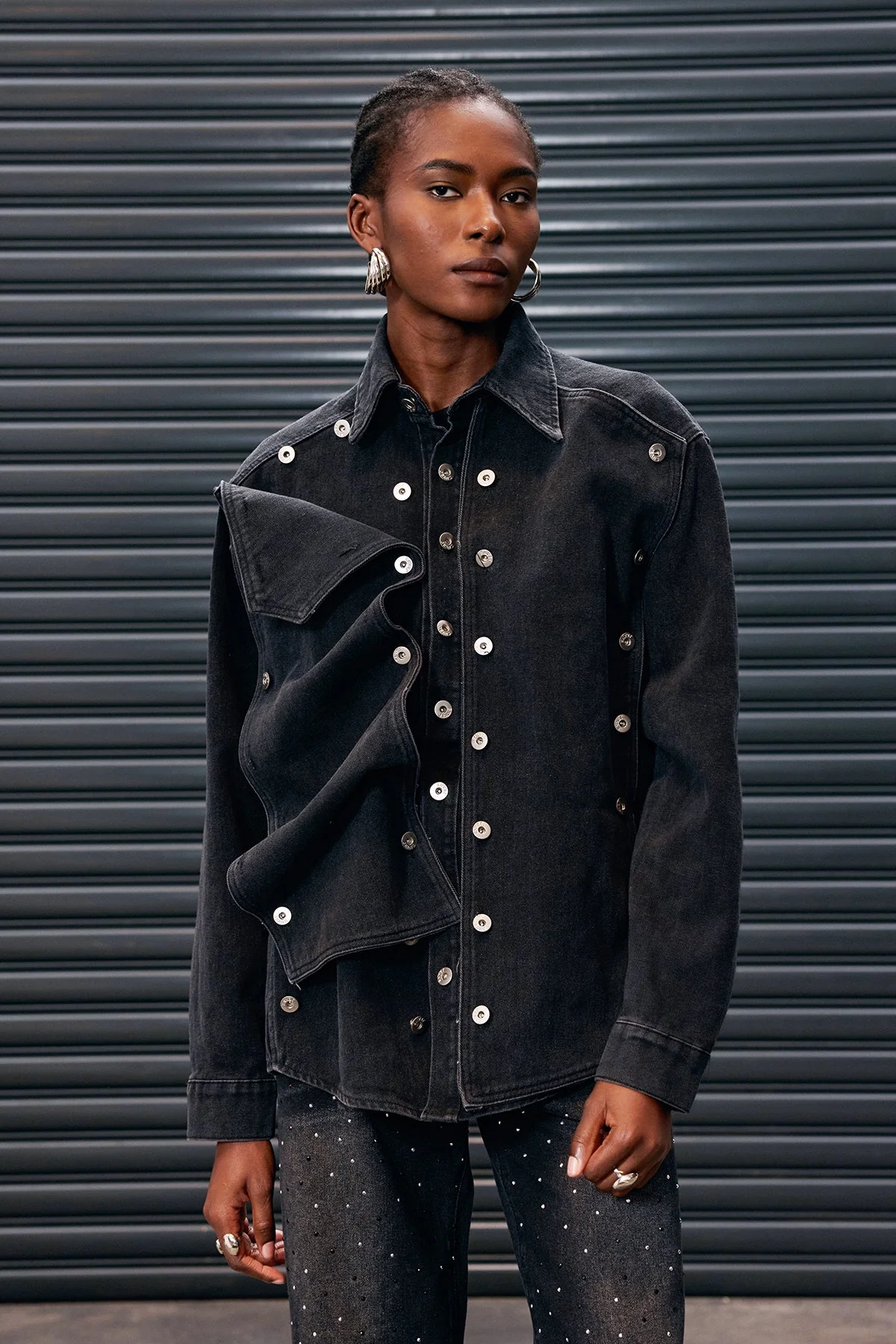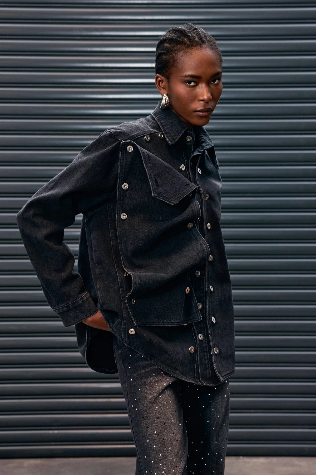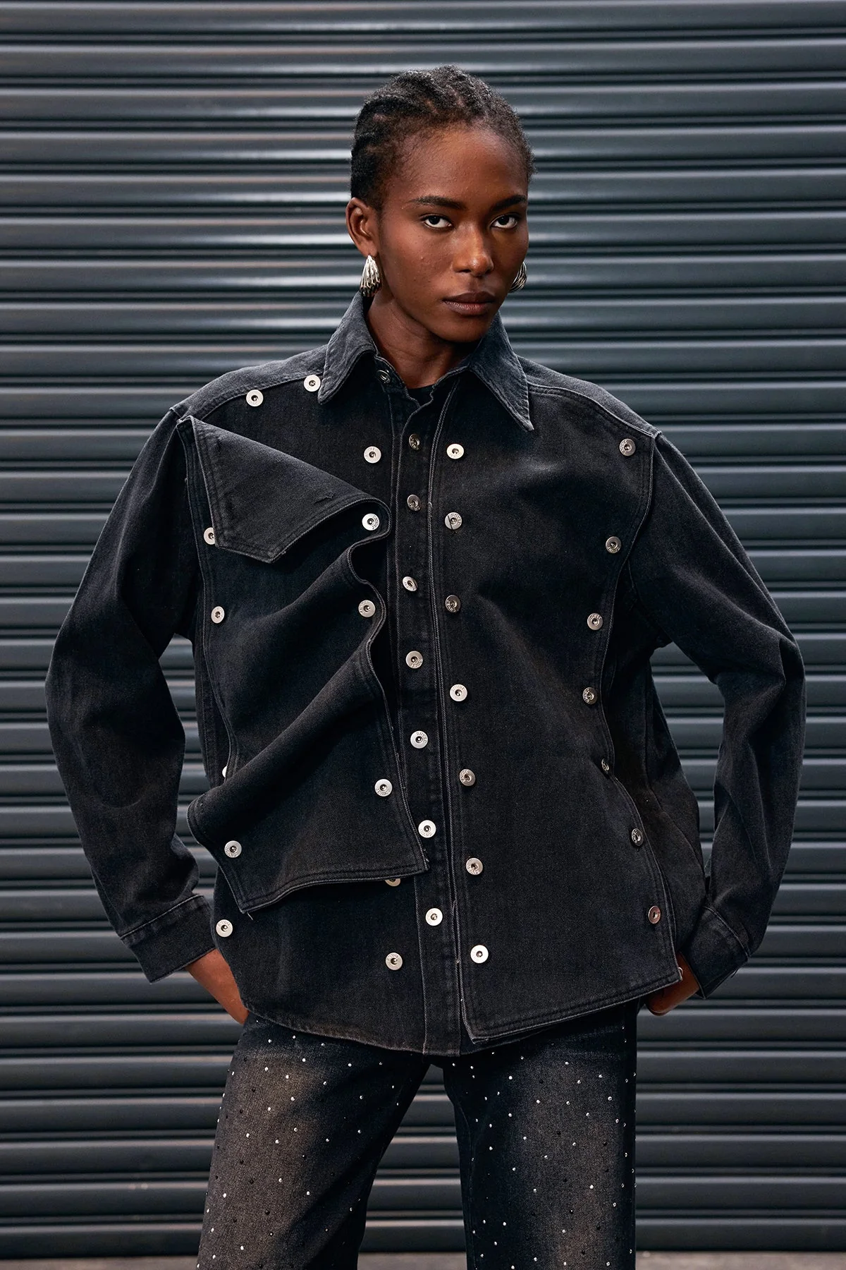 Elevate your wardrobe with the stylish Antony Deconstruct Button Denim Jacket in black. Constructed from premium black denim, this jacket features a modern deconstructed button-up front design. Crafted with 50% Polyester and 50% Cotton for durability and comfort. This versatile jacket is suitable for gentle machine wash. Please note, color may vary due to image lighting. Discover the perfect blend of style and durability with this urban edge jacket tailored for everyday wear.