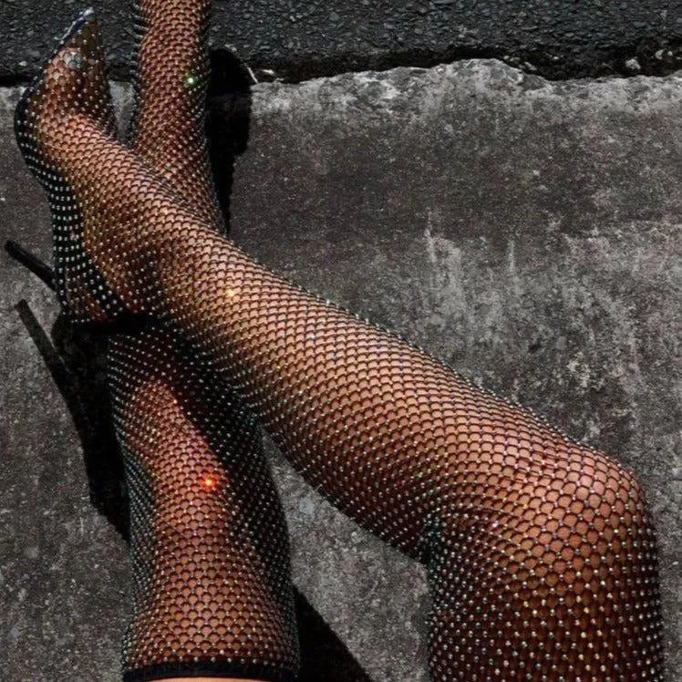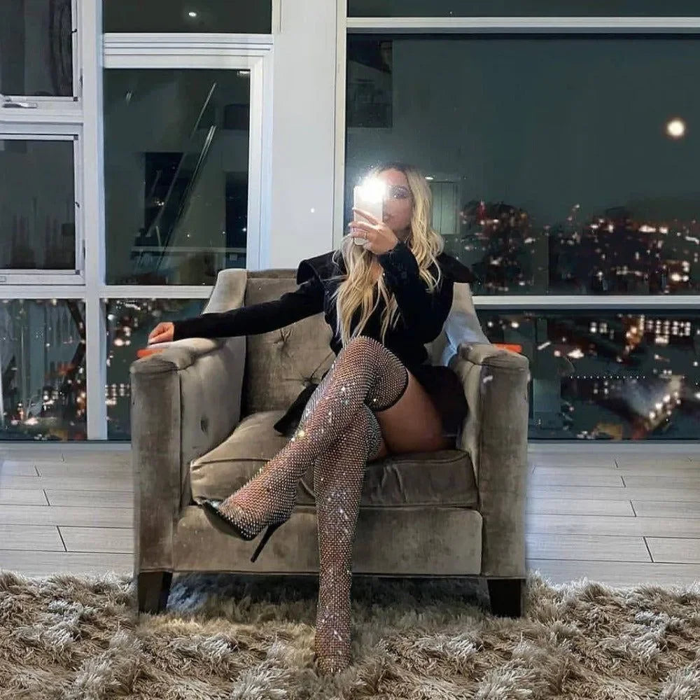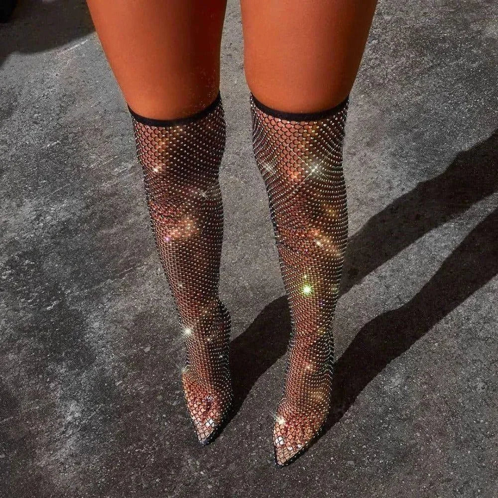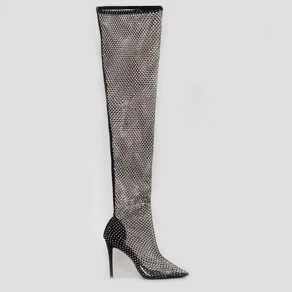 Elevate your style with our Black Diamante Fishnet Over-the-Knee Mesh Heel Boots! The mesh design with dazzling rhinestones creates a glamorous look, perfect for special occasions. These thigh-high boots feature a pointed toe, stiletto heel, and a heel height of 3.5 inches for a bold and stylish statement. Explore more outfit ideas and tips on our Instagram @mermaid_way. Enjoy free exchanges for size adjustments.