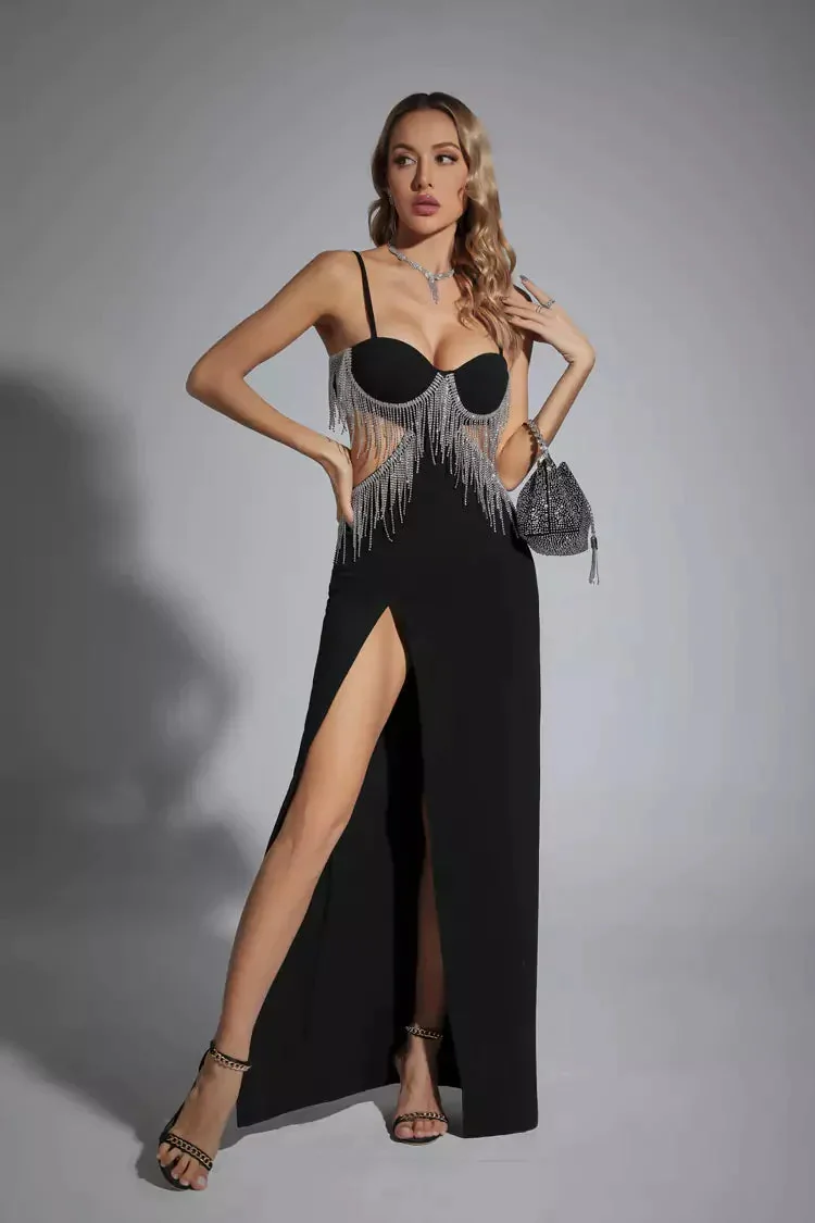 Discover the allure of the Black Diamante Maxi Dress by Night Novas. Crafted with high-quality bandage material, adorned with diamante tassels and a seductive high-slit design. This stunning banquet dress exudes luxury, ideal for glamorous events. Be the queen of the party with this enchanting piece paired with your favorite high heels. Dress Length: Approx 108cm. Materials: Bandage (90% Rayon, 9% Nylon, 1% Spandex). Gentle Dry Clean Only. Model is 5 ft 74″ and wears size S. Colour variations may occur due to lighting. Item runs true to size, perfectly matching our size chart recommendations.