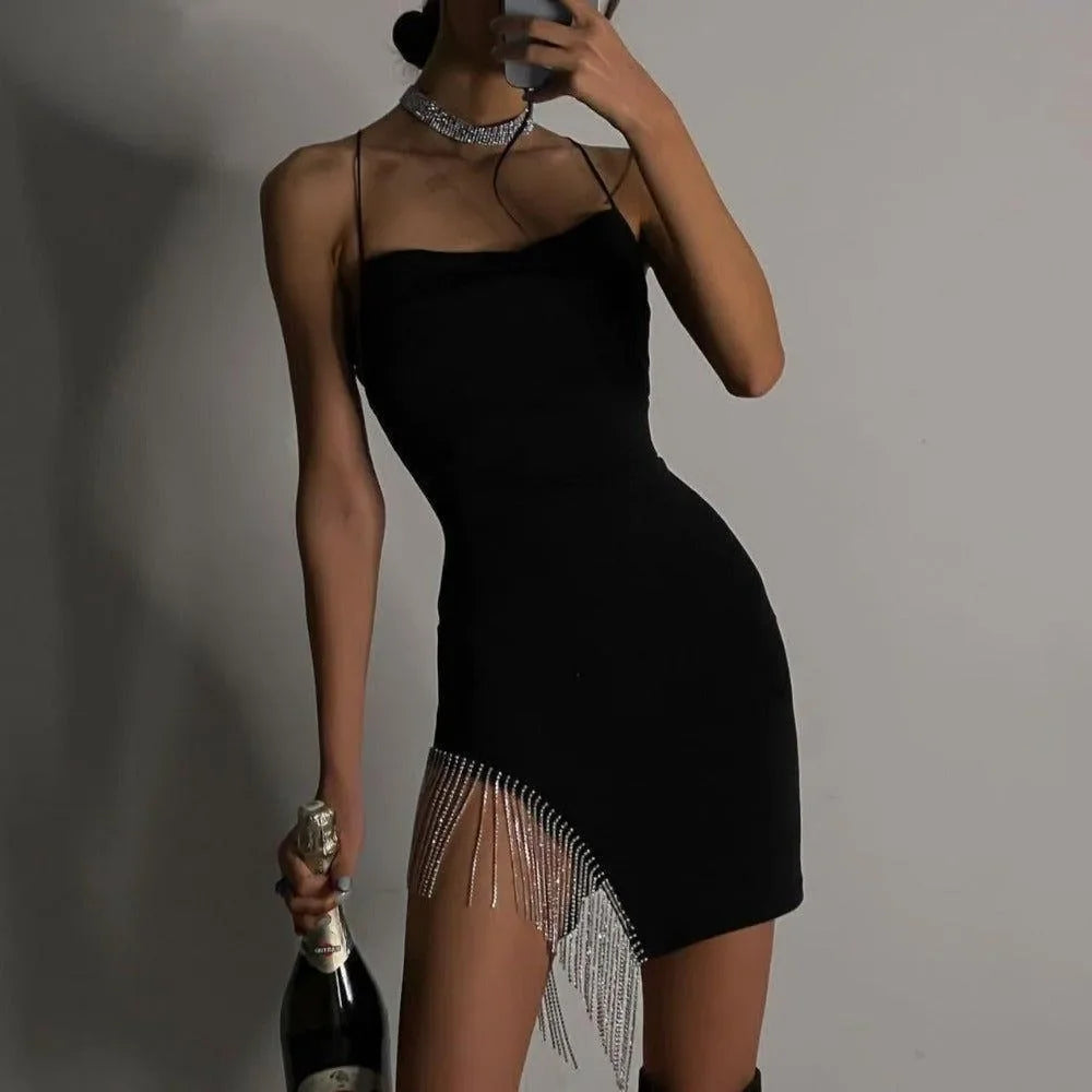 Illuminate the room with our exquisite Black Diamante Tassel Mini Dress. This stunning piece is adorned with intricate crystal details, perfect for special occasions that demand elegance and sophistication. The figure-enhancing silhouette of this mini dress exudes glamour, ensuring all eyes are on you. Whether its an evening soirée or a night out with friends, our dress guarantees a memorable fashion statement. Step into the spotlight and make heads turn. Visit @mermaid_way on Instagram for style inspiration. Elevate your wardrobe with the Black Diamante Tassel Mini Dress and enjoy a complimentary size exchange if needed for the perfect fit.
