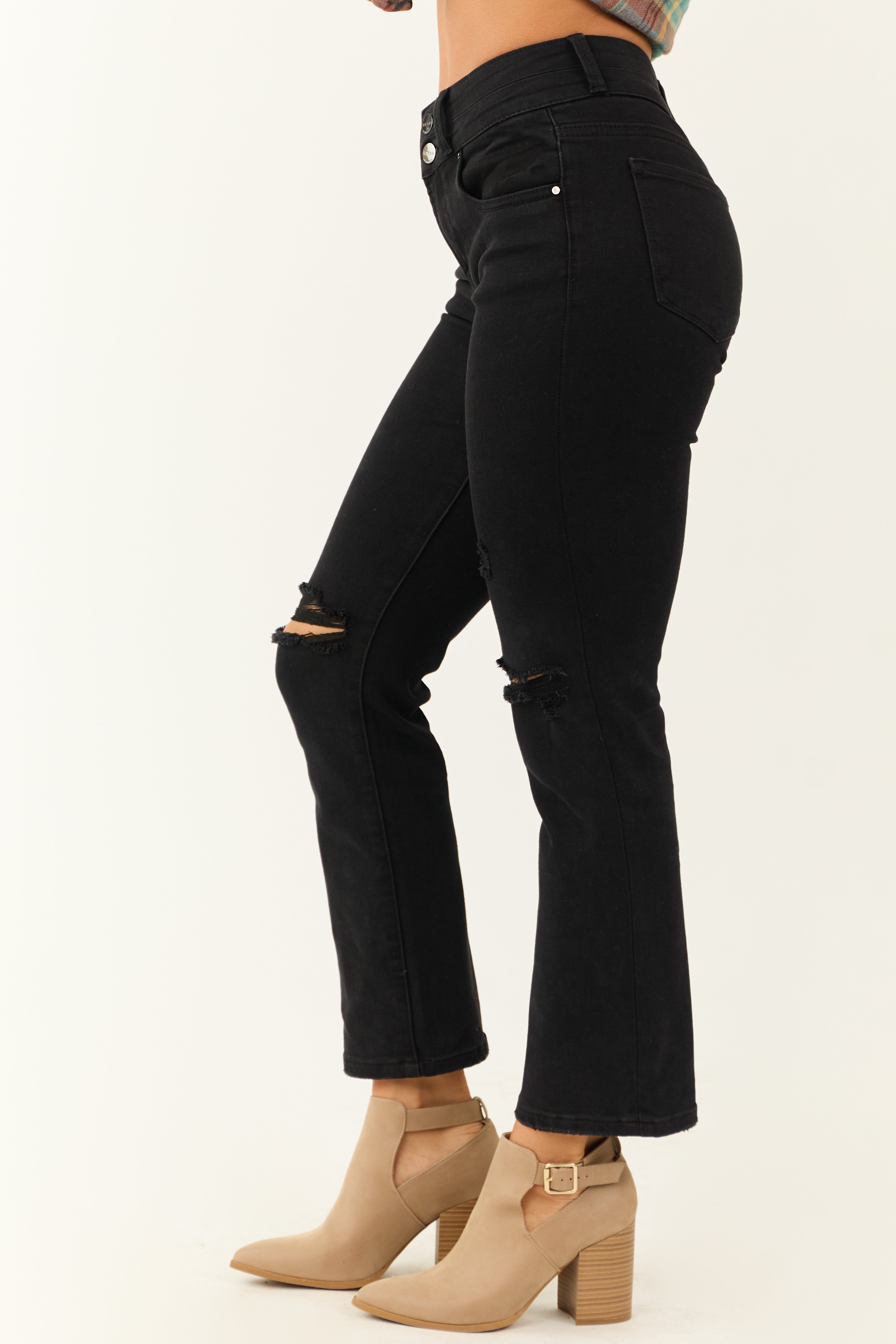 Experience comfort and style with these black distressed ankle jeans. Made with a stretchy blend of cotton, polyester, rayon, and spandex, these jeans offer a perfect fit with a double button fly closure, five pockets, and belt loops. The slight distressing adds a trendy touch, while the straight leg design and high rise fit ensure a flattering look. Care Instructions: Turn inside out, machine wash cold with like colors, hang to dry, iron if needed. Model is wearing size 1. Model’s Profile: Height 57″, Bust 34″, Waist 26″.