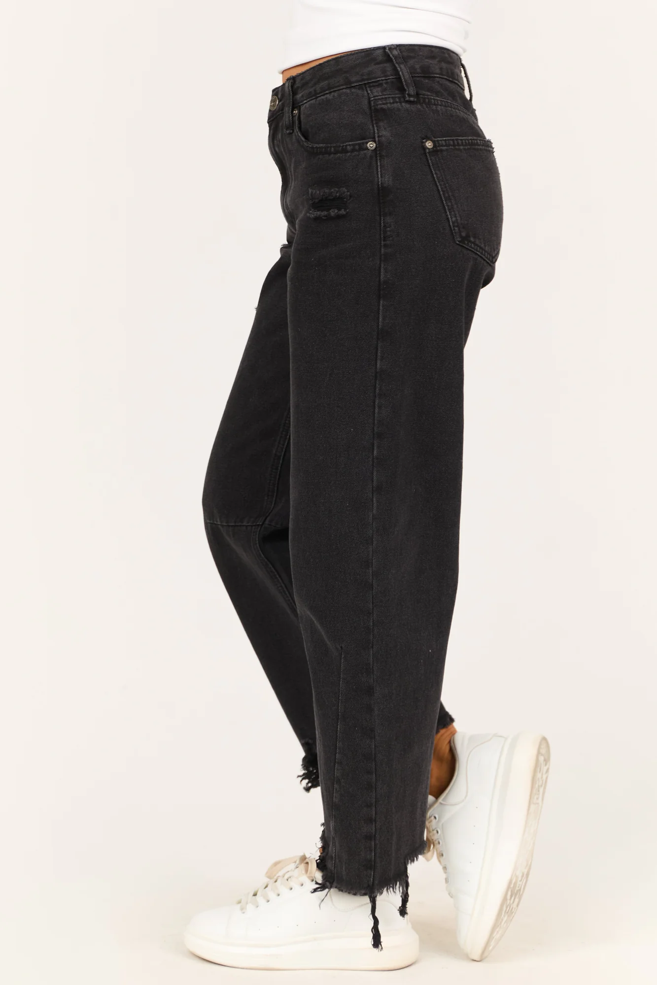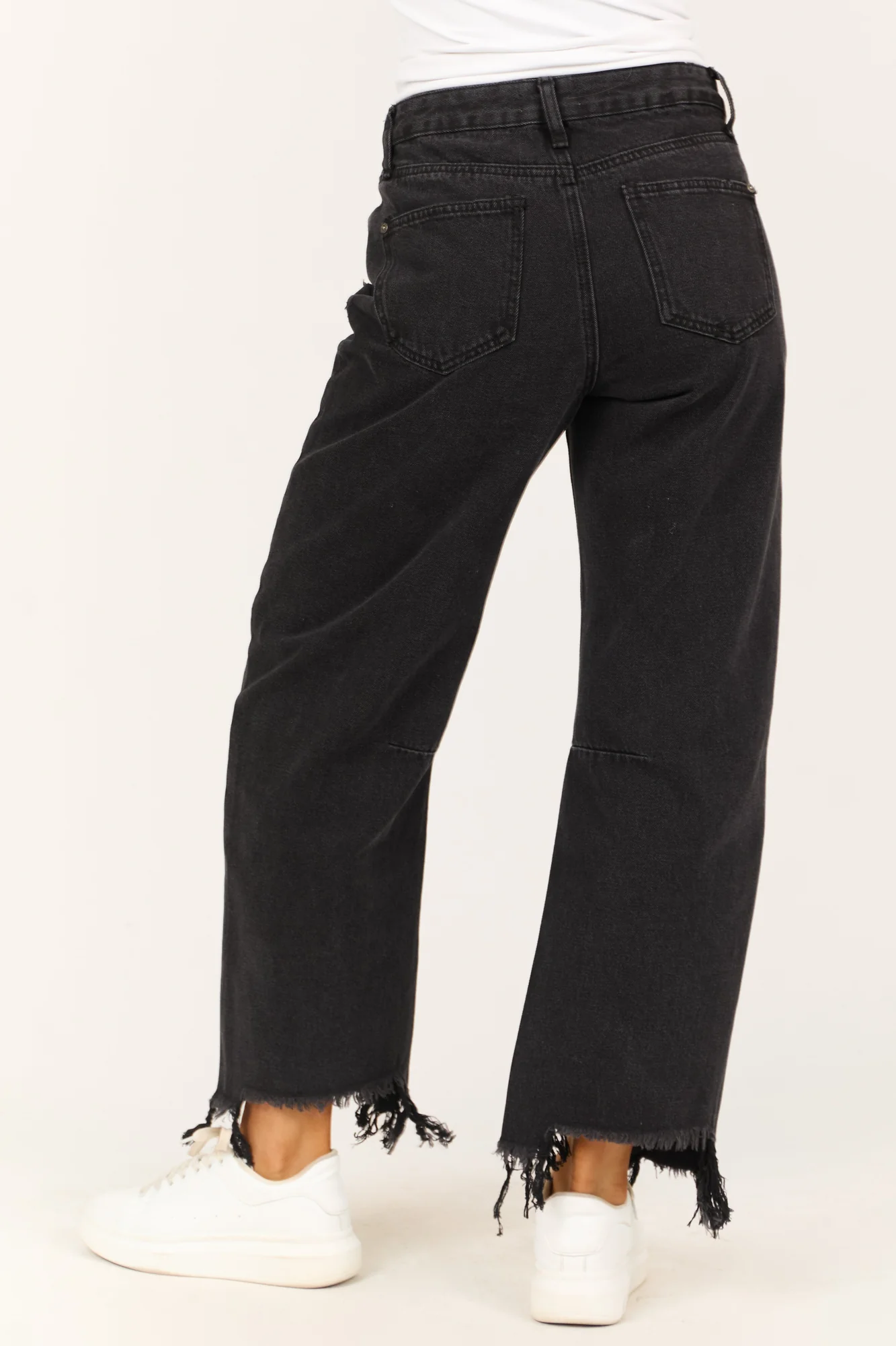 Update your wardrobe with these stylish Black Distressed High Rise Barrel Jeans . Made of 70% Cotton and 30% Spandex, these non-stretchy denim jeans feature five functional pockets, belt loops, and a zipper fly with button closure. The sharkbite hem and knee seam detail add a trendy touch, while the front rise of 10″ and back rise of 14″ provide a comfortable fit. This imported piece has a 27″ inseam and is perfect for daytime wear. Remember to wash inside out in cold water to preserve their quality. Model in the picture is wearing a size 1, showcasing a captivating silhouette.