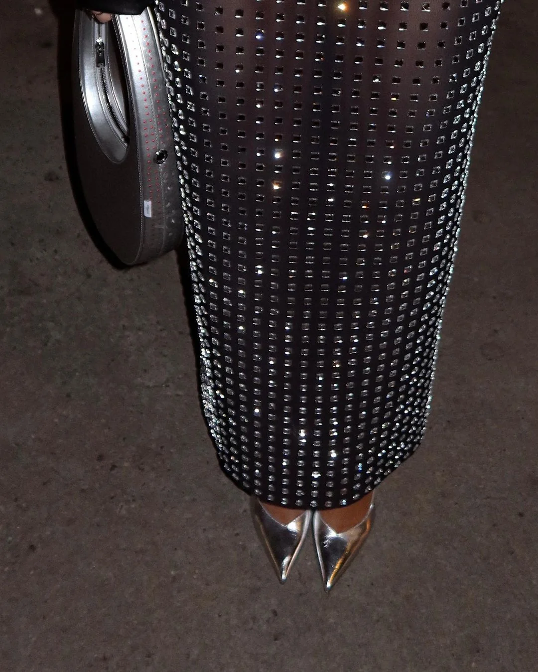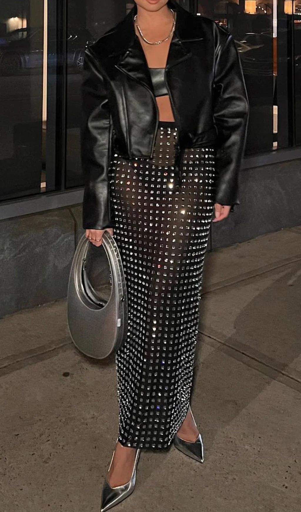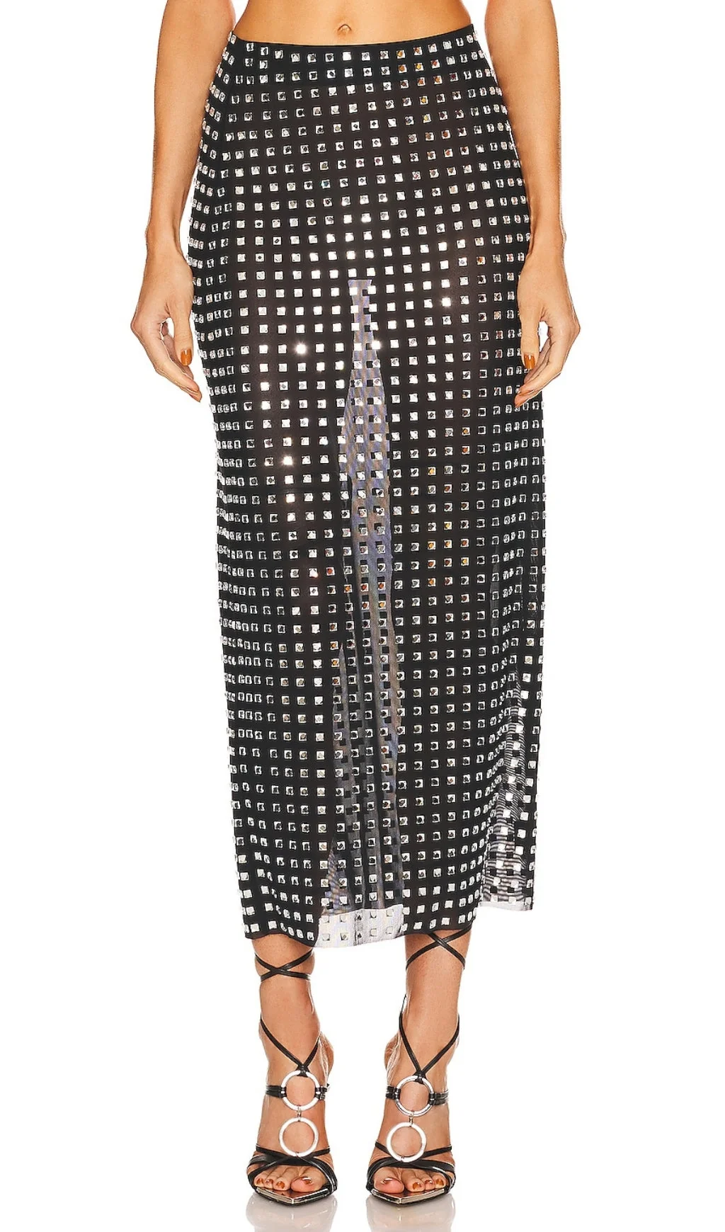 Indulge in luxury with our elegant Black Embellished Mesh Split Skirt from Night Novas. Crafted with intricate mesh detailing and fine embellishments, this skirt ensures a glamorous and standout look for any occasion. The comfortable fit, made from 100% polyester, adds to its appeal. Dry clean only. Please note that color may slightly vary due to lighting. Achieve a sophisticated ensemble with this stunning skirt that exudes elegance and charm effortlessly.
