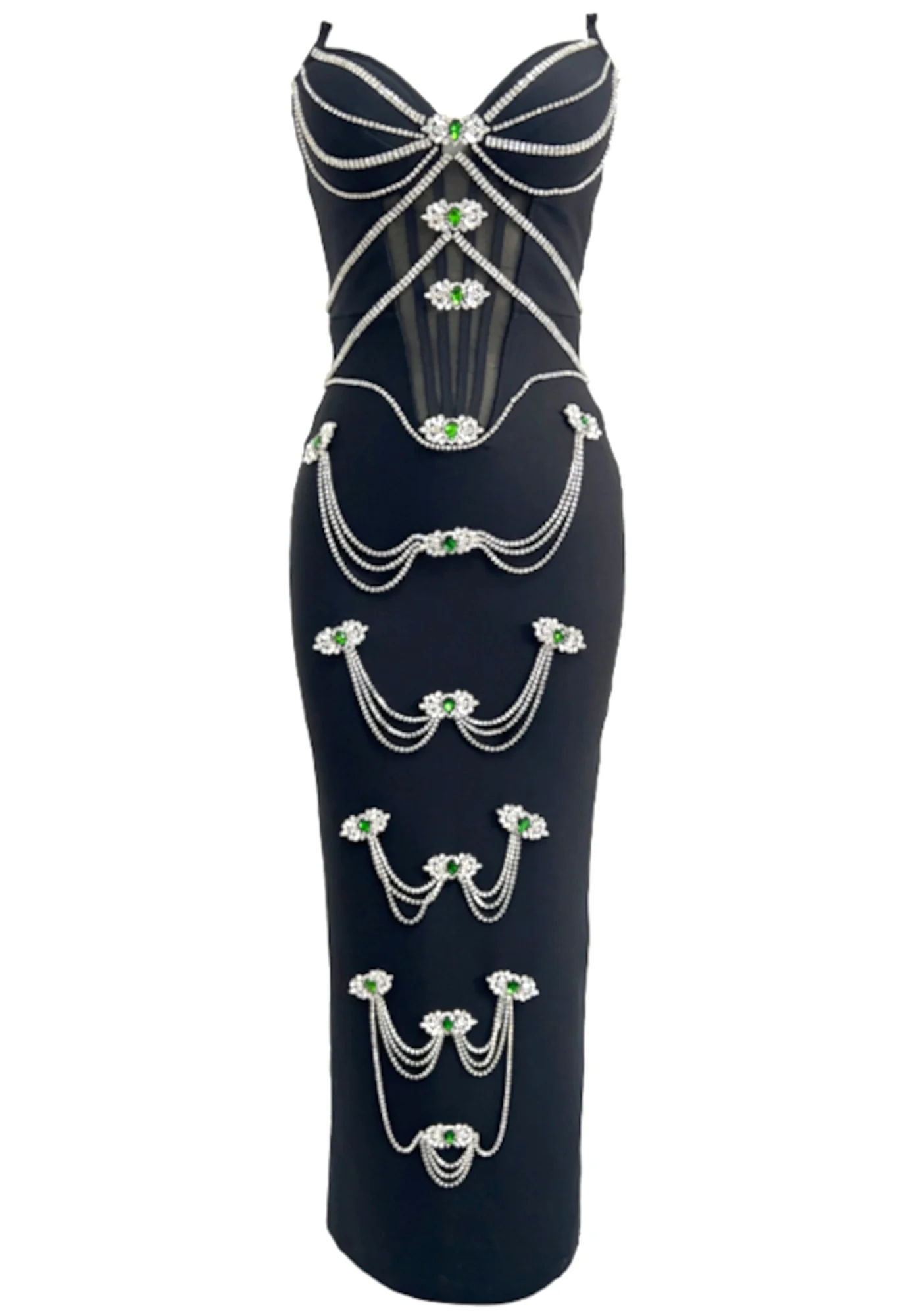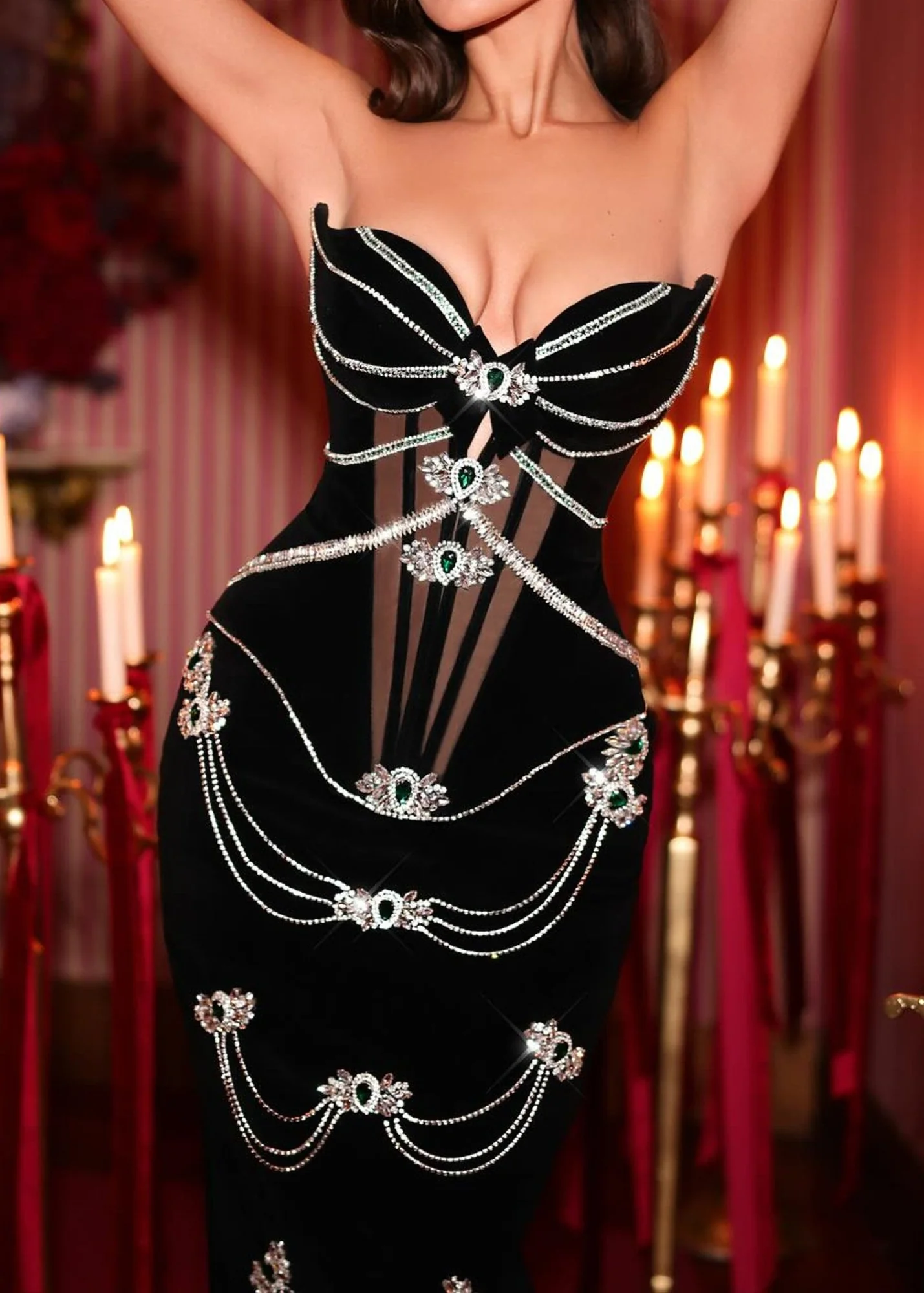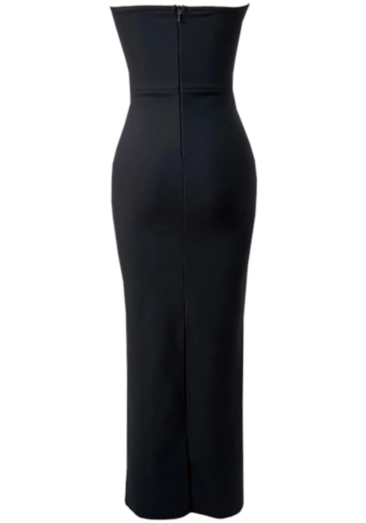 Indulge in the elegance of our black strapless maxi dress adorned with rhinestones. This stunning piece features a structured design with a sleeveless, mesh insert for a touch of allure. Made from 90% Rayon, 9% Nylon, and 1% Spandex, it offers anti-wrinkle properties and brighter colors. The high-quality durable fabric ensures a perfect fit with its high elasticity. Carefully crafted with delicate sewing and YKK zipper for durability. Dry clean only. *Care instructions provided.