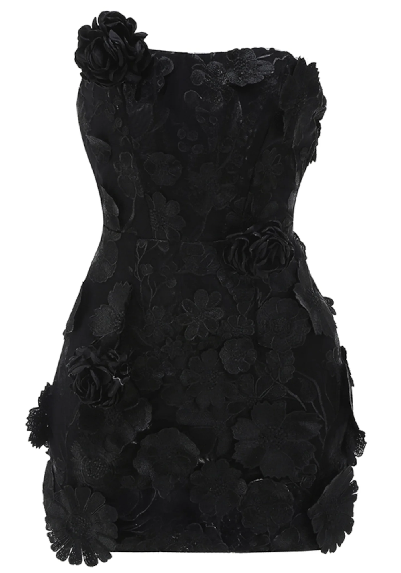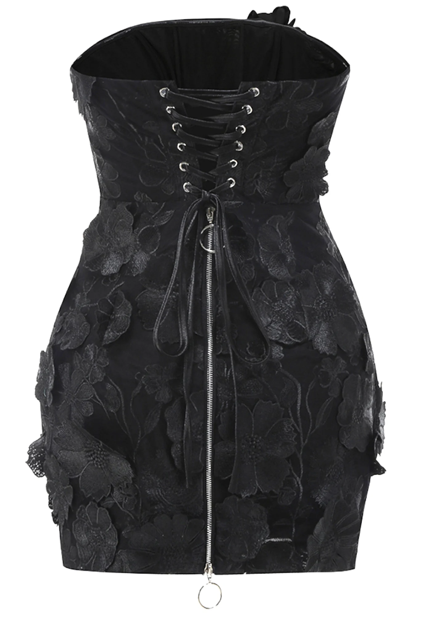 This exquisite mini dress in black features a strapless, corset design with delicate floral details. Made from a blend of high-quality polyester, cotton, and spandex for durability. The dress boasts a YKK zipper for reliability and easy closure. Carefully crafted with attention to detail, this sleeveless dress is perfect for various occasions. For maintenance, please follow the care instructions provided.