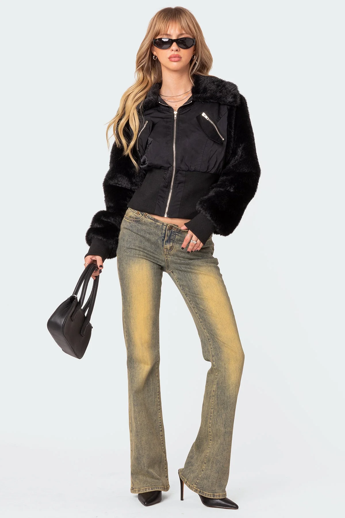 Experience luxurious warmth and style with our Black Faux Fur Nylon Jacket. Crafted with faux fur sleeves and collar, this trendy jacket is made from high-quality nylon fabric and lined with soft polyester for ultimate comfort. Whether youre running errands or going out for a night on the town, this versatile piece is your perfect companion. Machine washable for easy care. Available in sizes XS to XL.