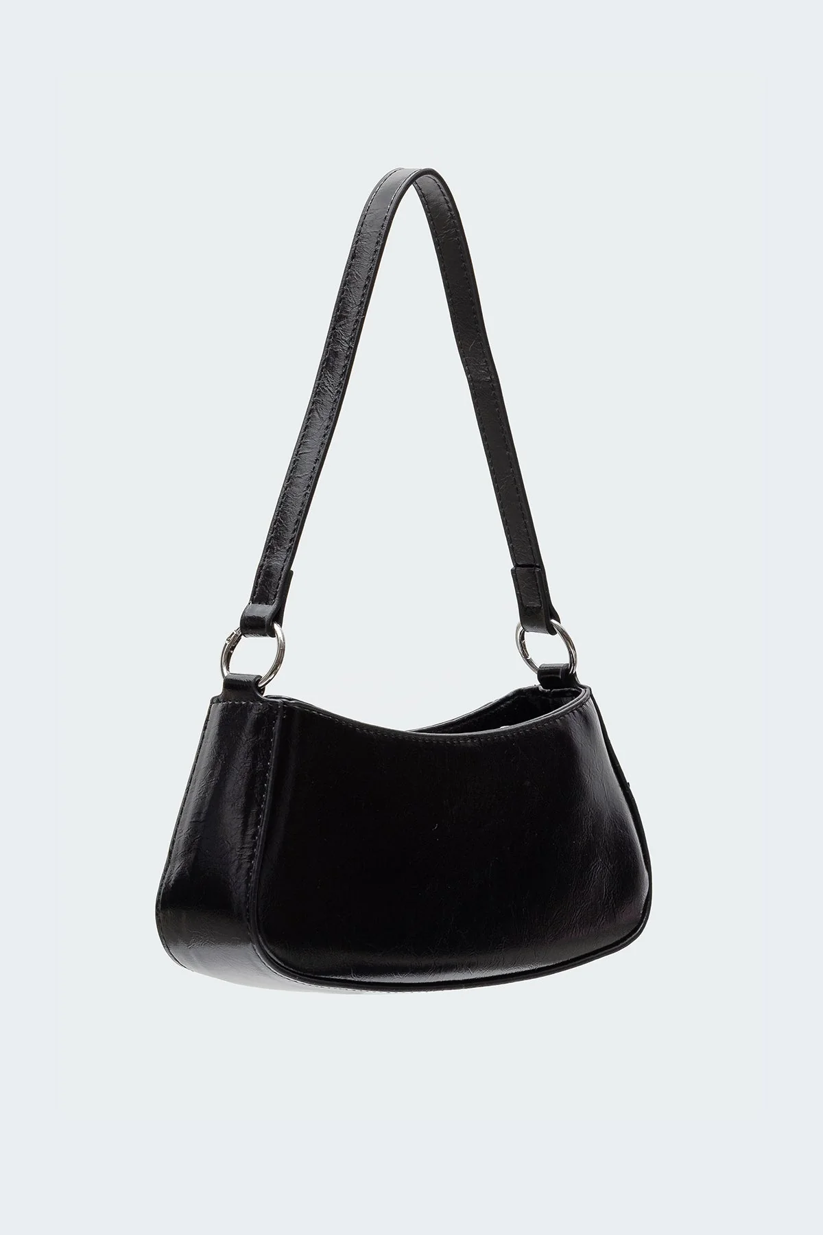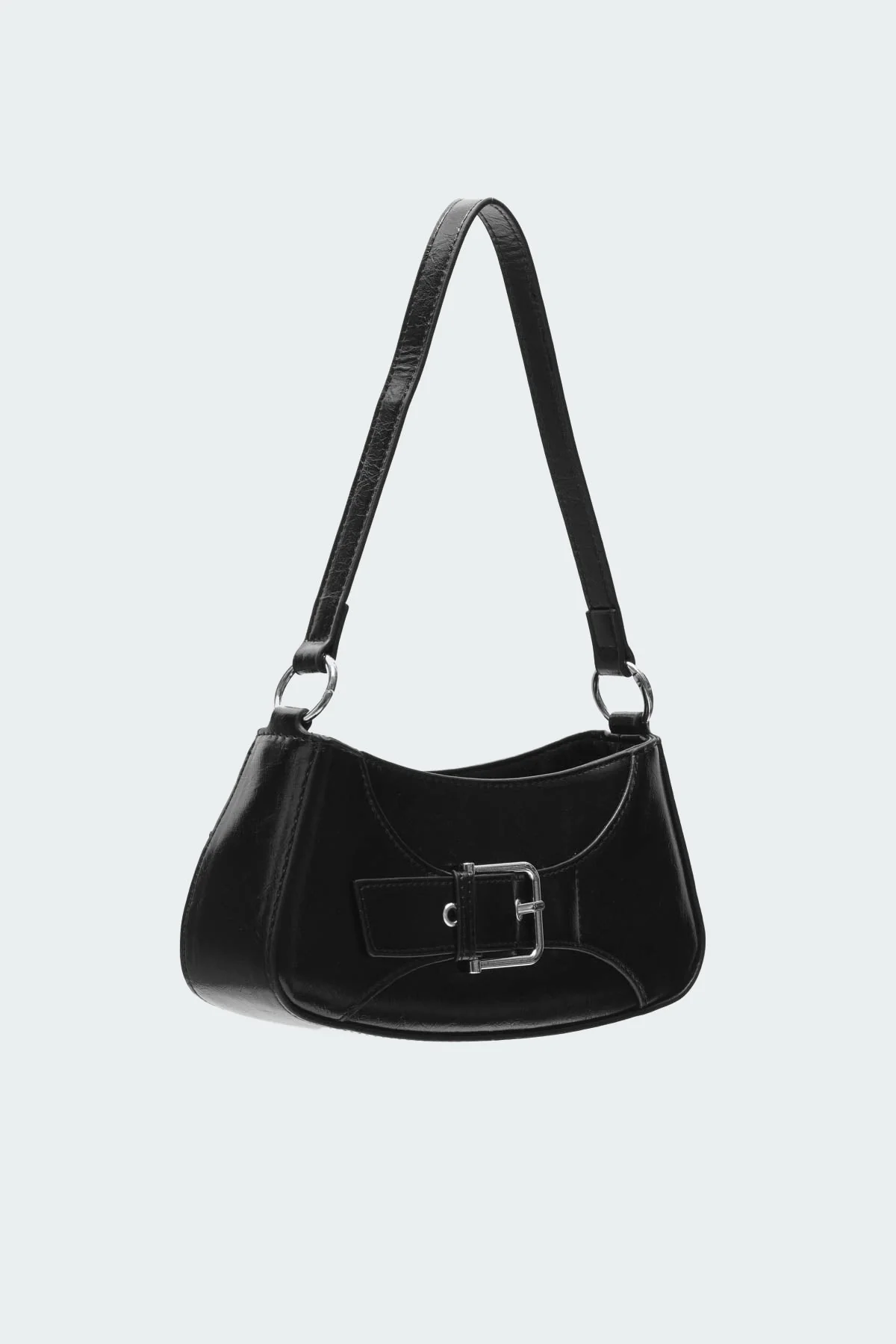 Discover the sleek Black Faux Leather Buckle Bag, featuring intricate buckle detailing and crafted from durable polyurethane and rayon blend. With measurements of Width: 4.3 inches, Height: 10 inches, Depth: 3.4 inches, this bag offers both style and practicality. Hand wash care instructions ensure lasting quality.