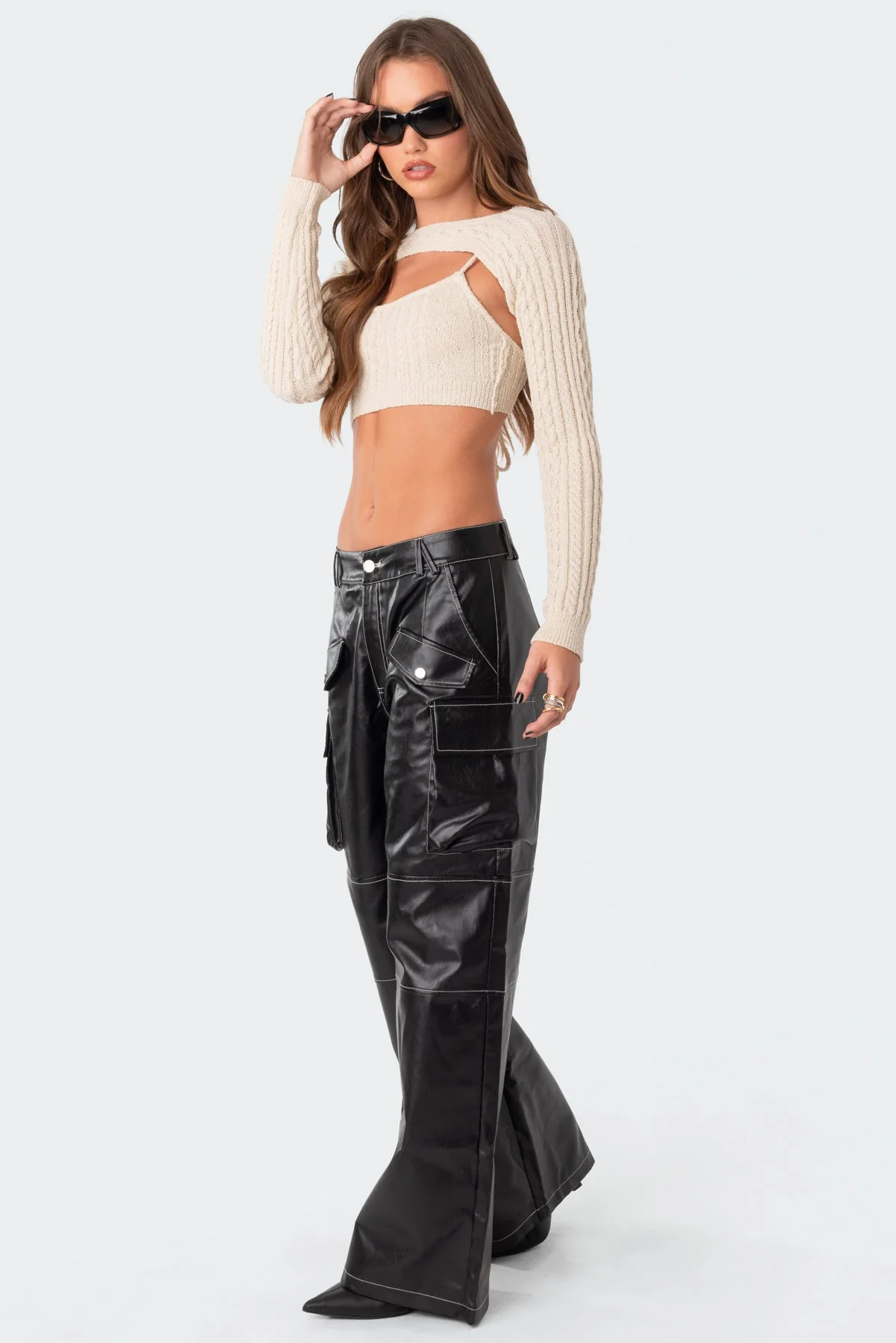 Experience the perfect blend of style and functionality with our Black Faux Leather Cargo Pants. Designed with a contrast stitch military style, these pants feature ample pockets for all your essentials. Crafted from a durable blend of polyester and rayon, these pants offer both durability and comfort. The model is wearing size S, height 58. Care instructions: Machine wash with similar colors for long-lasting wear.