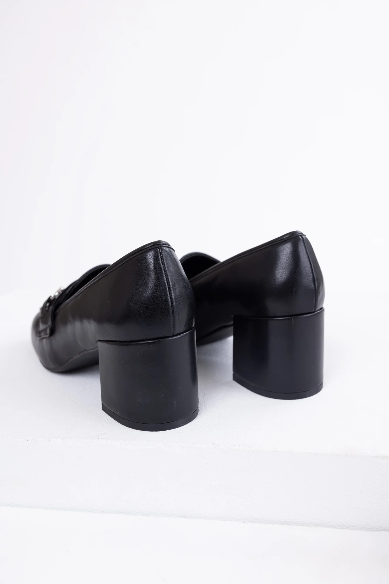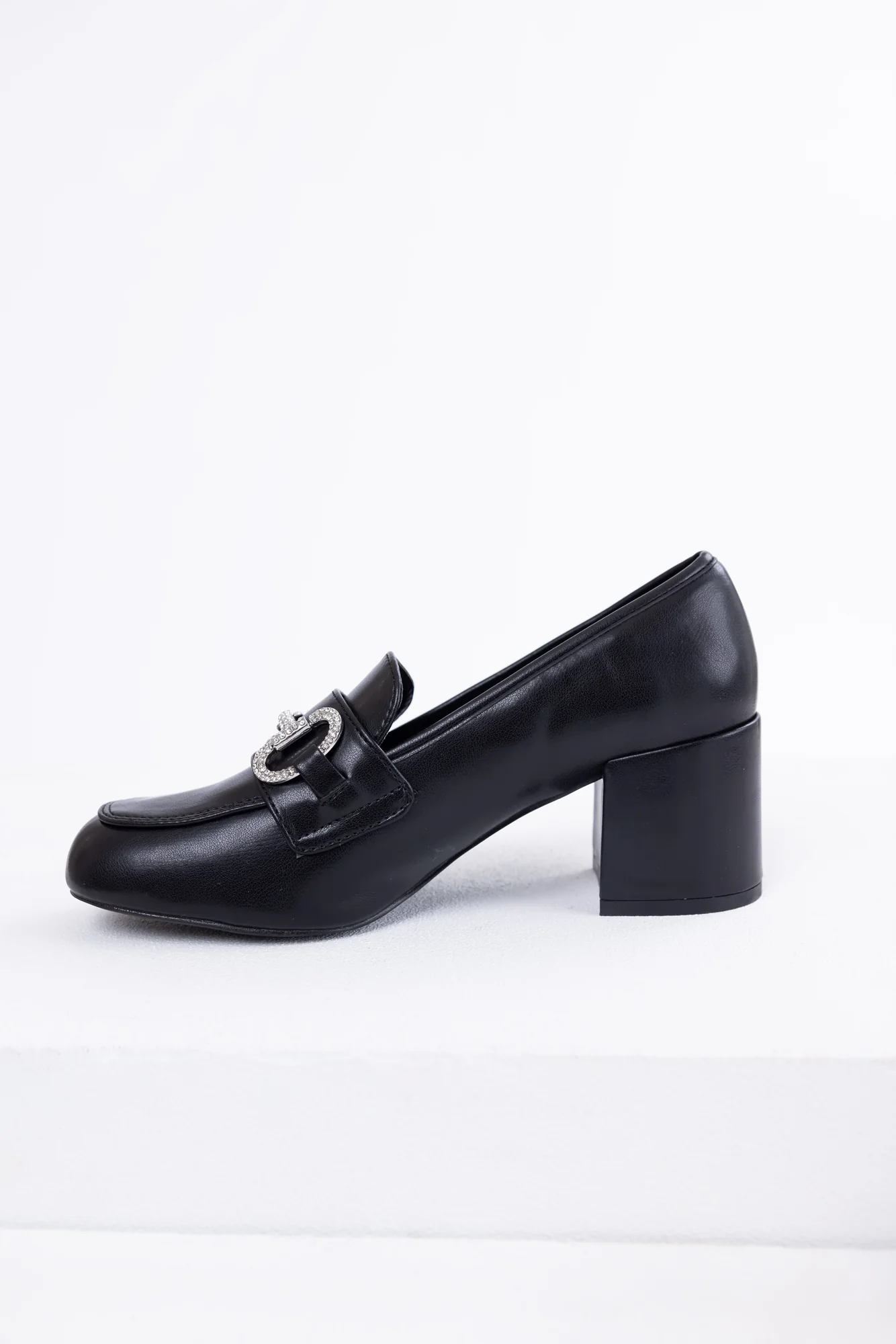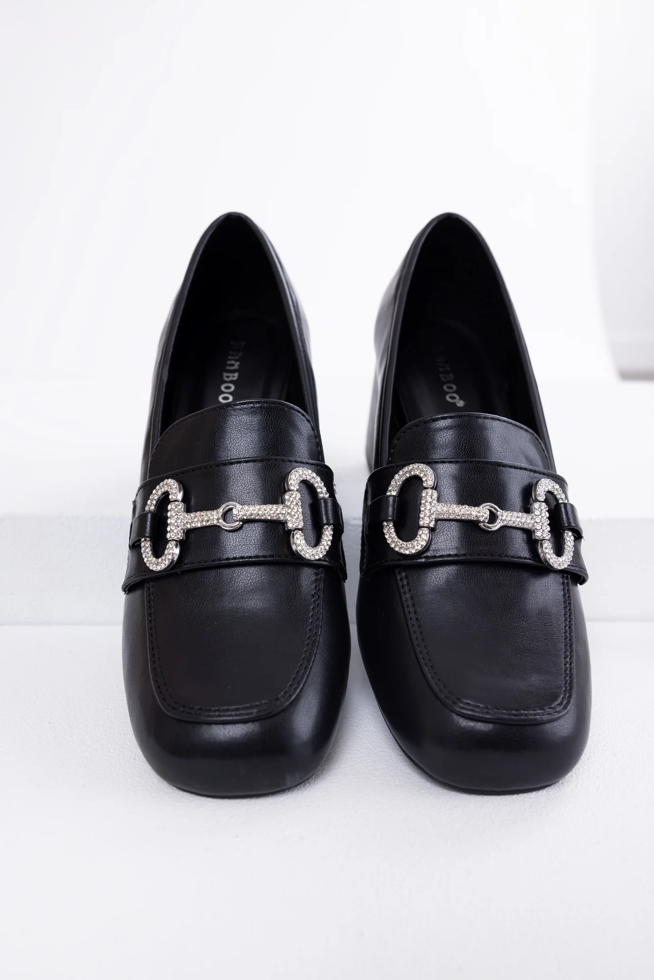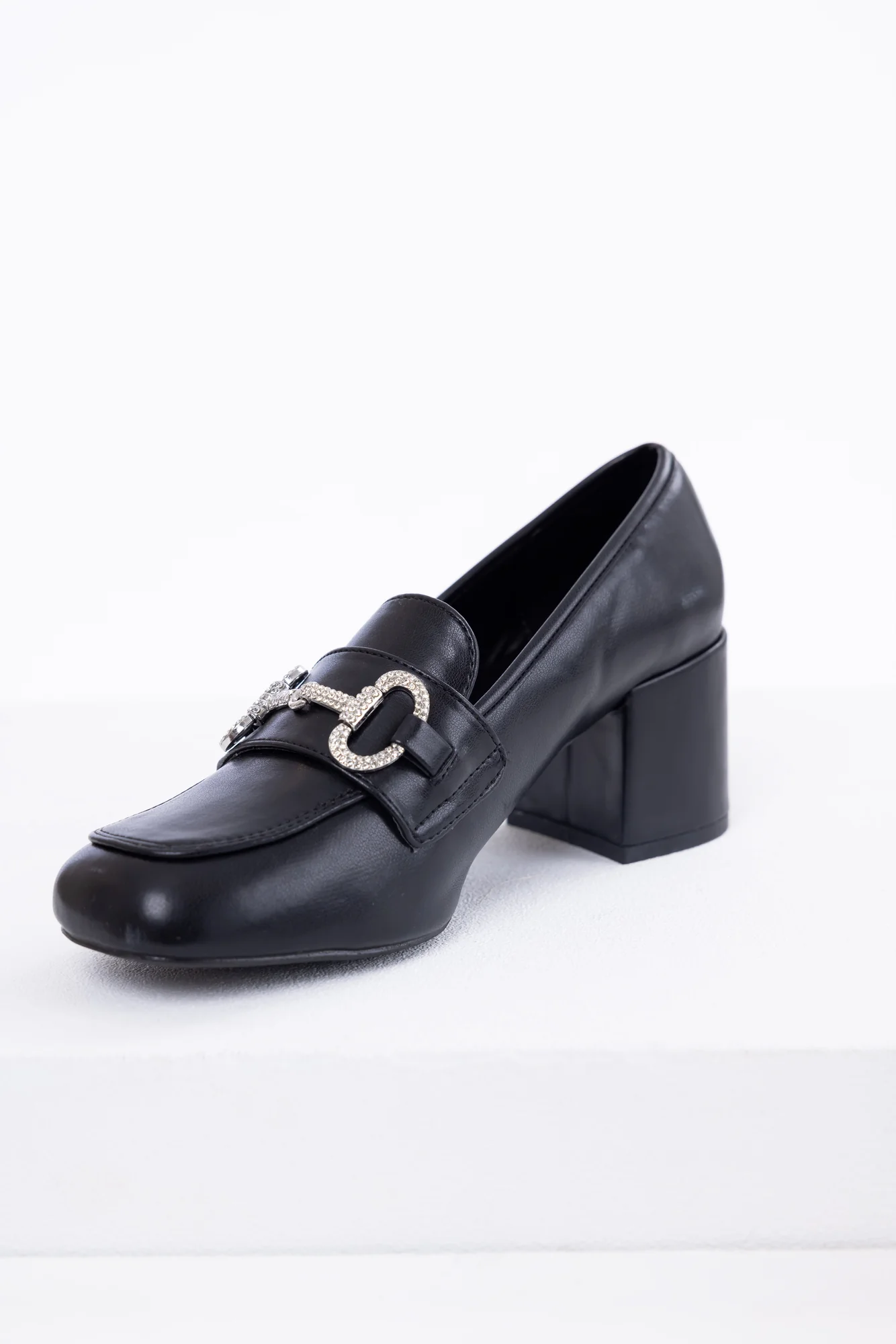 Step out in style with these sleek Black Faux Leather Loafers featuring a square toe design and a dazzling rhinestone horse bit chain detail. The slip-on style ensures convenience, while the low 2.5″ block heel adds a touch of elegance to your look. Imported and meticulously crafted for comfort and durability, these loafers are perfect for various occasions from work to date nights. Available in sizes ranging from 5.5 to 10.