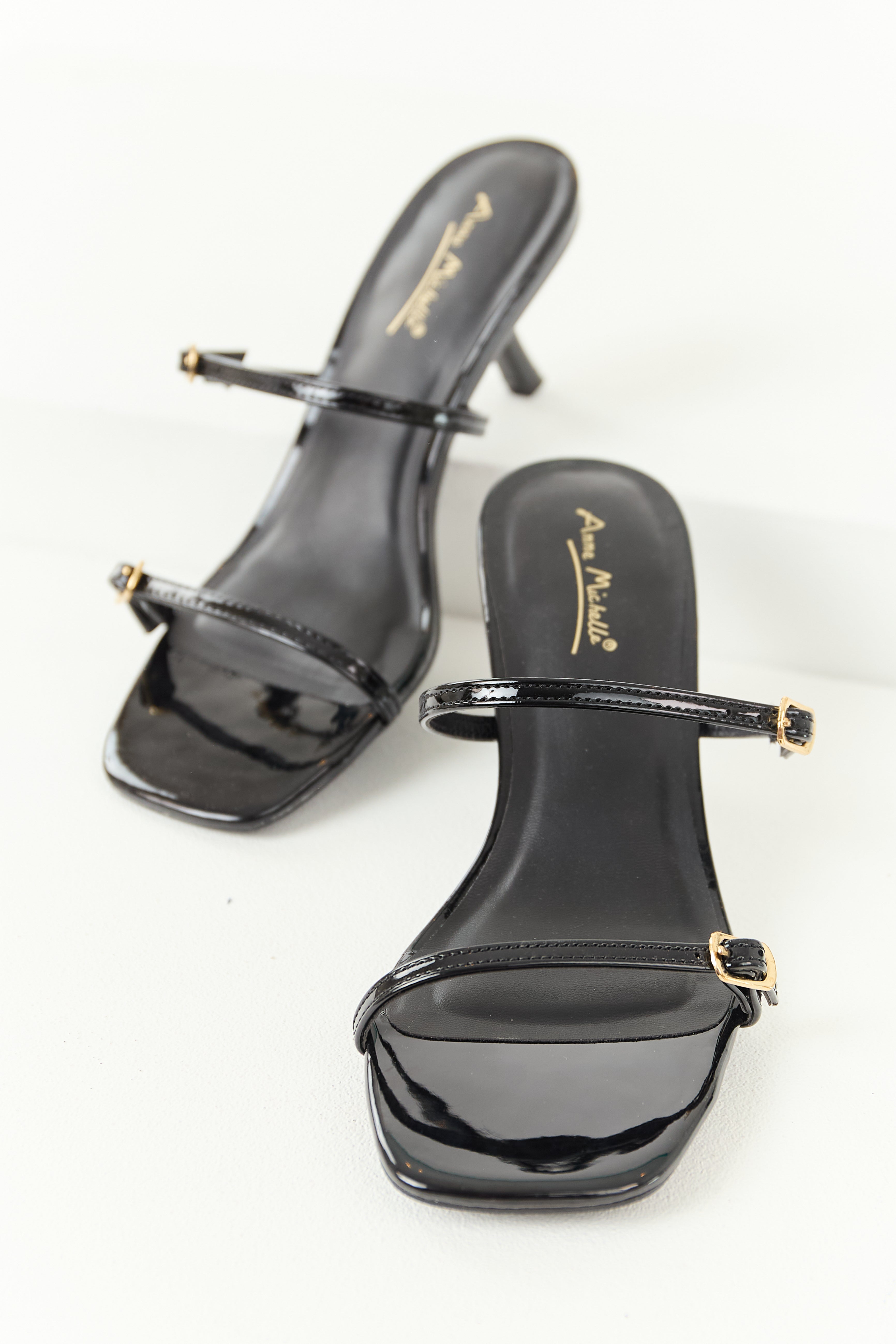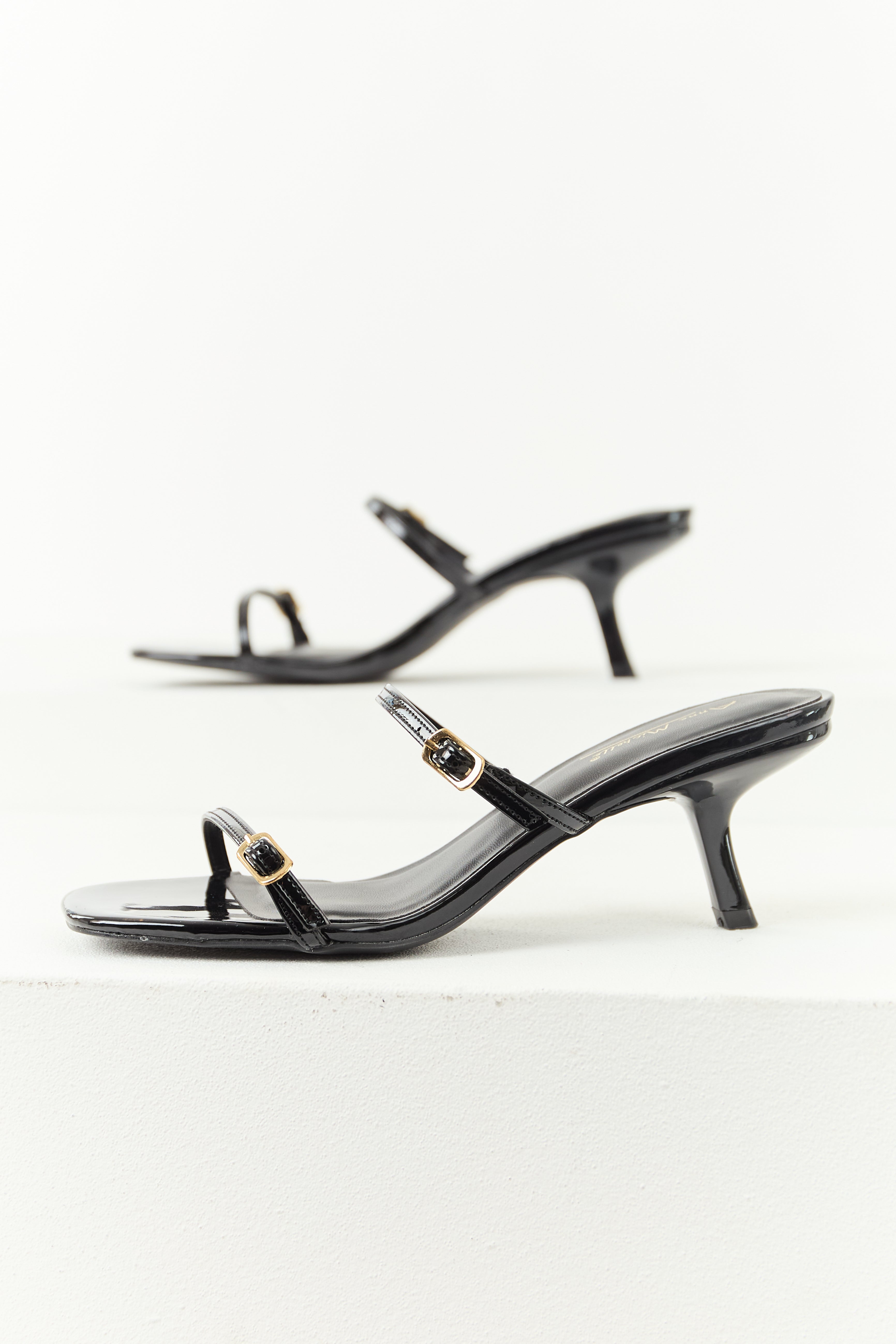 Step out in style with these black faux leather open toe heels. Designed with a lightly cushioned insole, two adjustable buckle straps, and a stiletto kitten heel for a trendy look. The shaft measures 2.5 inches with a 2.75-inch heel and a 9-inch circumference. Imported and available in sizes 5.5 to 10.