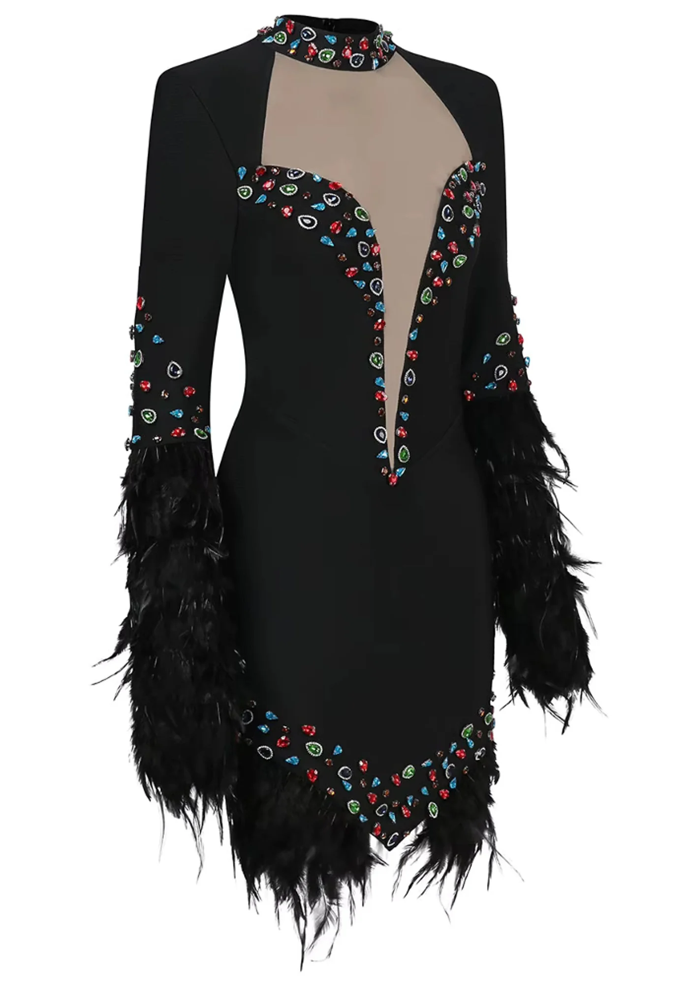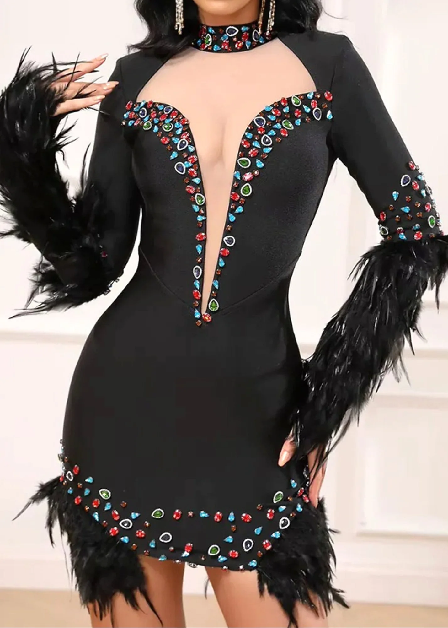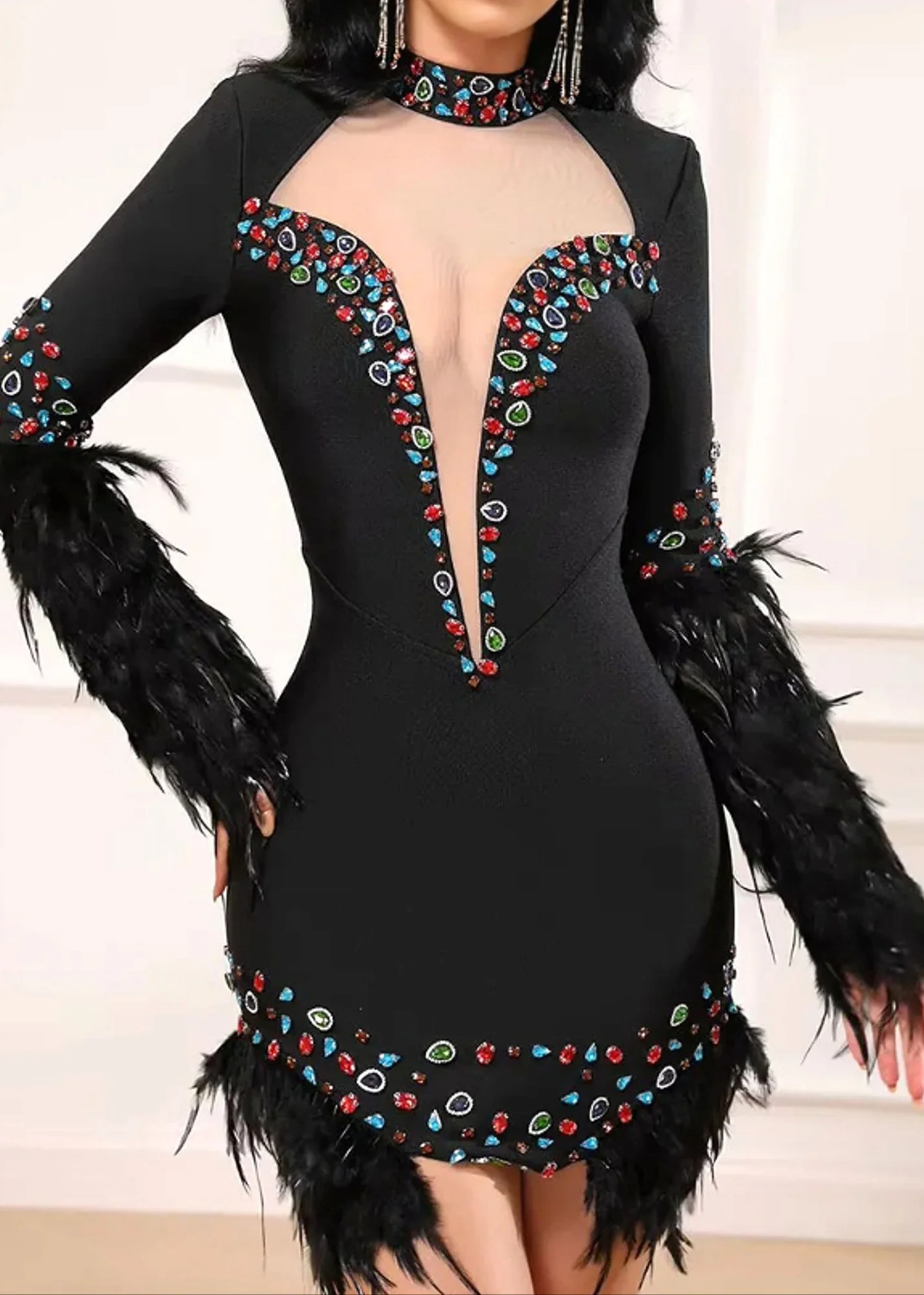This stunning black mini dress features a mock neck, long sleeves, mesh insert, feather details, and rhinestone embellishments. Made of 90% Rayon, 9% Nylon, and 1% Spandex for anti-wrinkle properties, vibrant colors, and exceptional durability. The high elasticity ensures a perfect fit, while the YKK zipper adds reliability. Care instructions included for long-lasting beauty. Color variations may occur due to image lighting.
