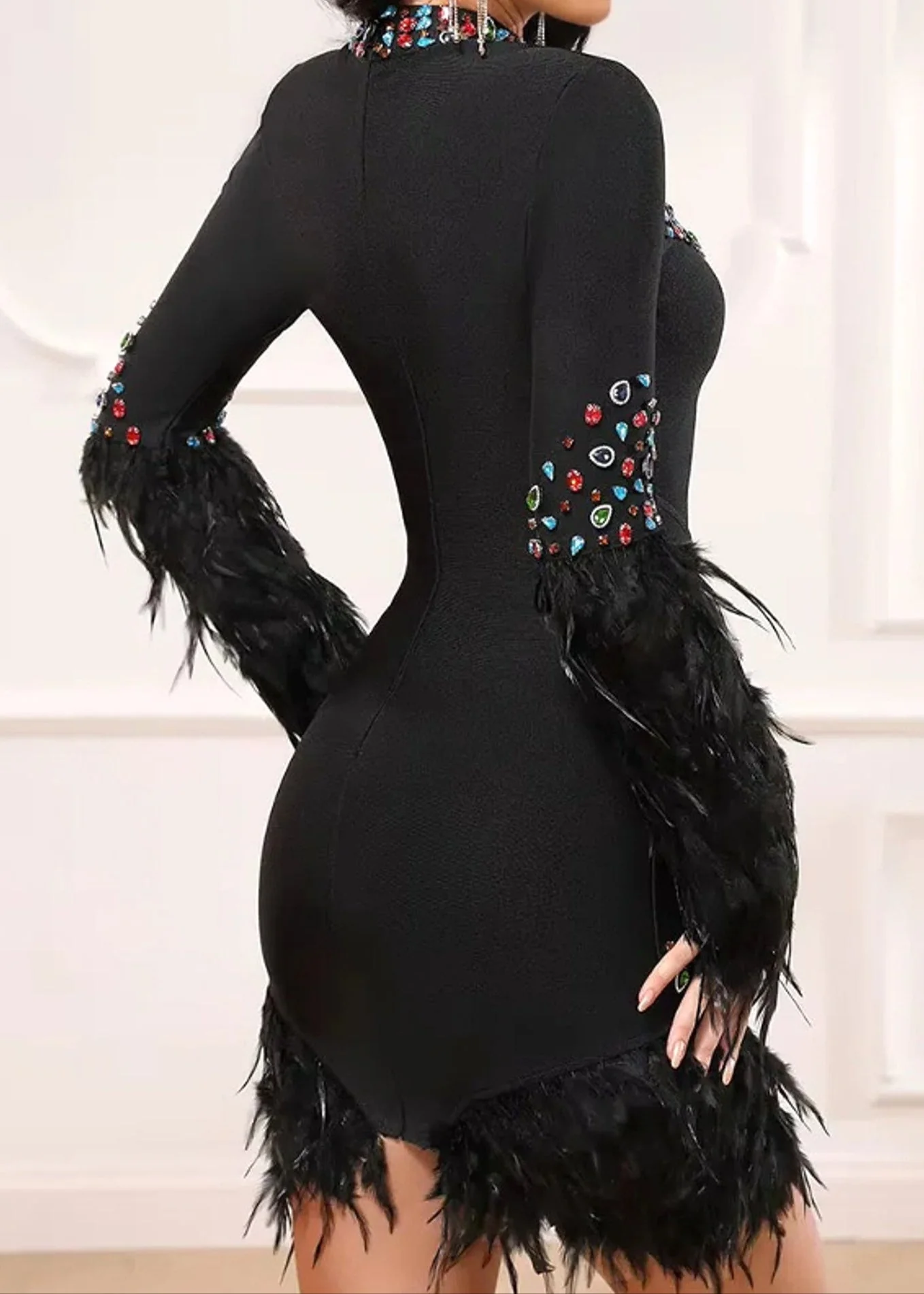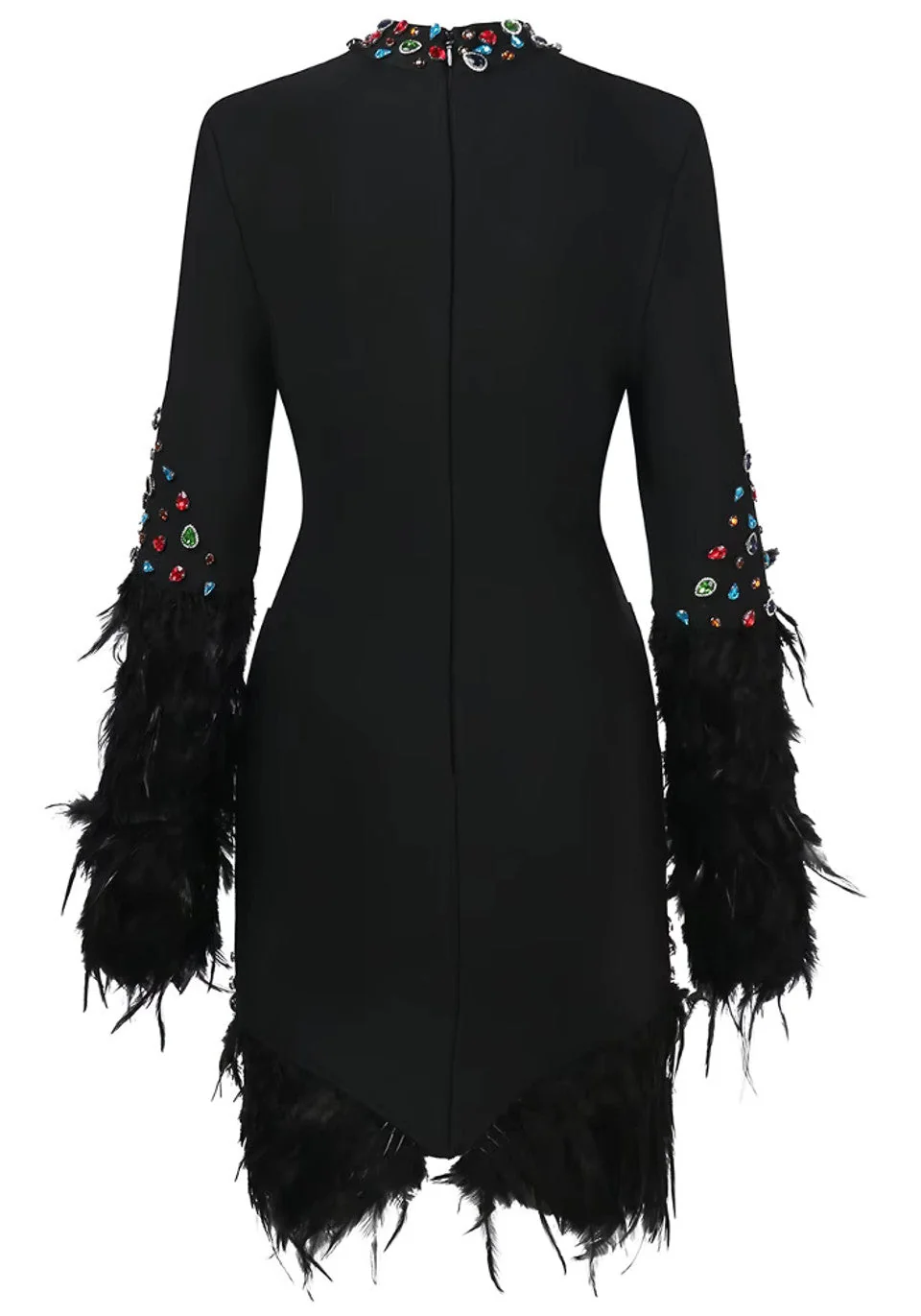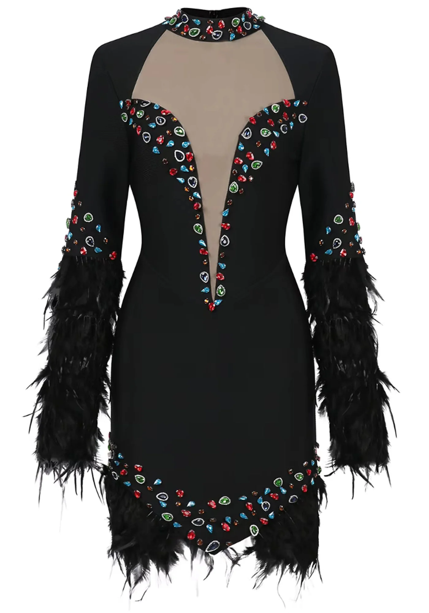 This stunning black mini dress features a mock neck, long sleeves, mesh insert, feather details, and rhinestone embellishments. Made of 90% Rayon, 9% Nylon, and 1% Spandex for anti-wrinkle properties, vibrant colors, and exceptional durability. The high elasticity ensures a perfect fit, while the YKK zipper adds reliability. Care instructions included for long-lasting beauty. Color variations may occur due to image lighting.