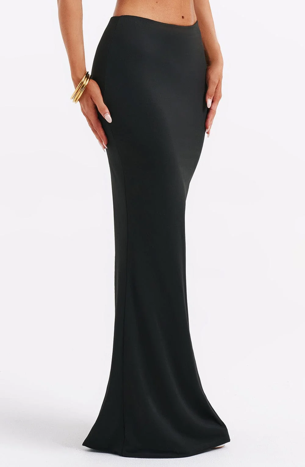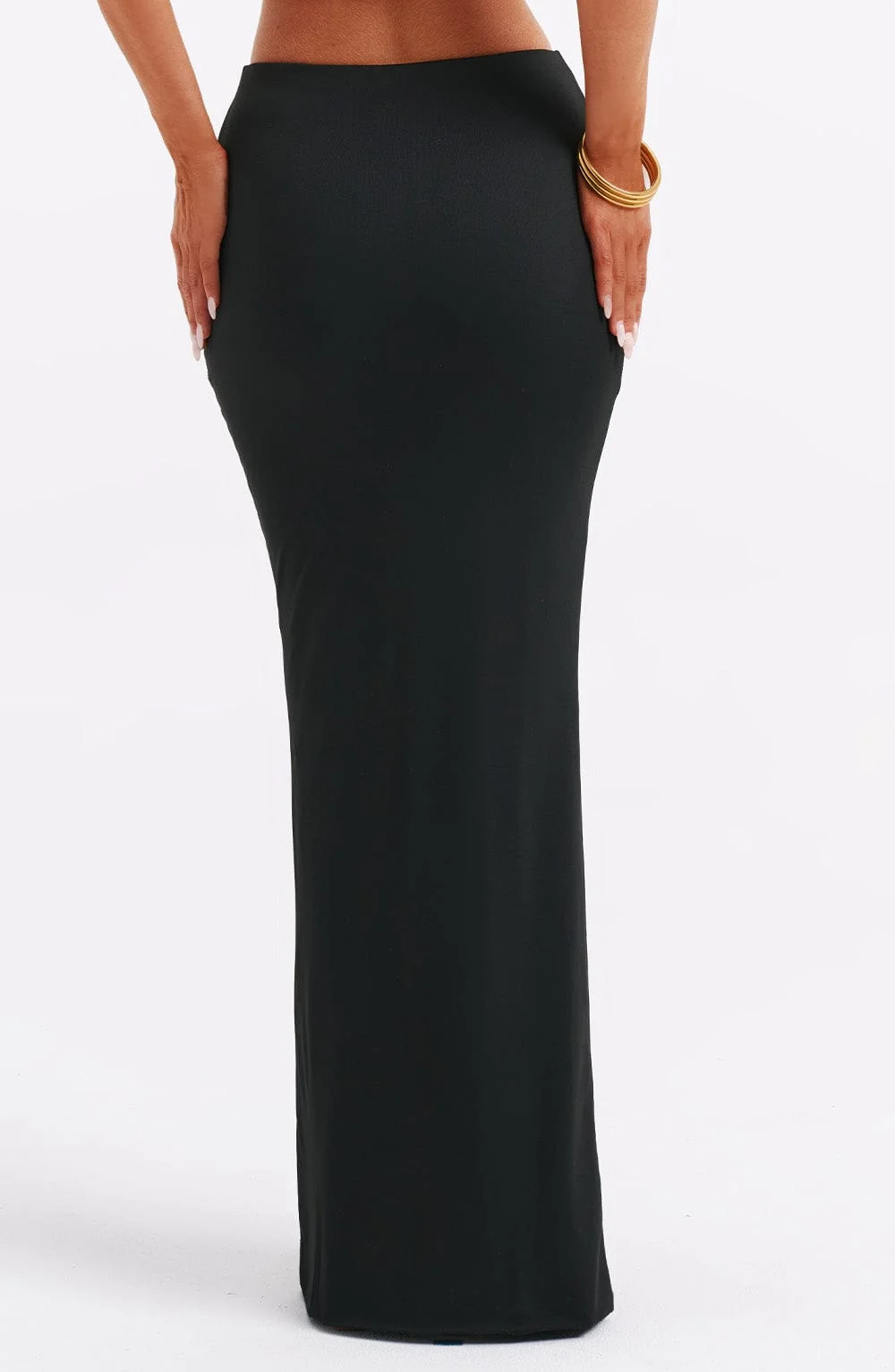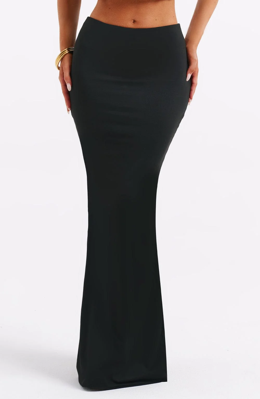 Discover the allure of our black figure-hugging maxi skirt tailored from premium double-layered jersey. This high-waisted skirt boasts superior stretch and a flattering fit, perfect for accentuating your curves. Pair with our Estella corset for a stunning ensemble. Embrace premium comfort and style with this must-have black maxi skirt! Crafted for women seeking elegance and versatility in their wardrobe. The model is Size XS and also wears an XS for reference. Dive into the magic of this unique piece today!