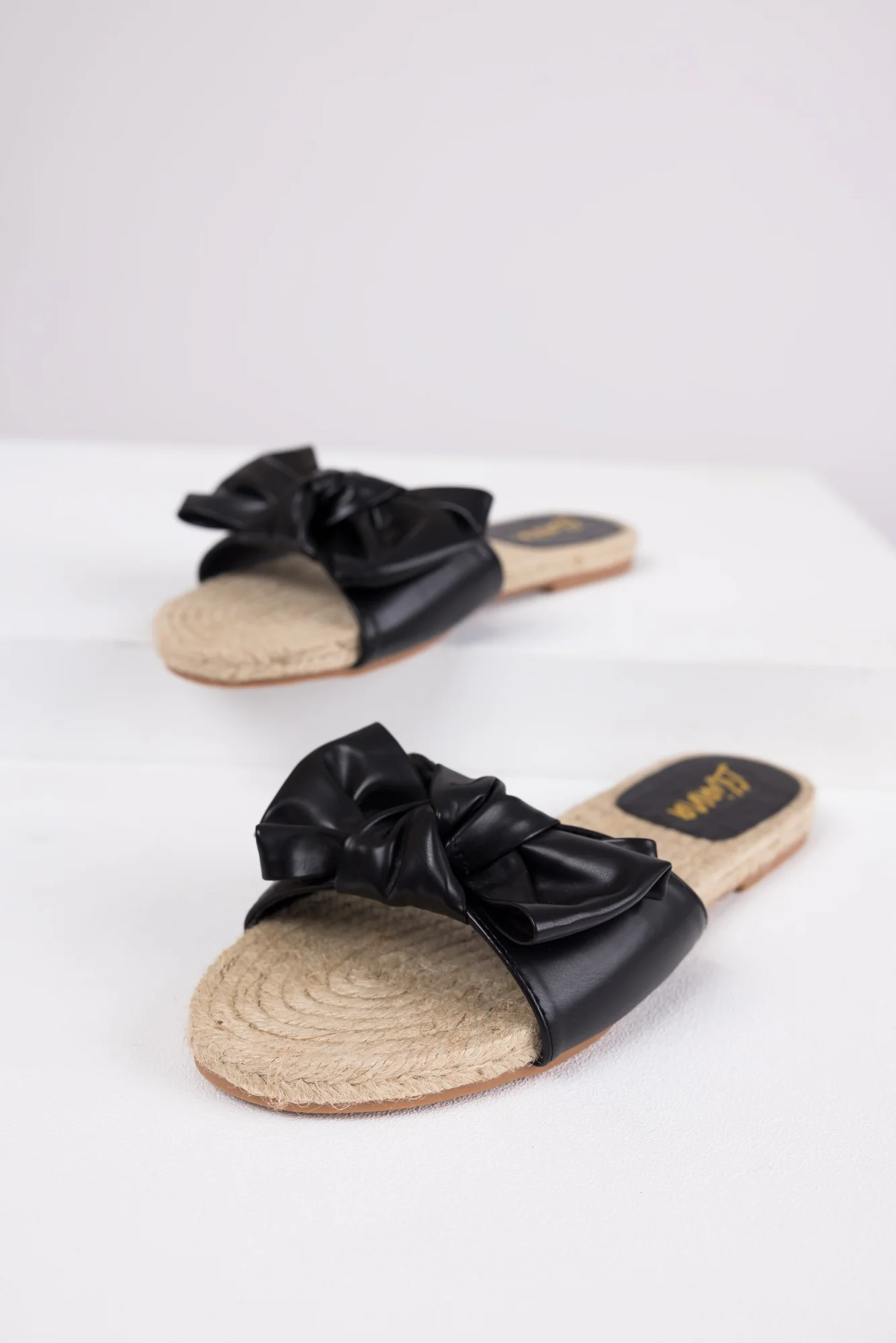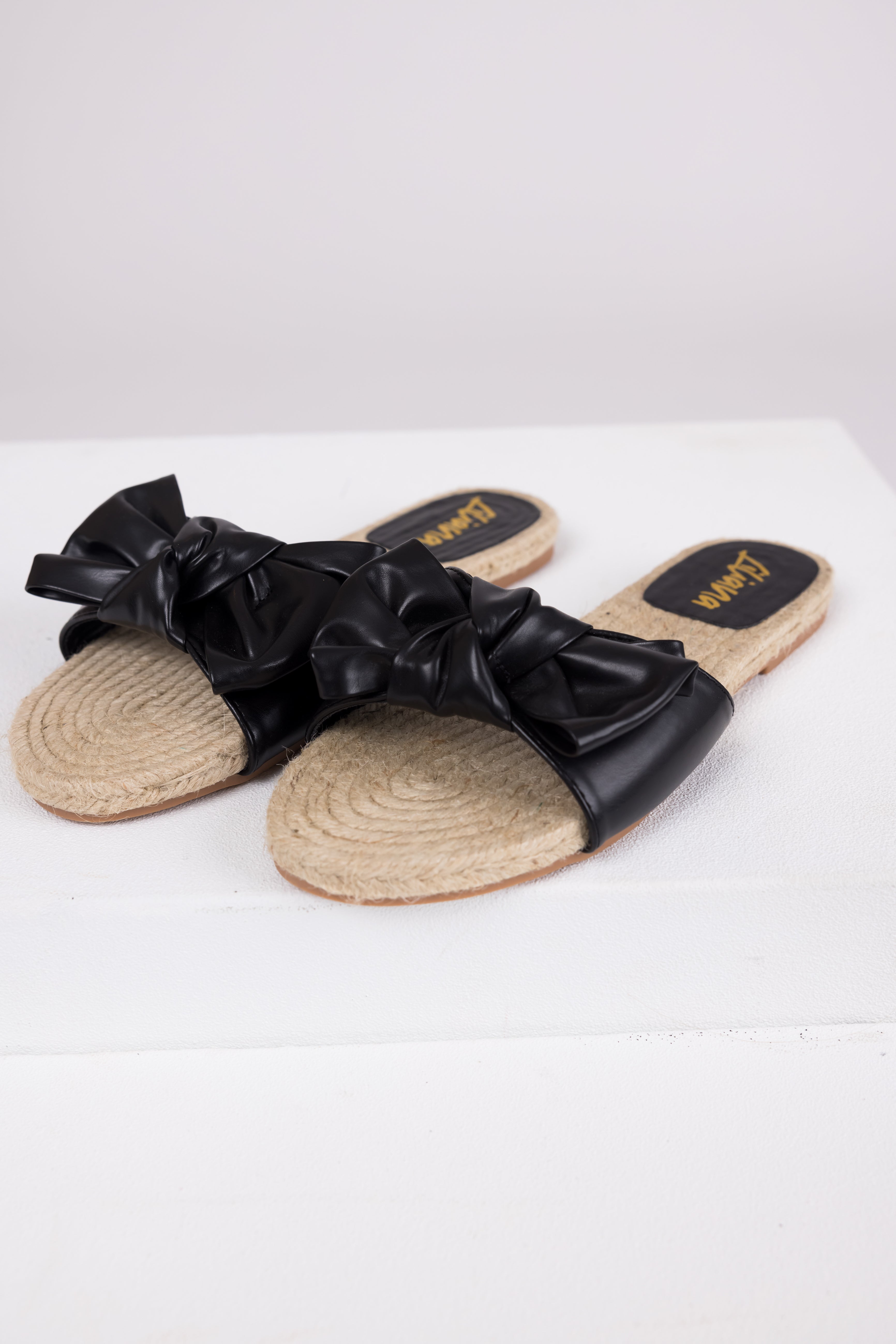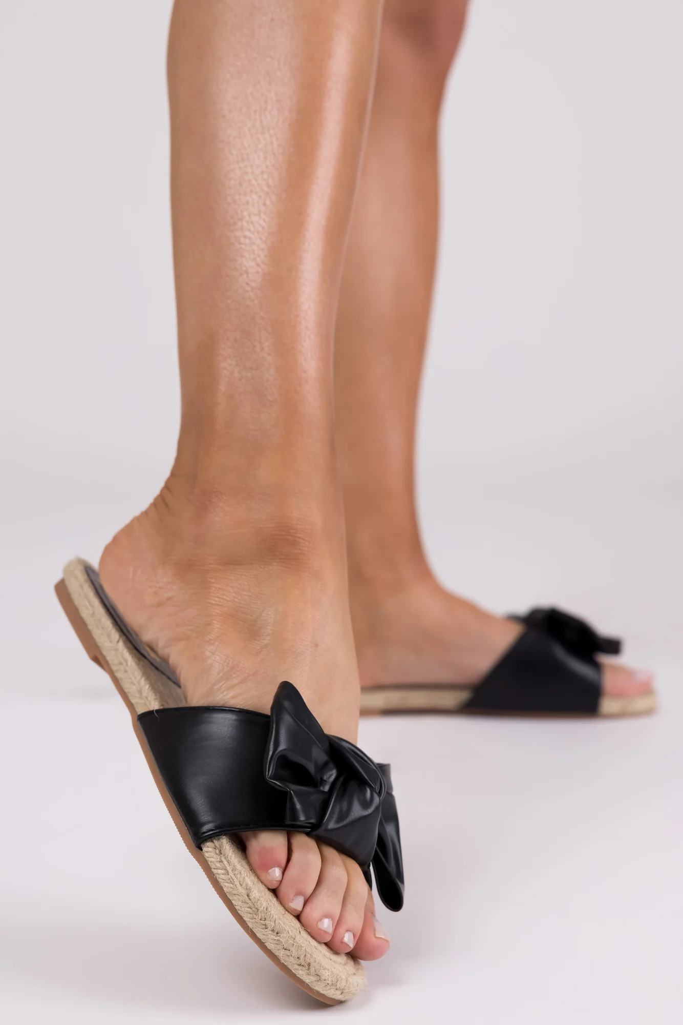 Discover style and comfort combined with these black flat espadrille sandals featuring a bow strap. Made of faux leather, these sandals have an open toe, rounded toe, and easy slide-on design. The heel height is 0.5 inches, and the circumference is 9.5 inches. The strap measures 2 inches. This product is measured on size 8 to ensure a perfect fit for your casual or daytime look. Step out in confidence and style!