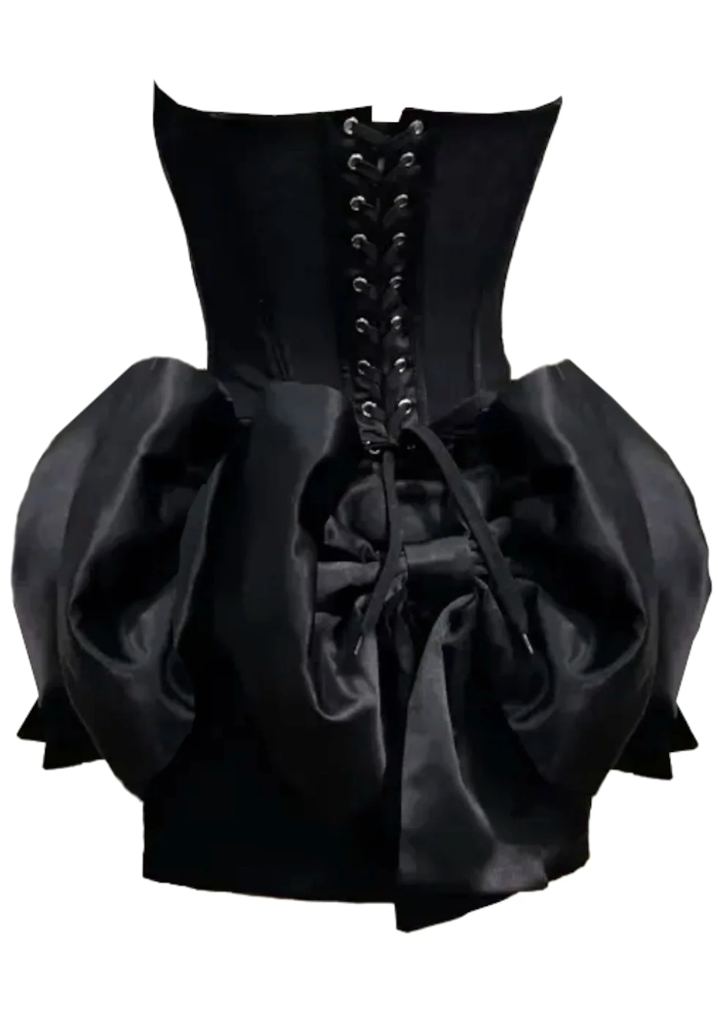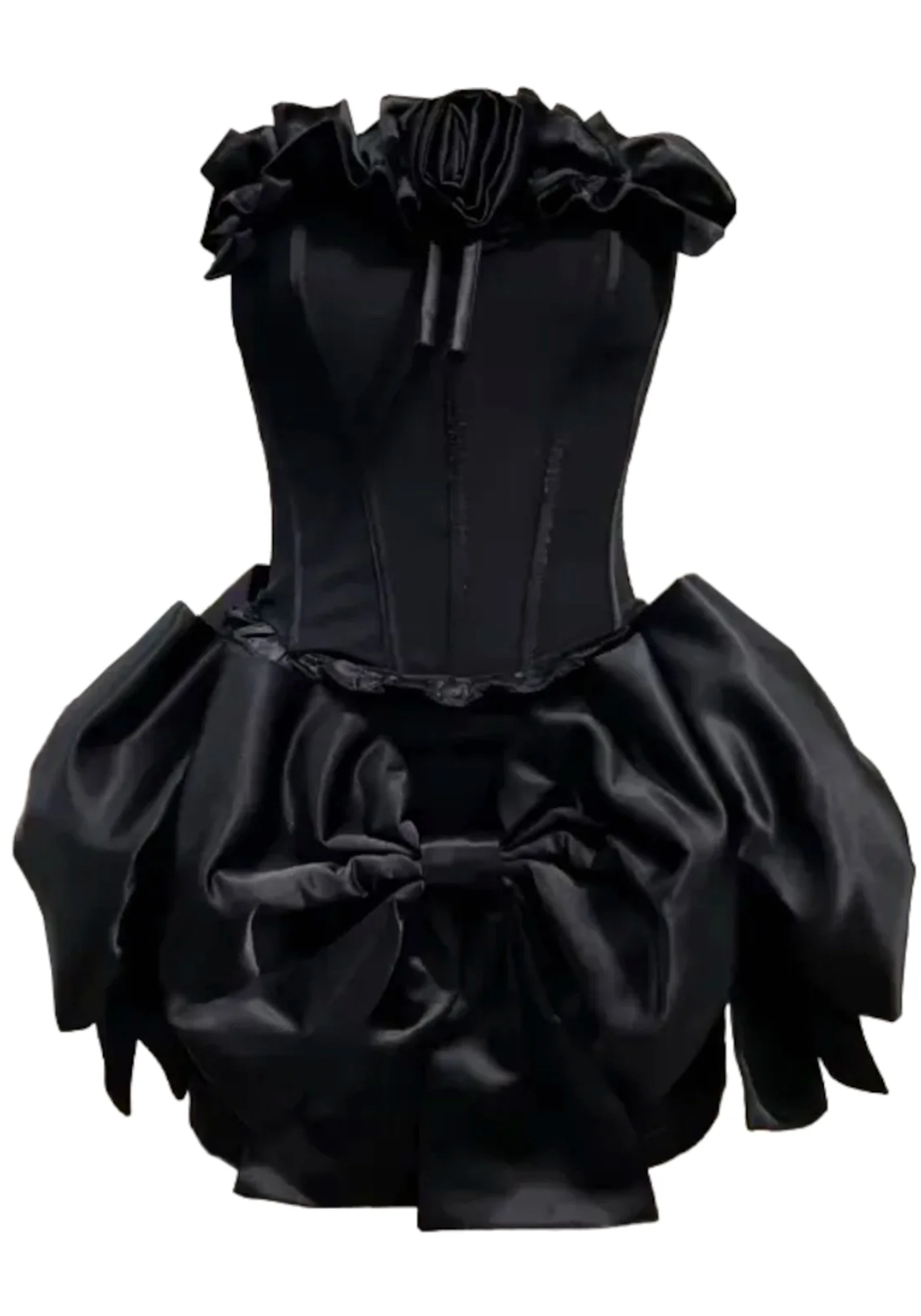 This stunning Black Floral Bow Corset Mini Dress features a strapless and sleeveless design with beautiful floral and bow details. The puff design and corset style enhance your silhouette. Crafted from a blend of Polyester, Cotton, and Silk, this dress is made to last with delicate sewing and durable YKK zipper. Ensure lasting beauty by following the care instructions provided. Experience variation in color due to lighting, while the product images showcase the true item color without models.