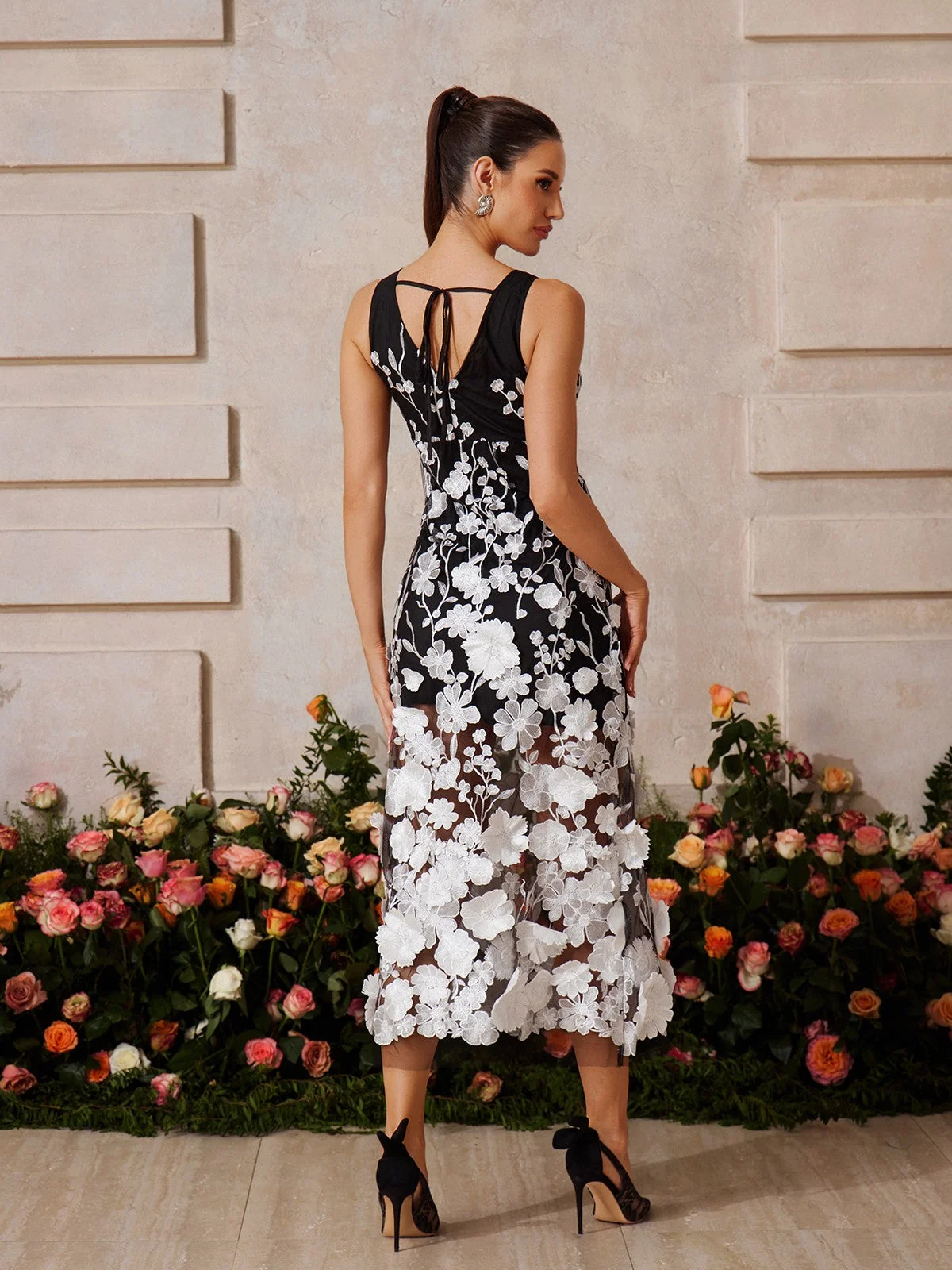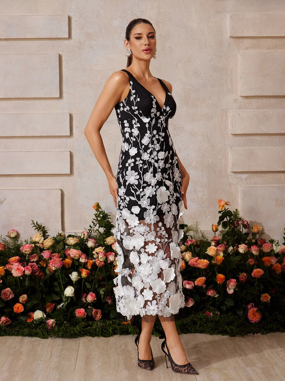 Indulge in elegance with our Black Floral Embroidered V-Neck Midi Dress. Perfect for special occasions or daily wear, this dress features delicate floral embroidery, a flattering V-neckline, and a midi-length silhouette providing graceful coverage with timeless charm. Crafted from 100% Polyester with slight stretch for comfort. The invisible side zipper ensures easy wear. Elevate your style effortlessly with this sophisticated dress that guarantees you stand out with both beauty and comfort. Color variations may occur due to lighting. Dry clean only. Model wears size S.