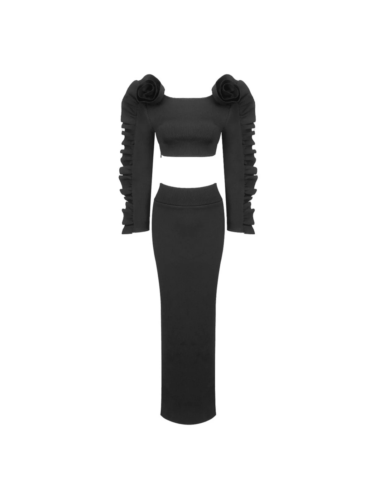 Elevate your style with the striking Black Flower Long Sleeve Skirt Set. Crafted from 100% Polyester, this set features a charming floral design, comfy long sleeves, and an invisible zipper at the back. Whether for a casual outing or a special event, this set will ensure you stand out with its subtle stretch factor. Dry clean only. Please note: Color may vary slightly due to lighting. Images show product color accurately. Model wears size S.