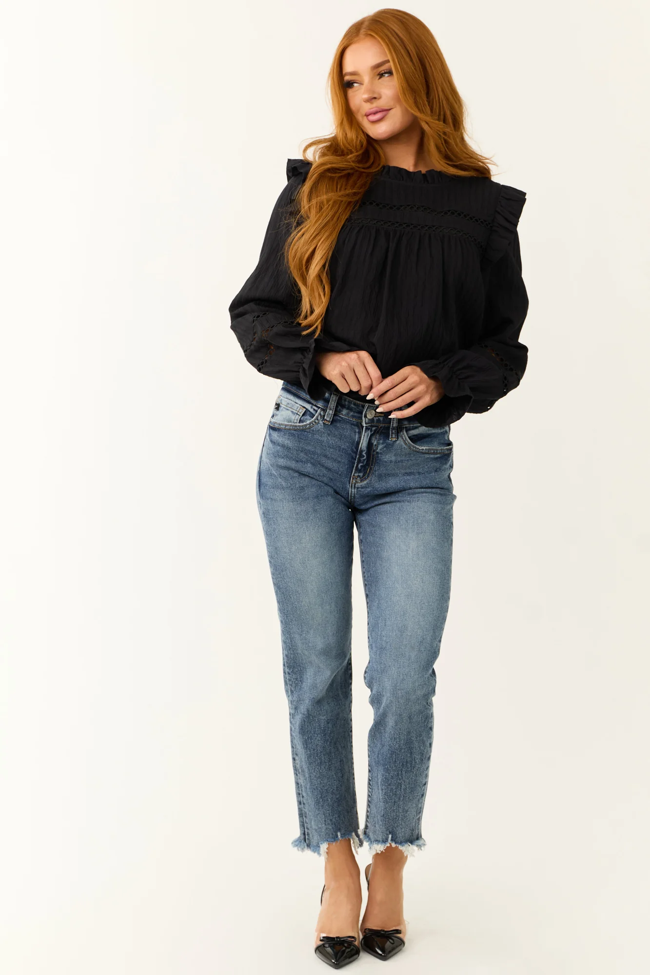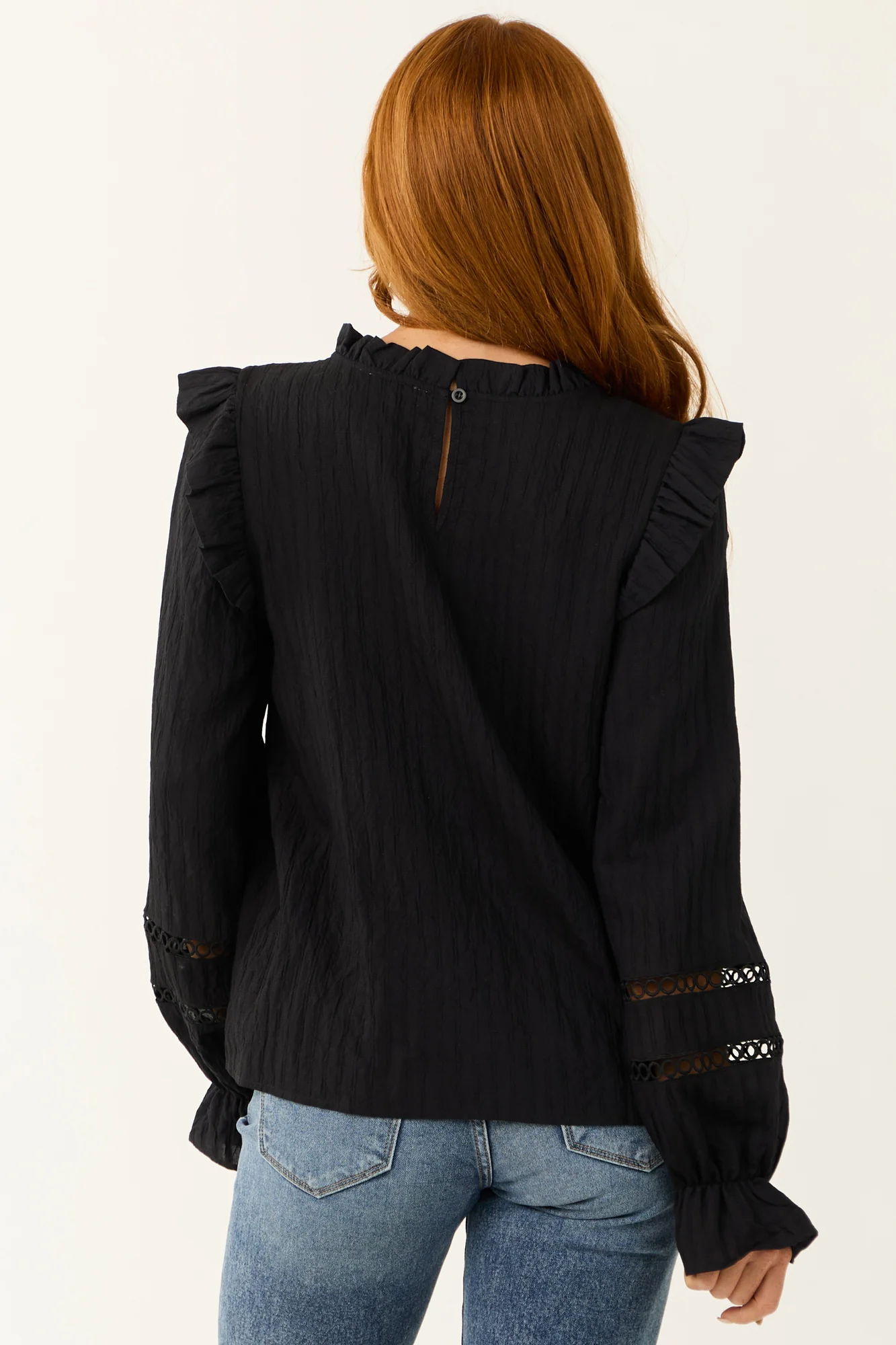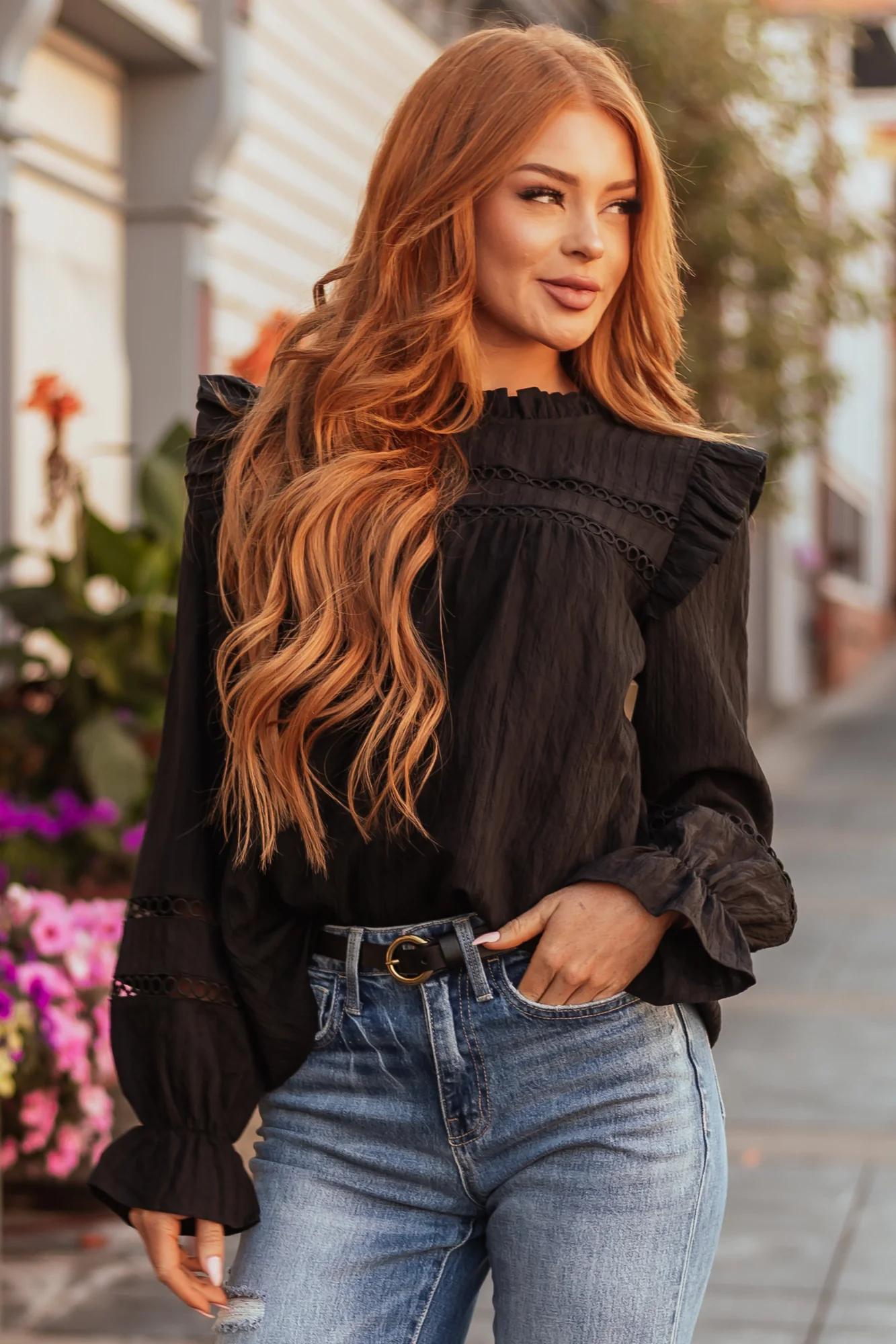 Indulge in sophisticated charm with our Black Frill Neck Long Sleeve Blouse. Crafted from non-stretchy woven fabric, this blouse features a high frill neckline, long puff sleeves, and a keyhole back with button closure. Effortlessly chic and versatile, perfect for daytime or workwear outfits. Hand wash cold, dry flat, for best care. Available in sizes S, M, L, and XL. Model is wearing a size Small.