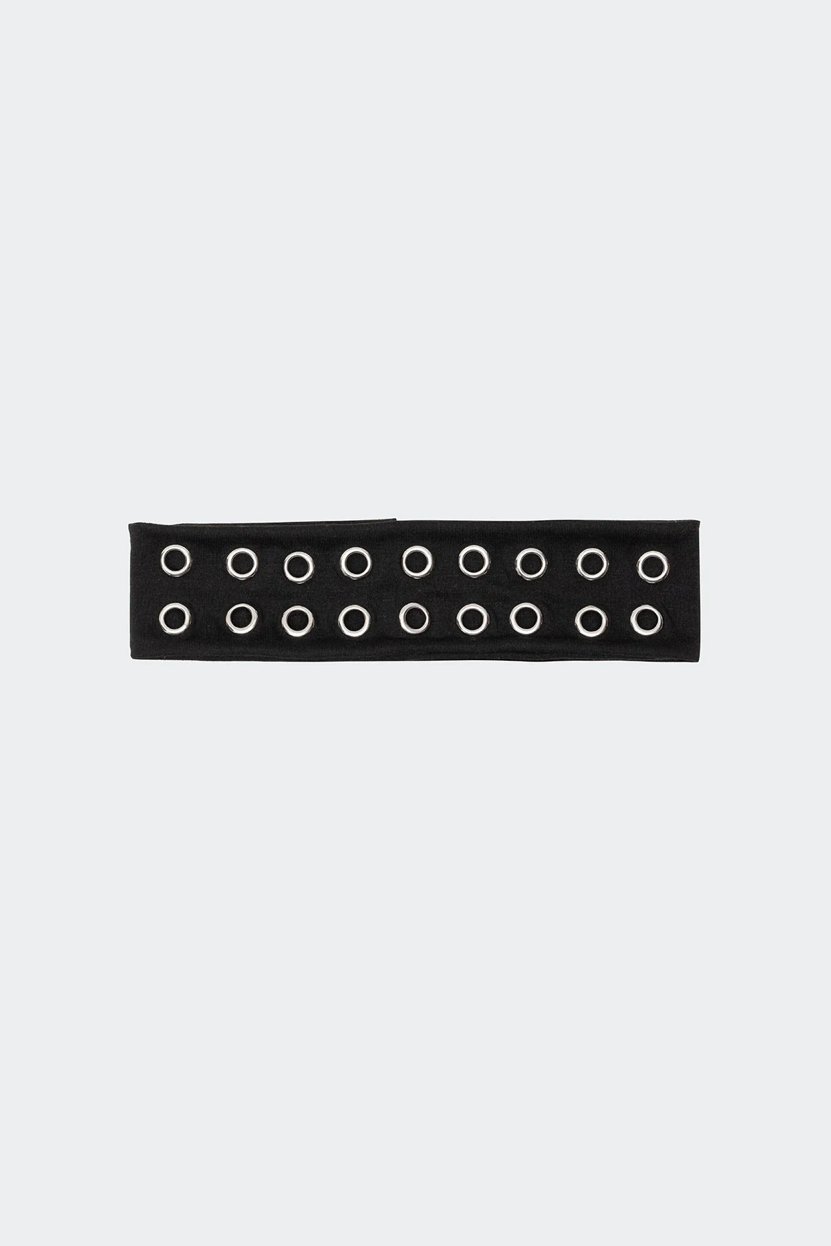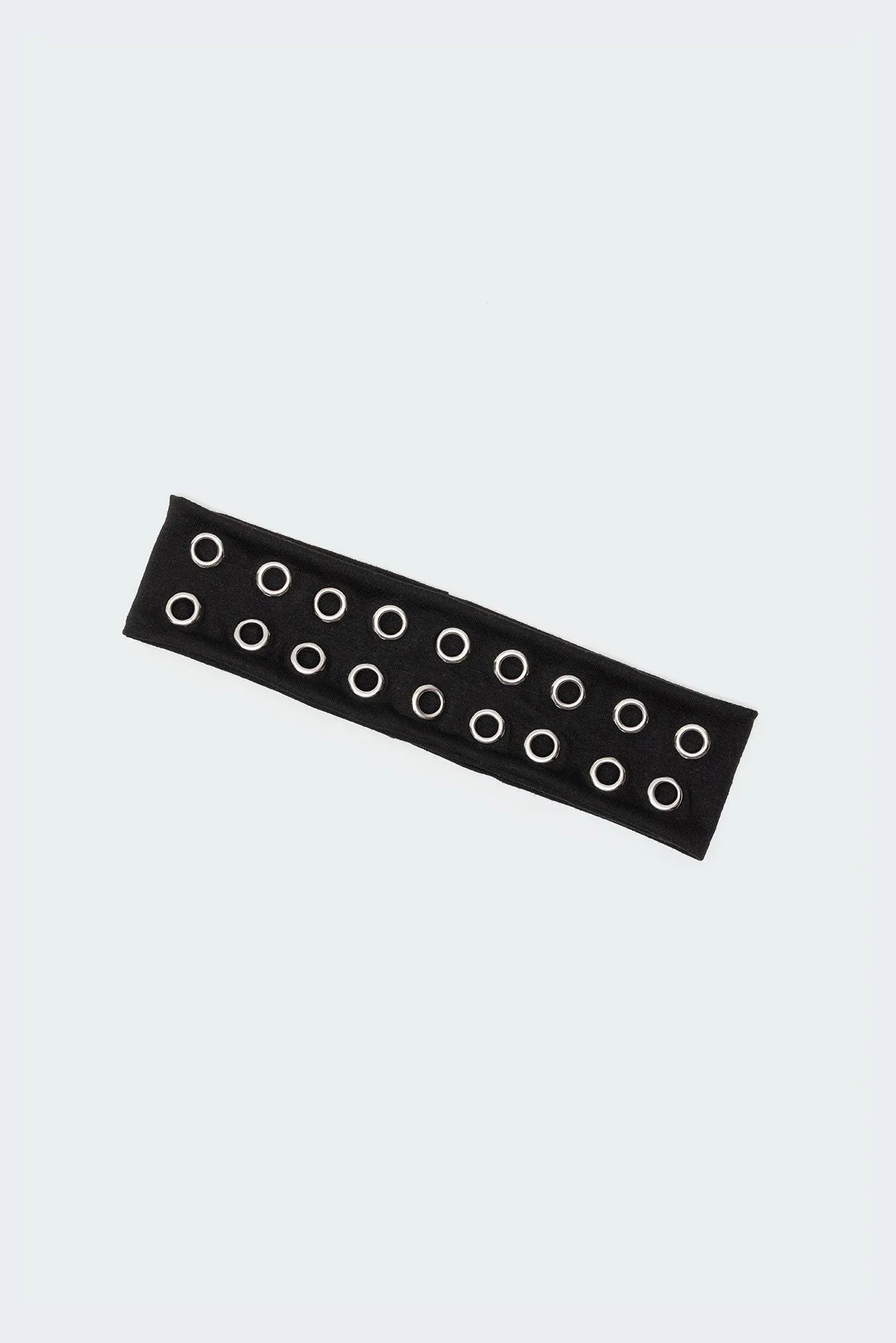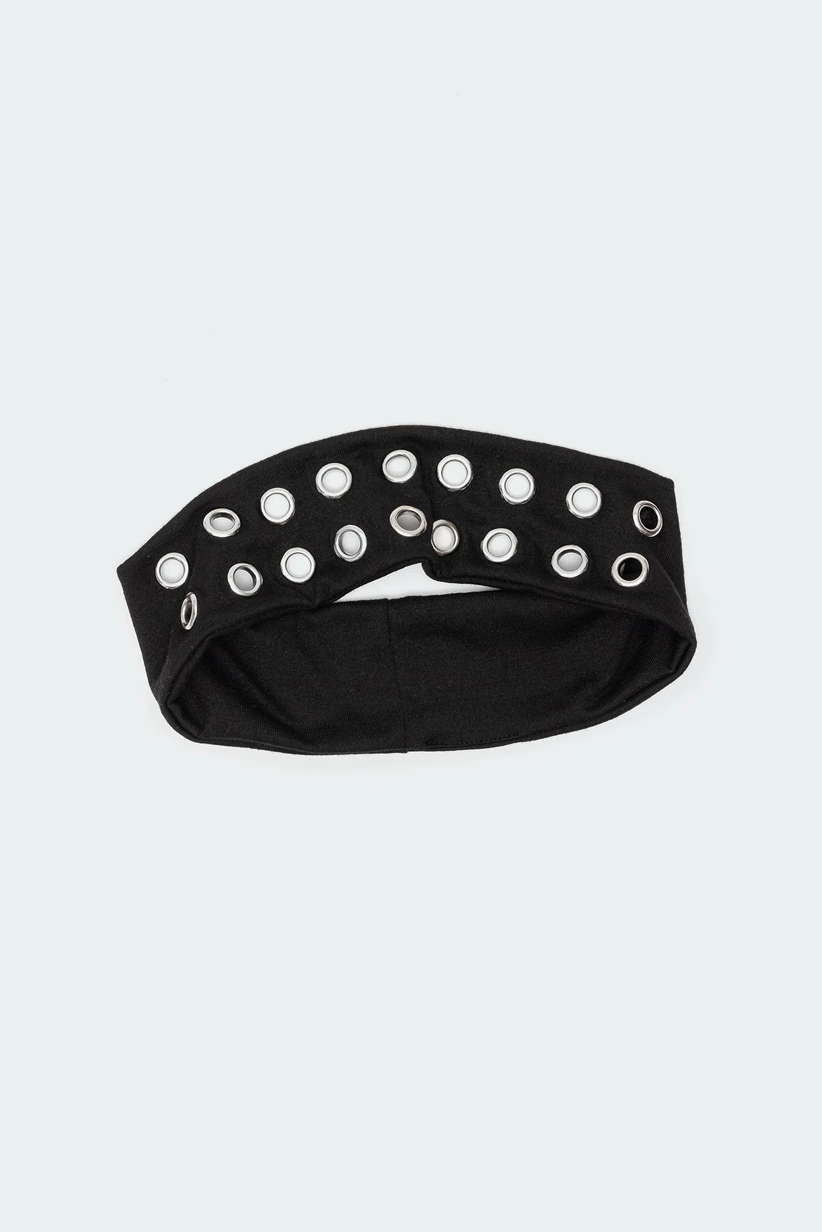 Upgrade your hair accessories collection with our stylish black headband featuring grommet detailing. Made of polyester and iron, this headband is designed to elevate your look effortlessly. The length is 9.1 inches. For care instructions, machine wash at a maximum of 30ºC, do not bleach, do not tumble dry, iron at a maximum of 110ºC, and do not dry clean. Add a touch of sophistication to your outfit with this versatile accessory.