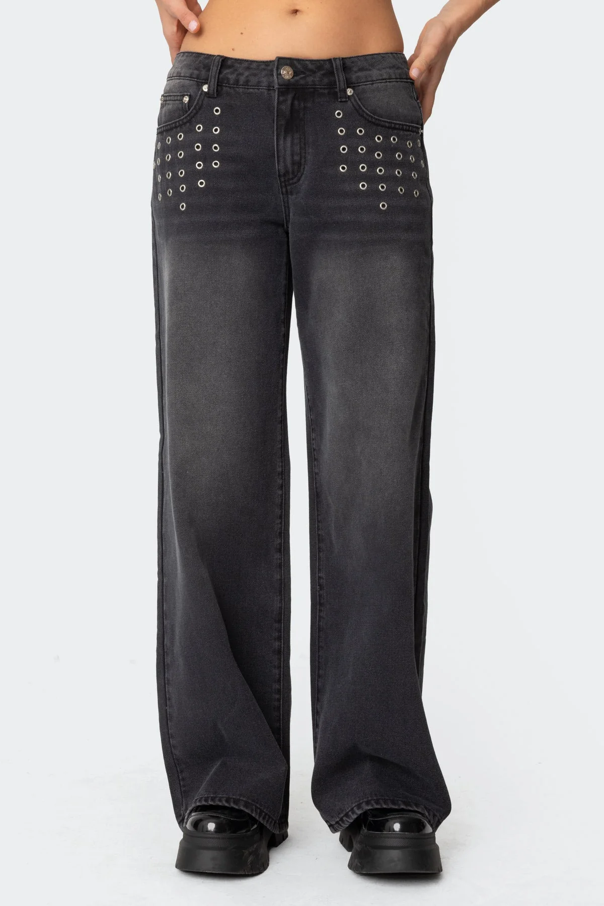 Upgrade your wardrobe with our trendy black grommet wide-leg denim jeans for women. Crafted from high-quality cotton denim, these jeans feature a low-rise waist and baggy fit, complemented by stylish grommet pocket detailing. Easy to care for, these jeans are machine washable. Available in sizes XS, S, M, L, and XL. Elevate your style with these versatile black jeans today!