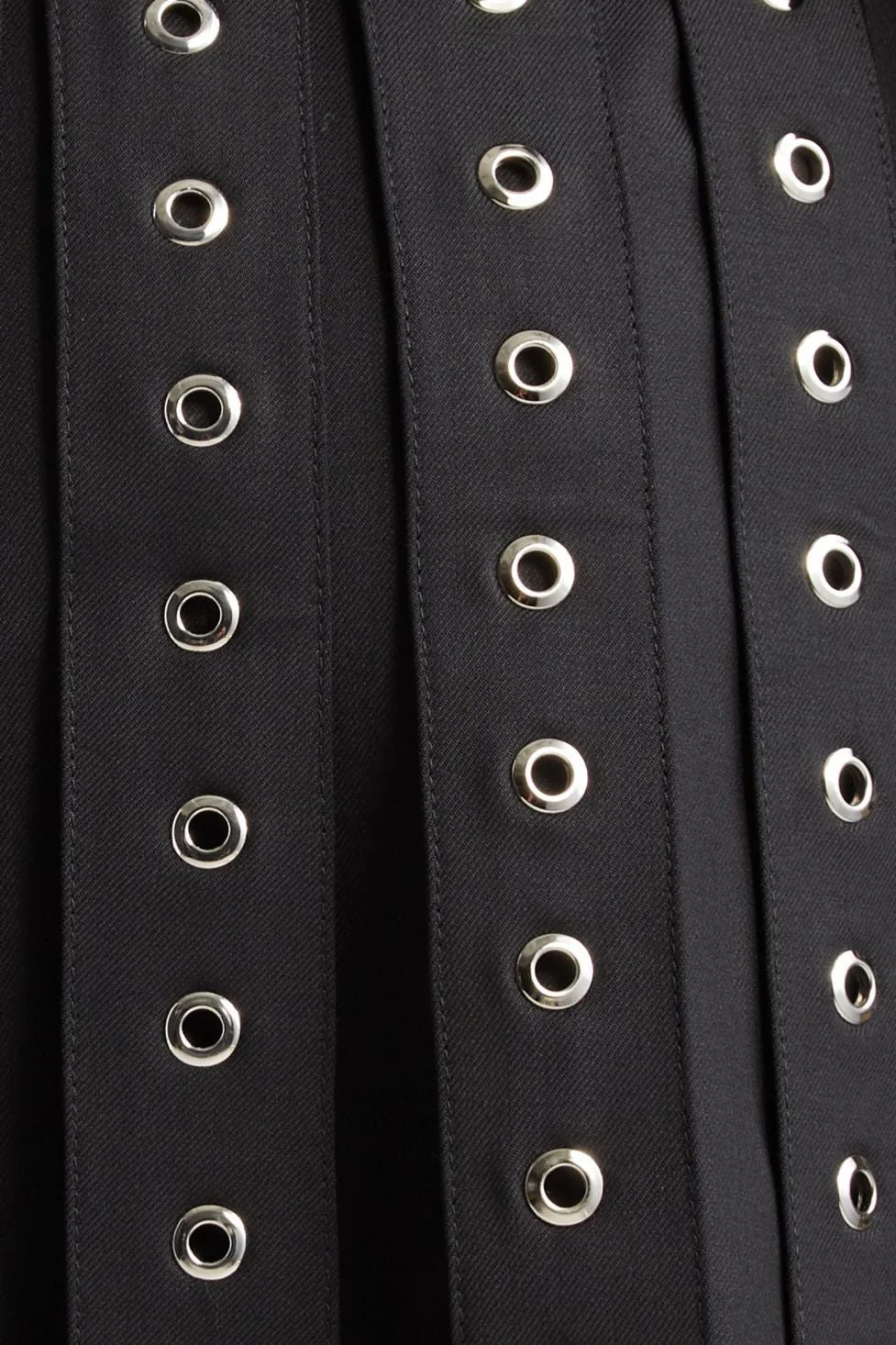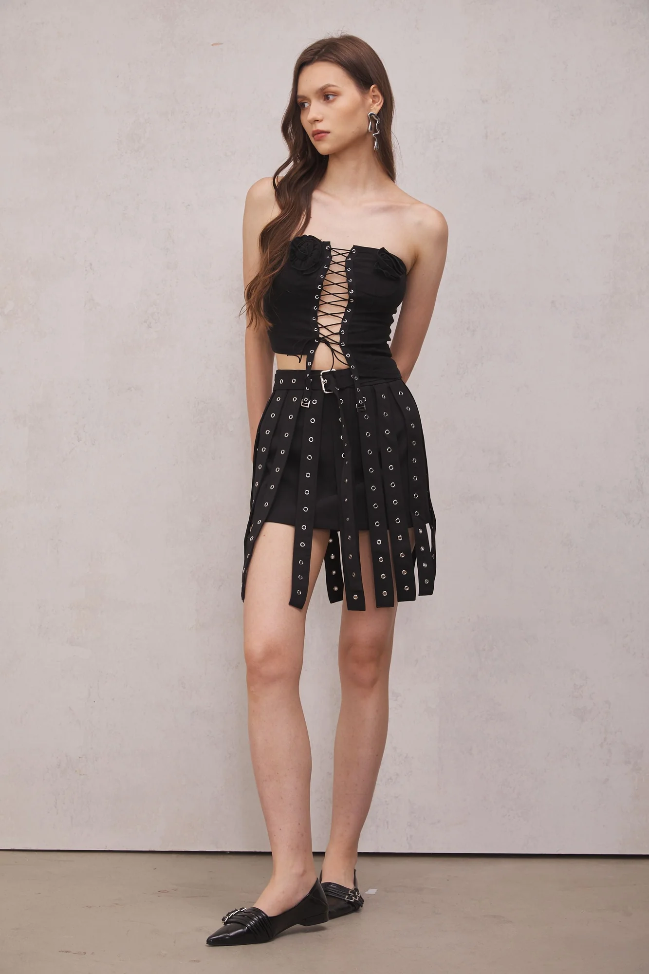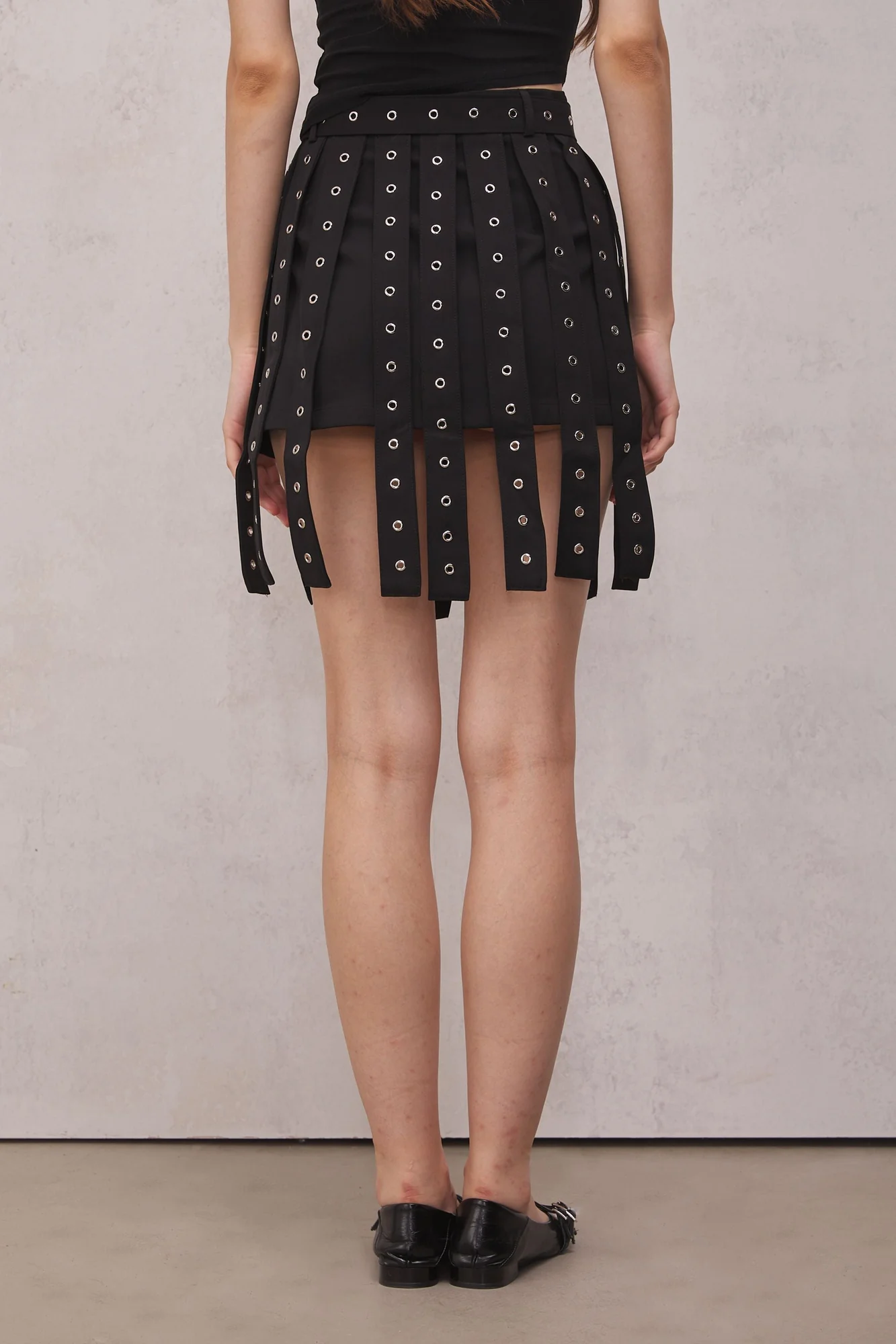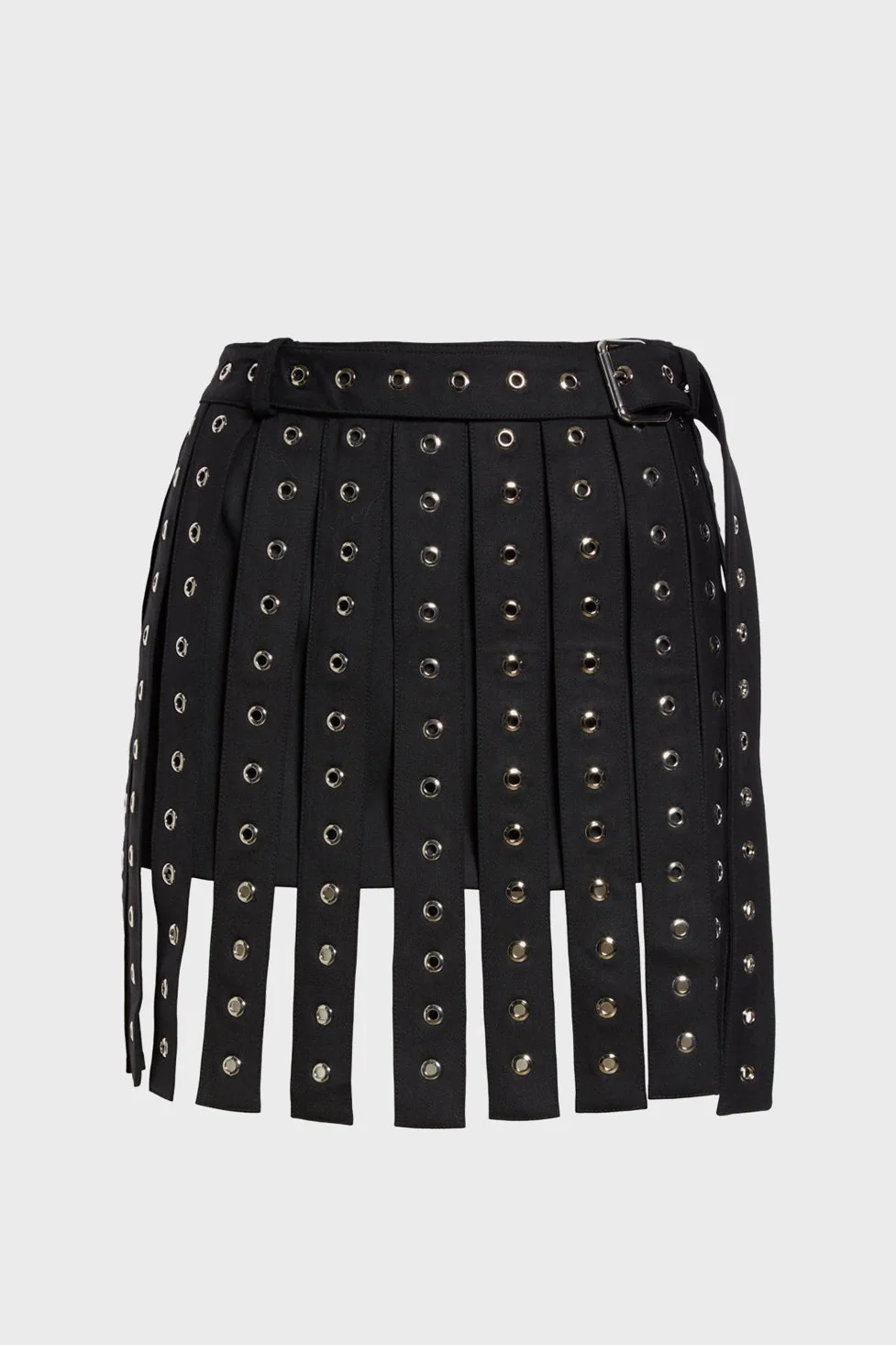 Elevate your look with the sleek and stylish Black Grommeted Mini Skirt in polyester. Featuring modern grommet accents, this versatile skirt is perfect for any occasion. Crafted with high-quality materials for a chic touch. A wardrobe essential for fashion-forward individuals. The skirt is non-stretch and can be gently machine washed for easy care. Please note that color variations may occur due to lighting. Own this exceptional piece today!