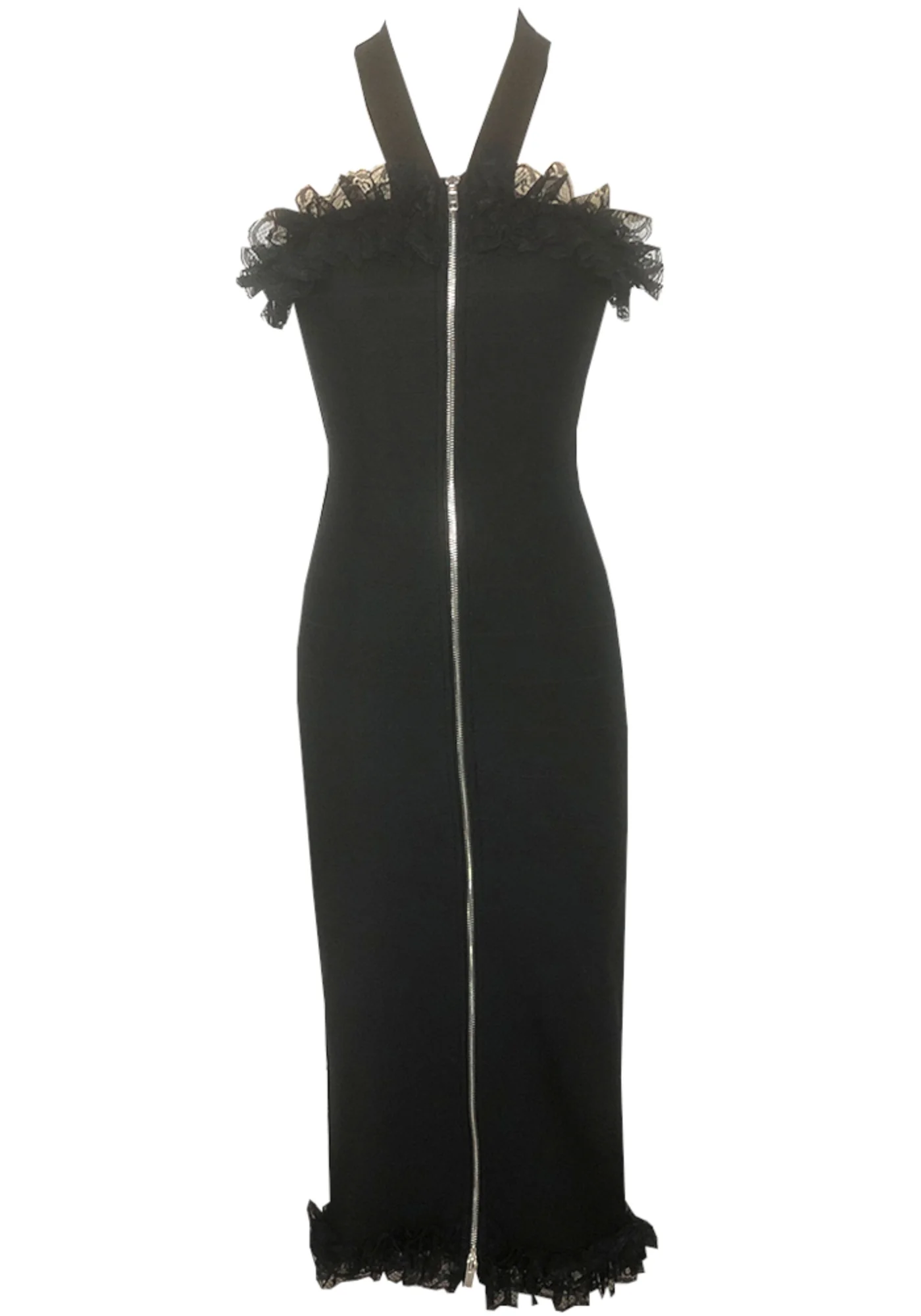 This Black Halter Mesh Ruffle Midi Dress is a stunning choice. Halterneck design with mesh insert and ruffle detail. Crafted from 90% Rayon + 9% Nylon + 1% Spandex for quality, brightness, and durability. Anti-wrinkle and high elasticity ensure a perfect fit. Features YKK zipper and meticulous stitching. Care instructions included. Add this elegant midi dress to your wardrobe today!