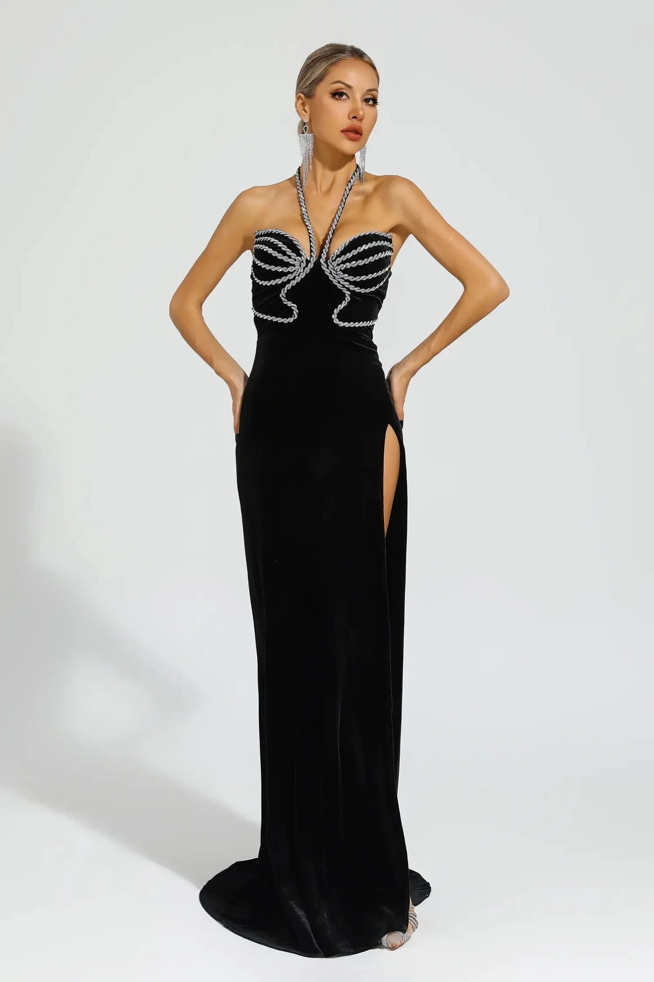 Indulge in elegance and allure with the Black Halter Neck Diamond Embellished Maxi Dress. Featuring a stylish halter neck and alluring backless design, this dress exudes sophistication. The diamond embellishments add a touch of glamour, while the form-fitting silhouette and thigh-high slit beautifully showcase your curves. Perfect for special occasions and every fashion-forward individuals wardrobe. This dress is approximately 143cm long, made of polyester, and requires gentle dry cleaning. Embrace the perfect fit based on our size chart recommendations for a stunning look. *Images may vary in color due to lighting conditions.