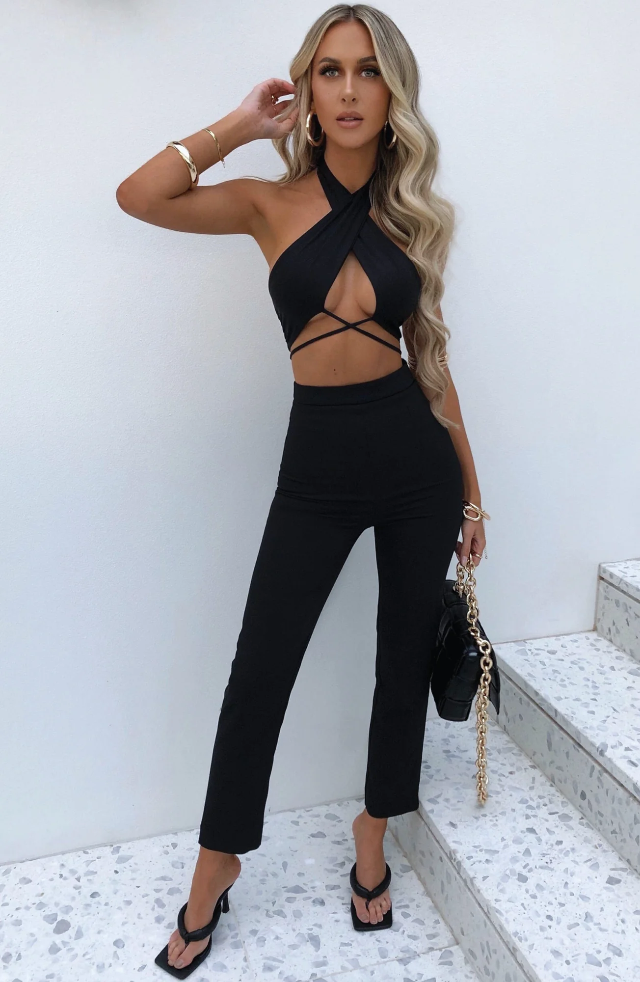The Black Halter Neck Mackenzie Top is crafted from Polyester Spandex material, featuring a double-layer design with a halter neck bust and adjustable tie-up. This top showcases a chic skinny criss-cross tie at the waist with silicone grip tape for a secure fit. Pair it with ourKimora Pants in Blackfor a complete look. Available in sizes XS, S, M, L, XL, and XXL. Elevate your style with this versatile and trendy top.