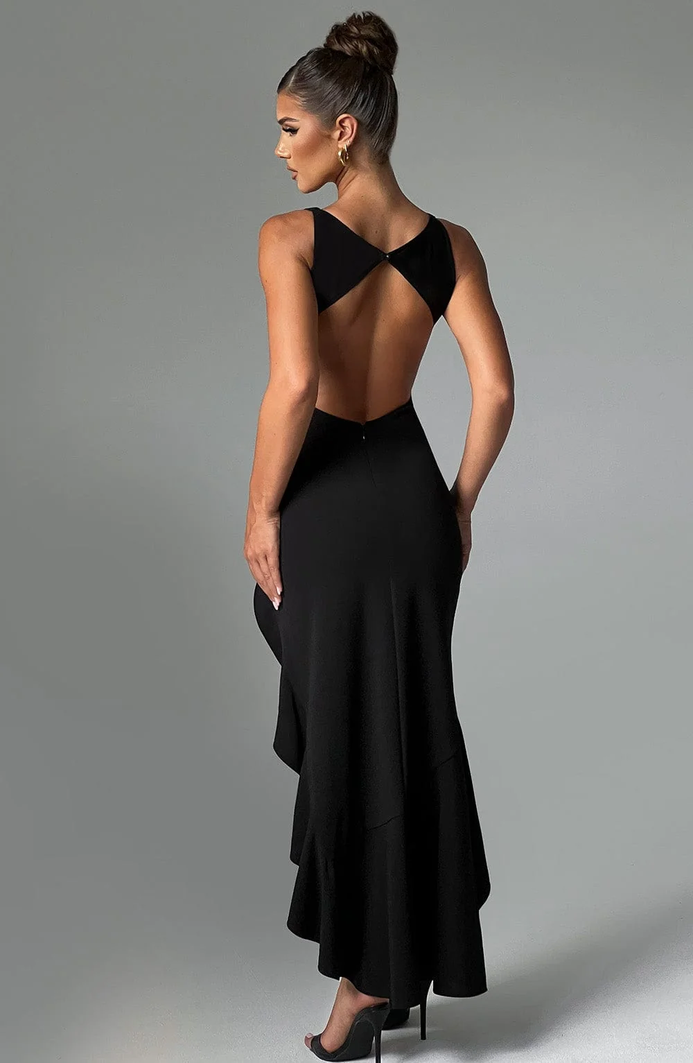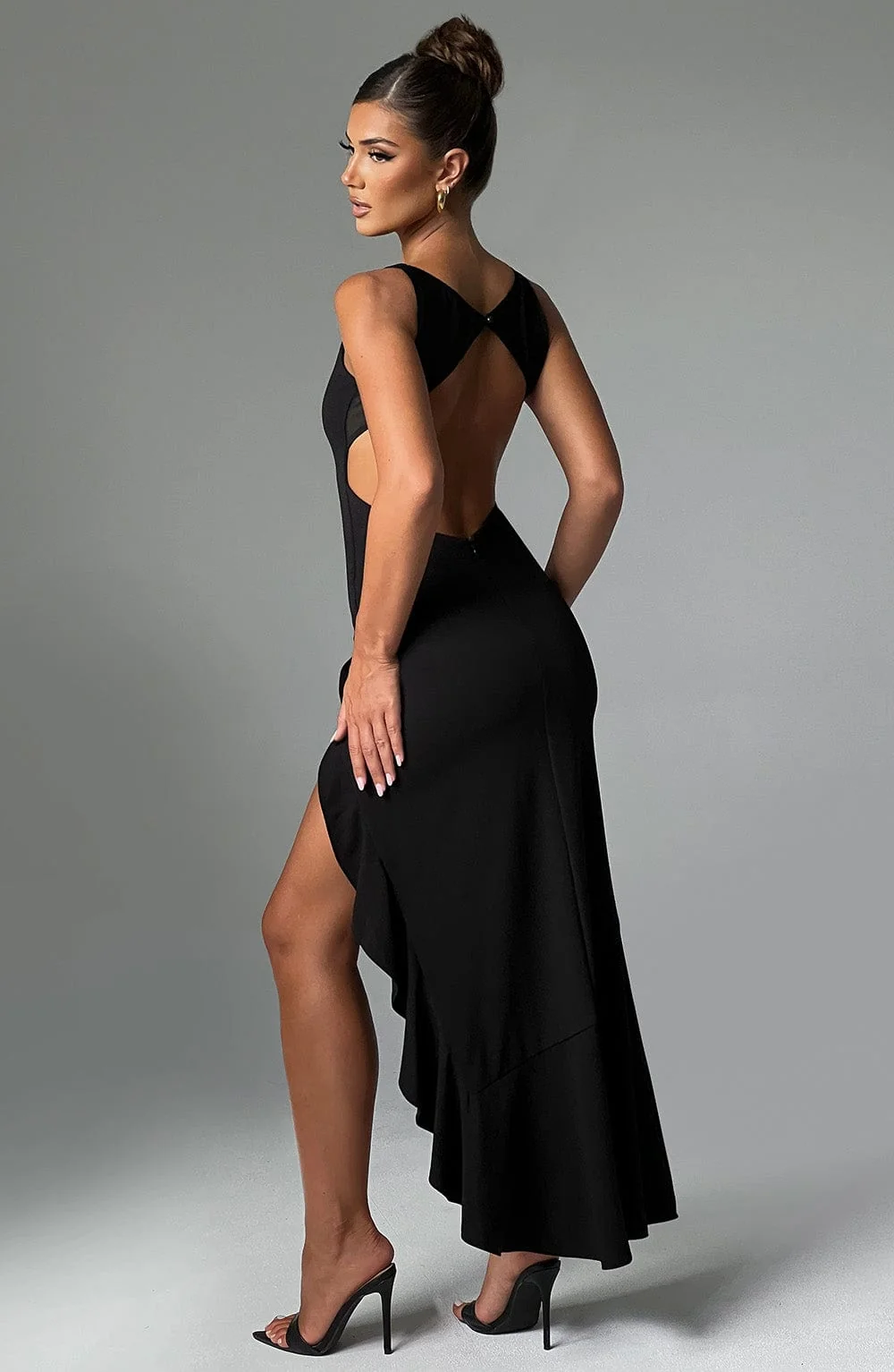 Step into elegance with our Black High Neck Maxi Dress, designed for special events and late nights. This premium double stretch crepe dress accentuates your figure, featuring a stunning low back with delicate mesh panels, a double frill detail skirt, and a thigh-high split. Look glamorous and feel confident effortlessly. The dress is fully lined, molds to your body, and is finished with an invisible zipper at the back. Elevate your style with this exquisite piece!