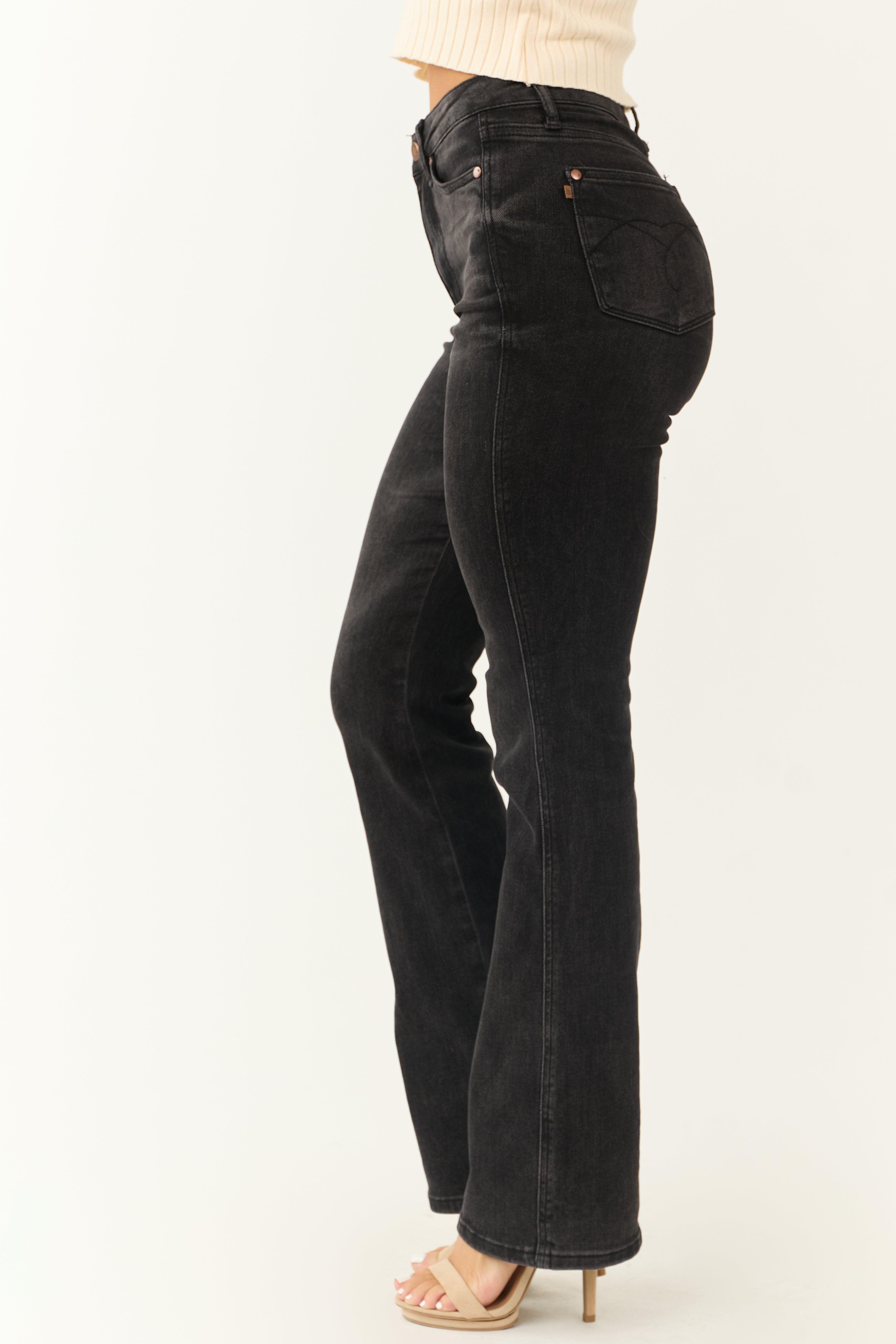 Upgrade your wardrobe with these stylish Black High Rise Bootcut Jeans featuring tummy control. Made of 69% Cotton, 23% Polyester, 7% Rayon, and 1% Spandex for a comfortable fit. The stretchy material allows for 1-3″ extra in the waist. These jeans have a zipper fly with button closure, 5 pockets, and a front rise of 10″. Suitable for casual and daytime wear, these jeans are versatile and easy to care for. Available in waist sizes 23″ to 31″ and inseam length of 31.5″. Model is wearing a size 3. Hand wash cold, wash dark colors separately, do not bleach, lay flat to dry, low iron.