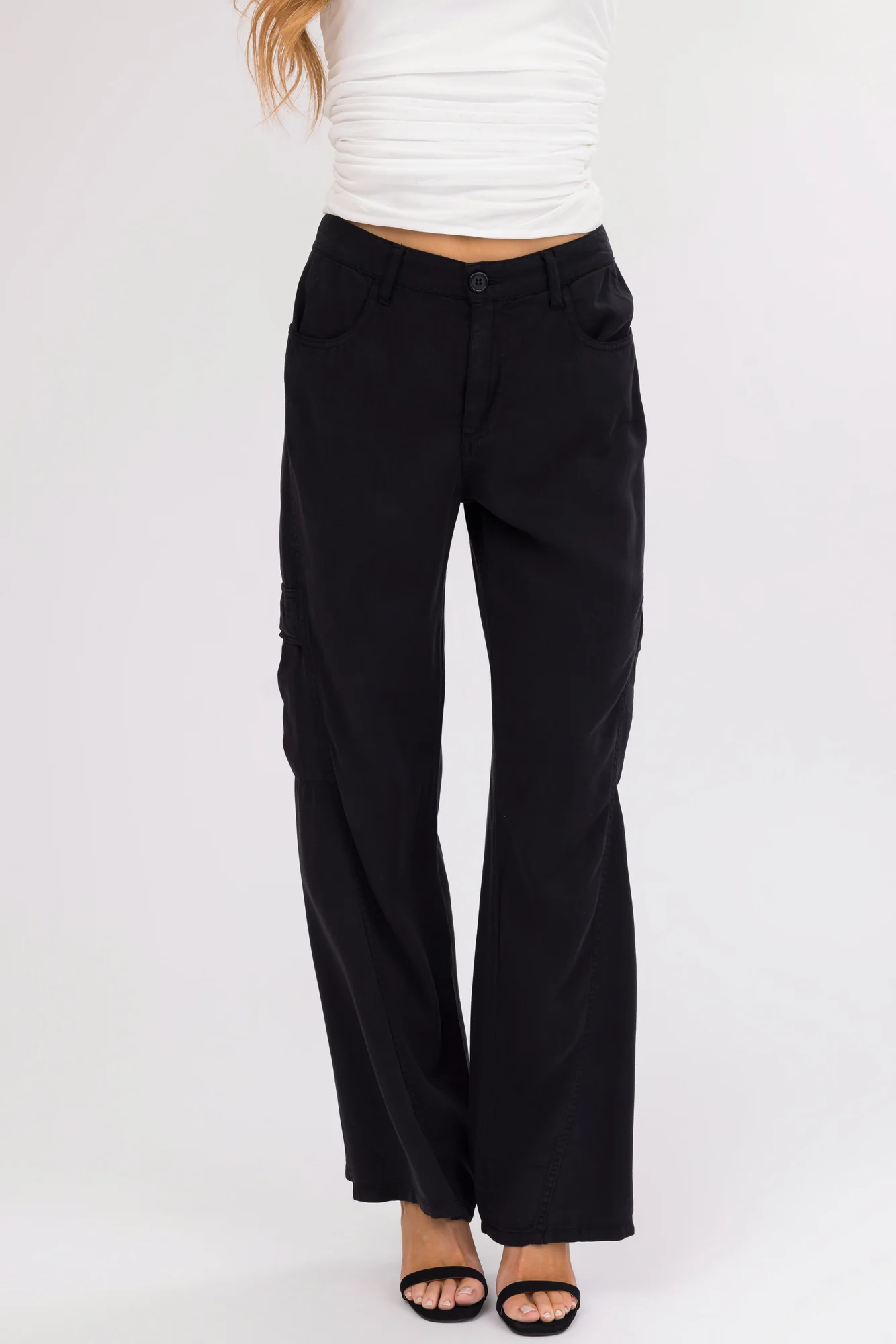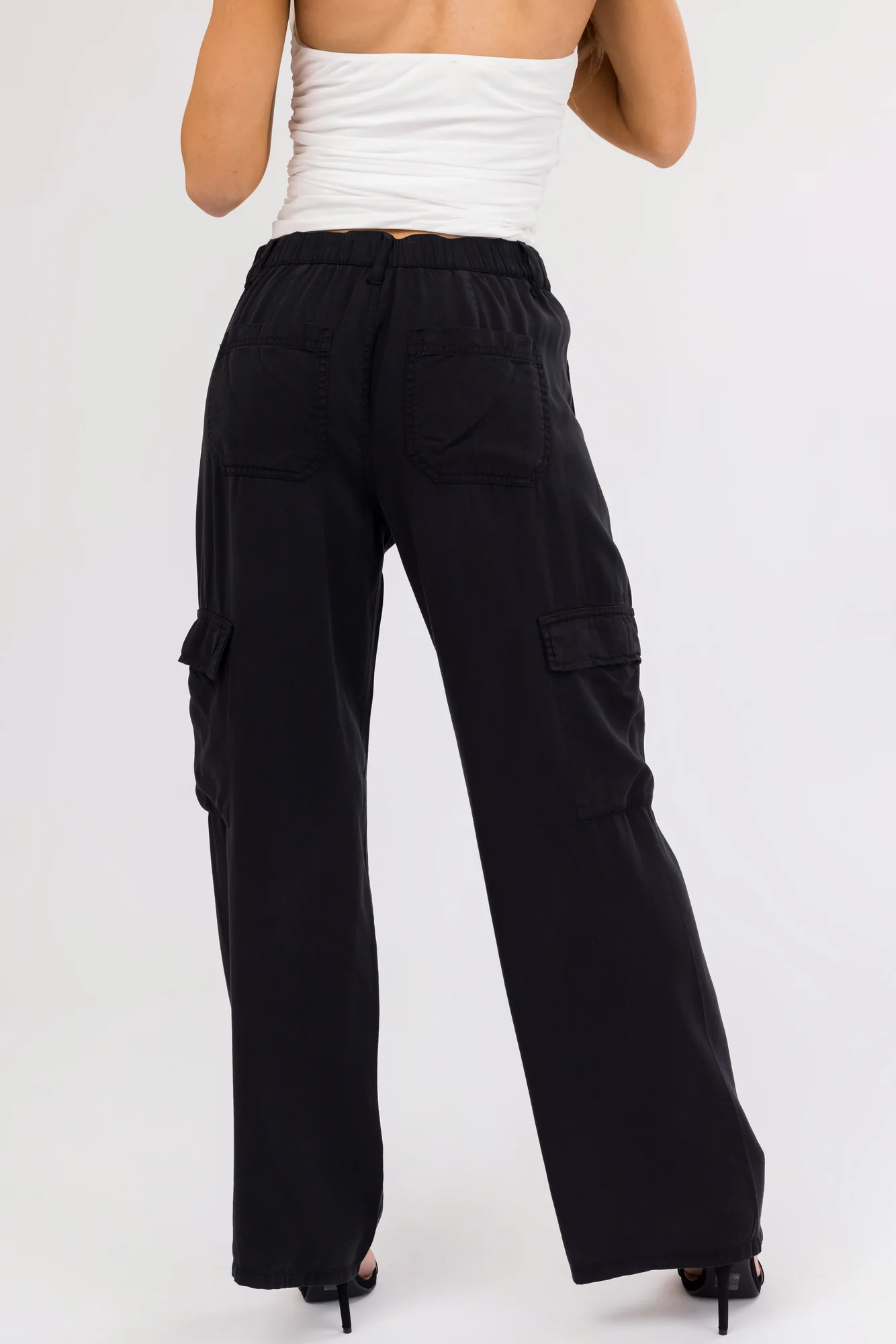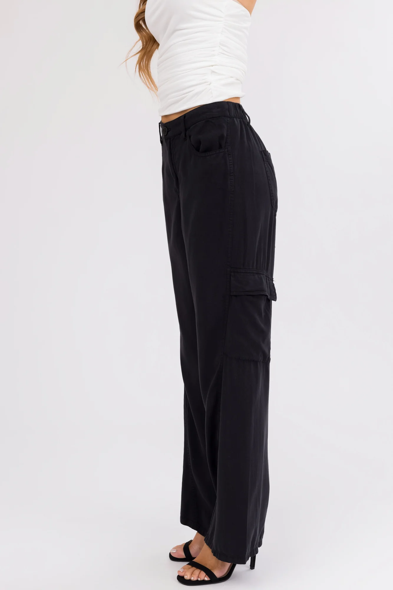 Step up your style with our Black High Rise Soft Lightweight Tencel Cargo Pants! Crafted from 100% Tencel, these cargo pants offer non-stretch comfort, featuring a wide leg design, zipper fly with button closure, 4 pockets including 2 cargos, and elastic back waist for a perfect fit. Ideal for everyday wear, these trendy pants have a front rise of 10and back rise of 12. Easy to care for and versatile for any occasion. Available in sizes S, M, L, XL.