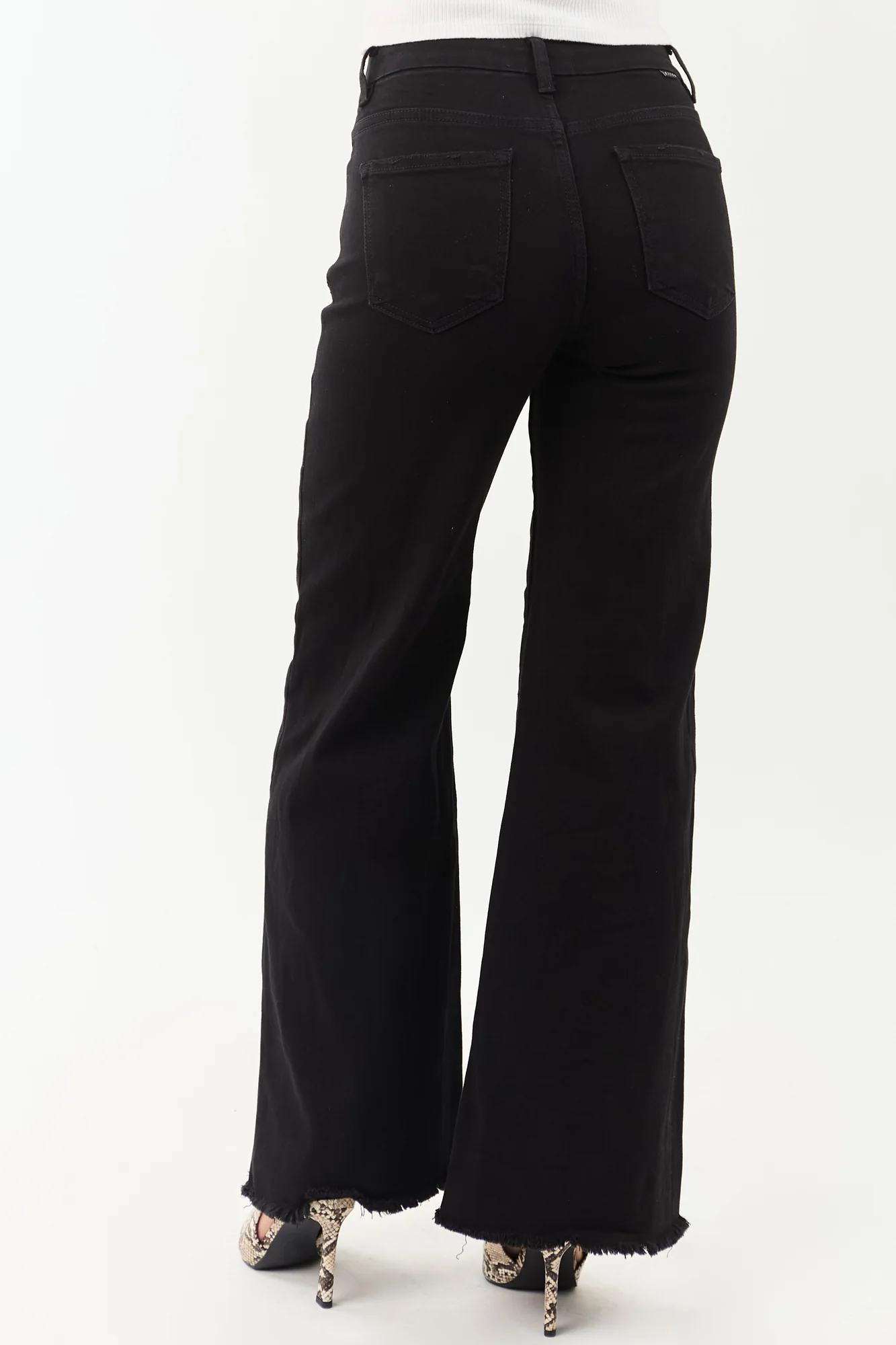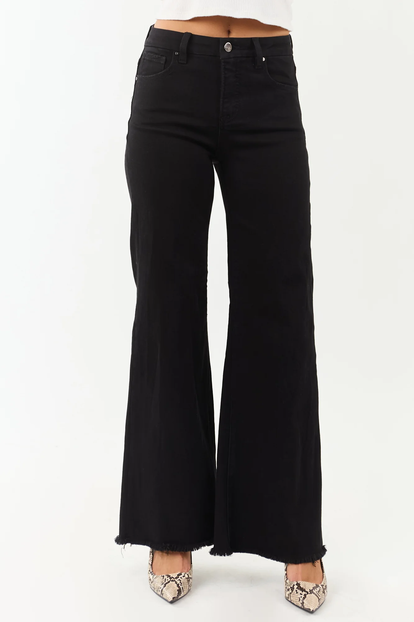 Discover the ultimate in comfort and style with our Black High Rise Wide Leg Stretchy Jeans for Women. Crafted from sleek, stretchy denim, these jeans feature tummy control and a high rise fit that flatters your figure. With a trendy frayed hem, zipper front, and button closure, they offer both fashion and function. The 5 functional pockets and belt loops add practicality, while the light distressing on pockets adds a touch of edgy flair. Made of 63.5% Cotton, 22.3% Polyester, 12.6% Rayon, and 1.6% Spandex, these jeans combine comfort and style effortlessly. Perfect for all-day wear, these jeans have an inseam of 31 inches. Embrace the style confidently knowing they fit true to size.