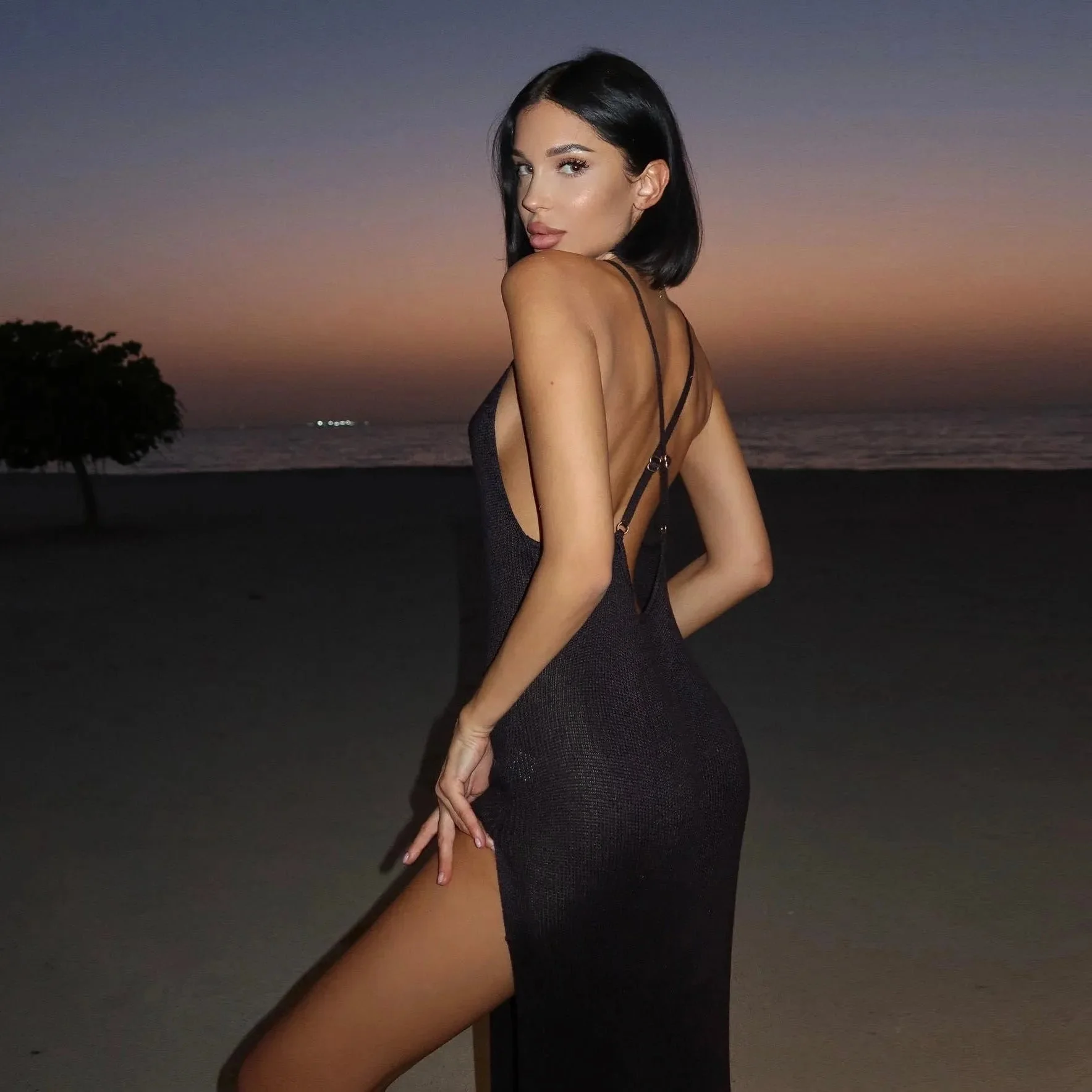 Elevate your style with confidence in this Black High-Slit Maxi Dress featuring a deep V-neckline and a sleek, body-hugging silhouette that enhances every curve. The floor-length design flows effortlessly, creating a dramatic appeal. Double thigh-high slits add movement and allure, making every step graceful and bold. The open-back design ensures you turn heads from every angle. Ideal for evening events, beachside parties, or special occasions. Pair with strappy heels for a flawless look. Discover more styling tips on Instagram @mermaid_way. Enjoy a complimentary exchange for size discrepancies.