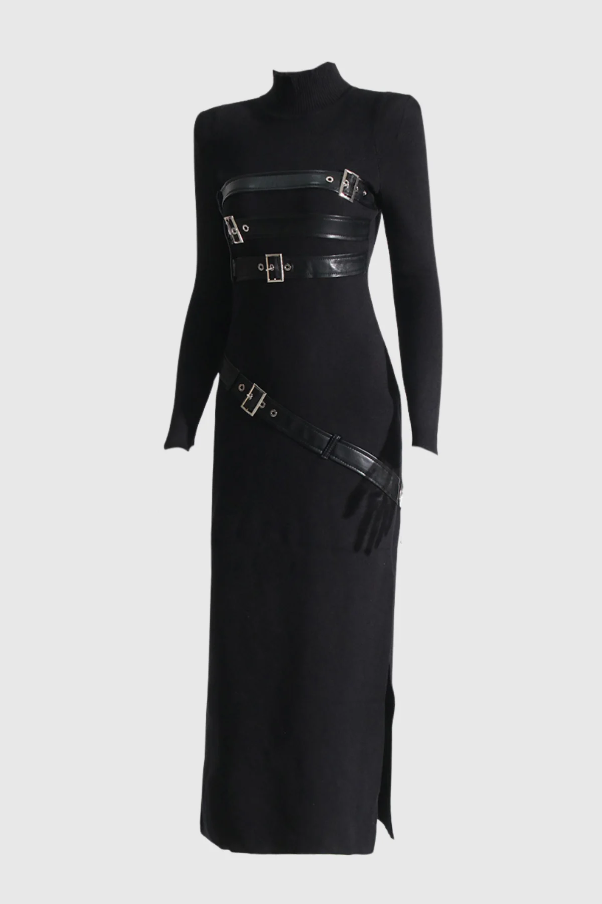 Upgrade your wardrobe with this chic and versatile Black Knit Maxi Bodycon Dress with Buckle Embellishments . Crafted from 100% Polyester knit fabric for slight stretch, this dress features a flattering bodycon silhouette and unique buckle embellishments. Perfect for any occasion, this must-have dress is machine washable for easy care. Elevate your style effortlessly! The color may vary slightly due to lighting during photography. Obtain this fashion-forward piece now!