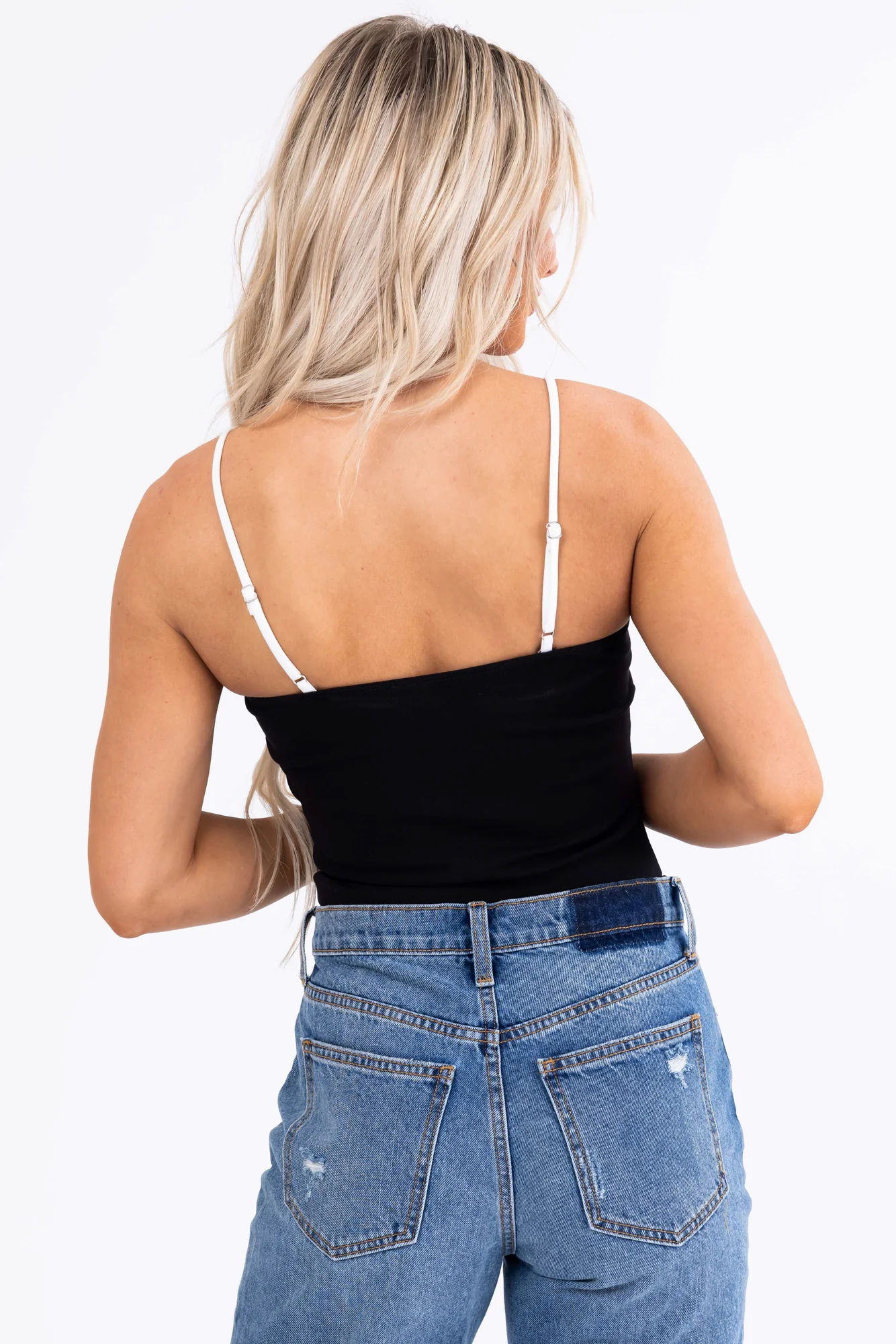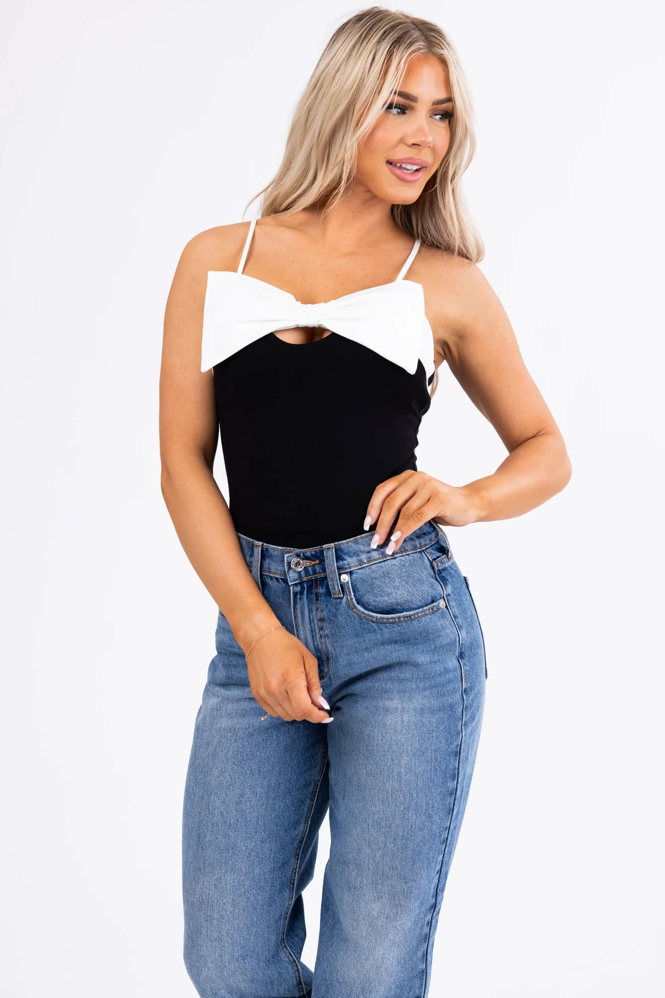 Indulge in luxurious comfort with our Black Knit Spaghetti Strap Bodysuit featuring a chic White Bow Detail. Crafted from a stretchy knit blend, this bodysuit offers an adjustable fit with snap button closure for convenience. Perfect for any occasion, from date nights to going out. Hand wash cold for long-lasting wear. Make a bold statement with our elegant and stylish bodysuit!