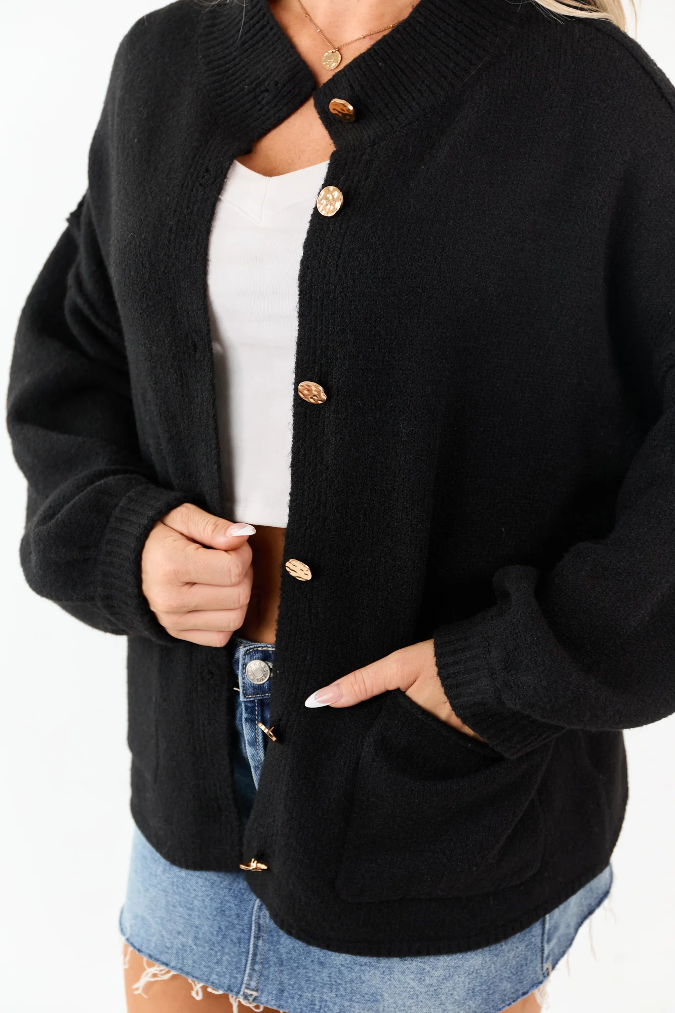 Indulge in the timeless elegance and cozy warmth of our Black Knit Wool Blend Cardigan with Gold Buttons. This classic cardigan, crafted from a luxurious wool blend, offers an oversized fit for comfort and style. Ideal for layering in cooler weather, it features stretchy soft knit fabric, exquisite gold buttons, front pockets, ribbed trim, and exposed seams. Elevate your wardrobe with this chic piece suitable for various occasions. Available in sizes S, M, and L.