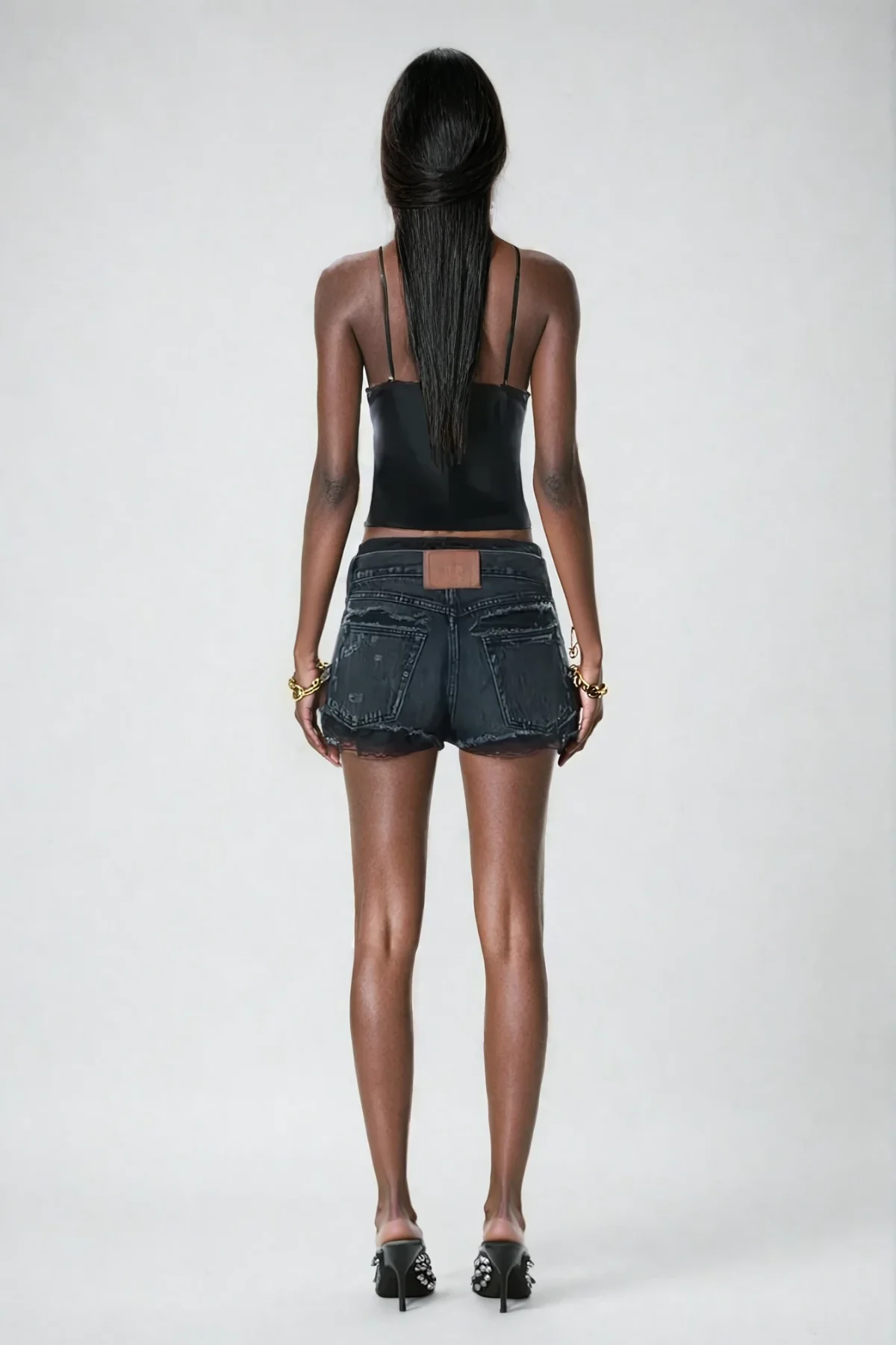 Upgrade your wardrobe with our highly stylish Aqila Lace Deconstruct Short Jeans in Black. Crafted with intricate lace detailing and a contemporary deconstructed design, these jeans blend elegance with versatility. Made of 50% Polyester and 50% Cotton, they are gentle machine washable. Experience the unique charm they add to any outfit. Note: Color variations may occur due to image lighting.
