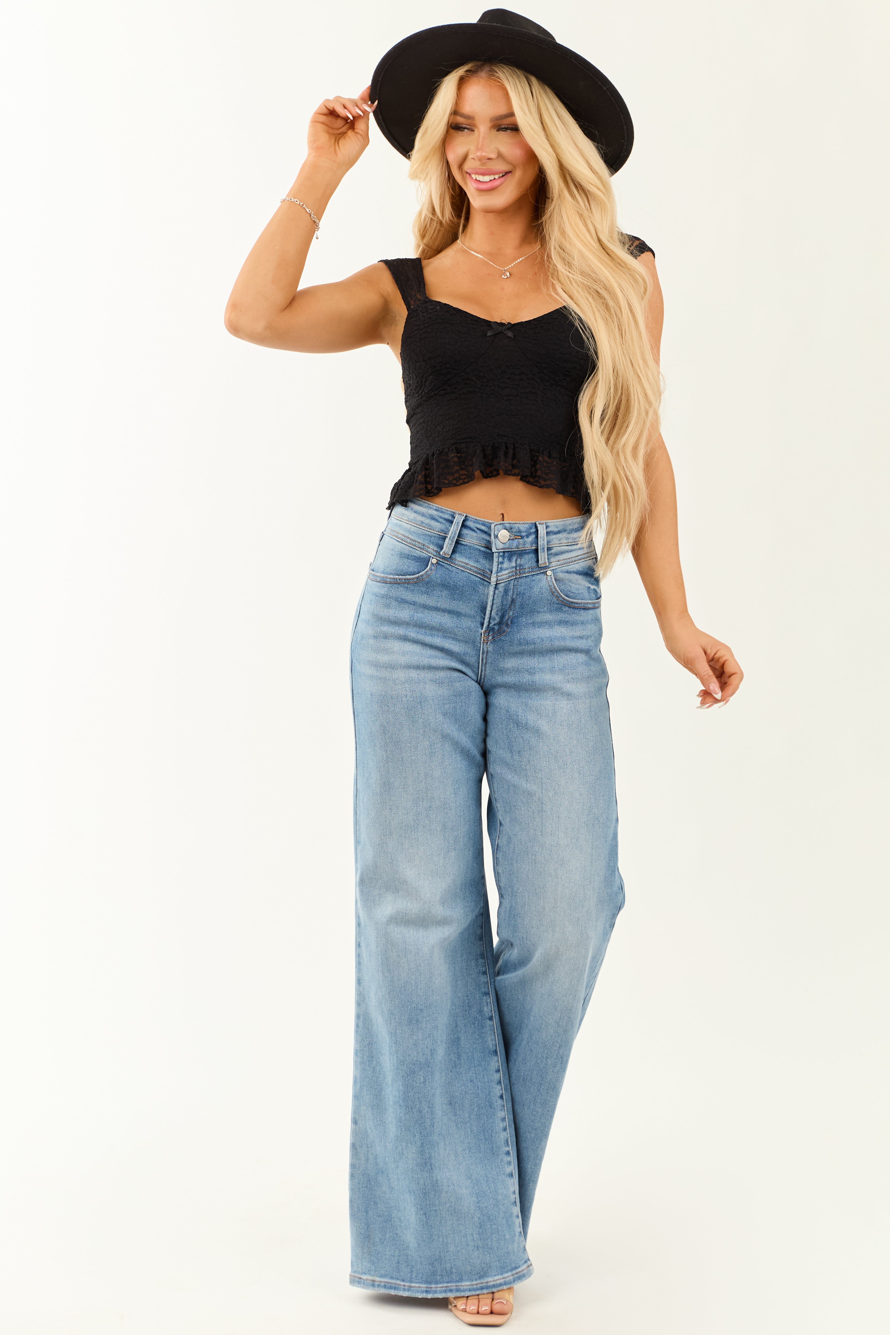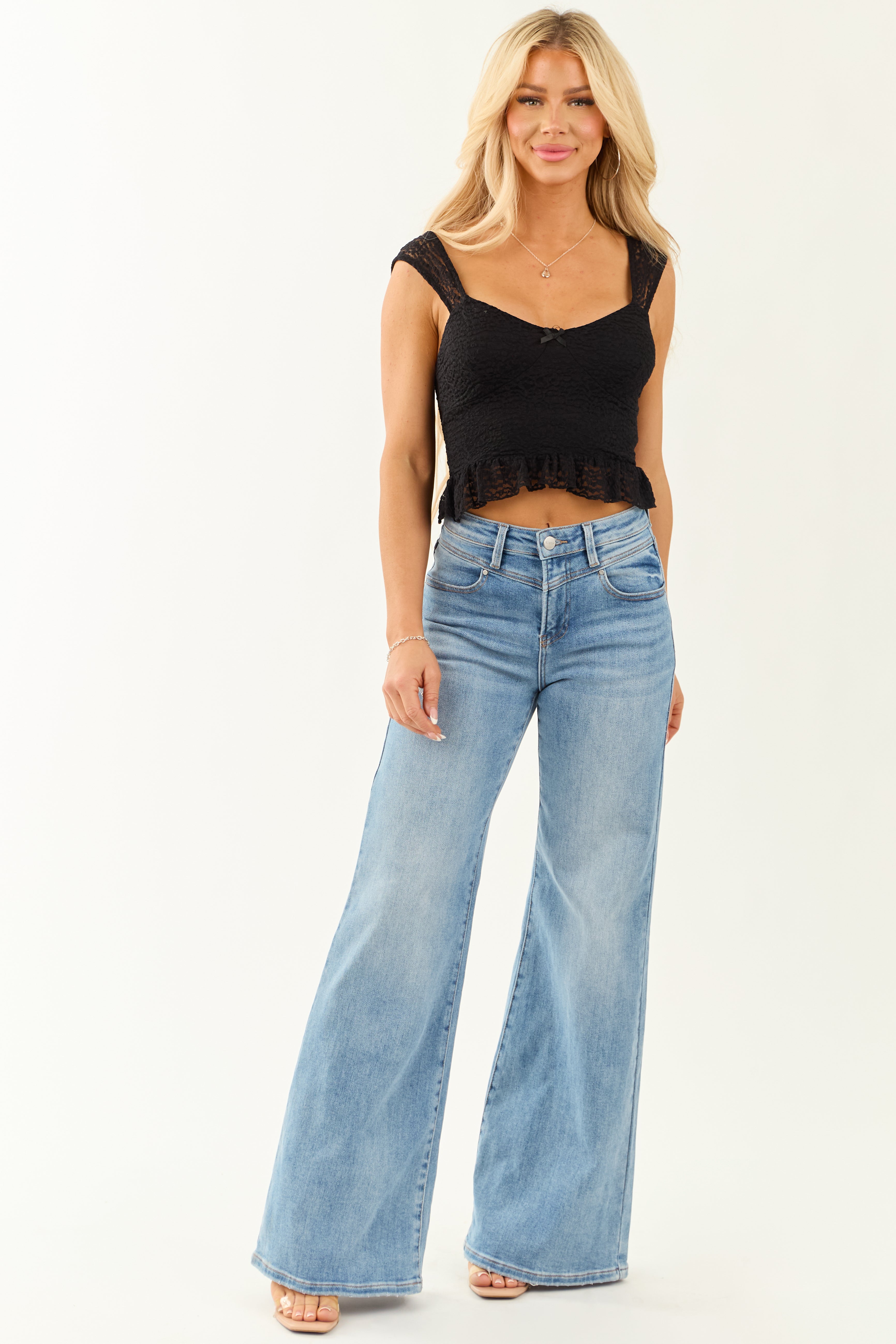 This stylish feminine tank top features elegant lace detailing, a flattering ruffle hem, and a bow detail on the bust for added charm. The stretchy lace fabric offers comfort and style, while the semi-cropped length and sheer back add a touch of sophistication. Stay cool and chic in this versatile top suitable for various occasions. Available in sizes S, M, and L. Ideal for everyday wear or special events, this tank pairs effortlessly with your favorite bottoms. Embrace your style with confidence and grace in this wardrobe essential. Make a statement with this piece .